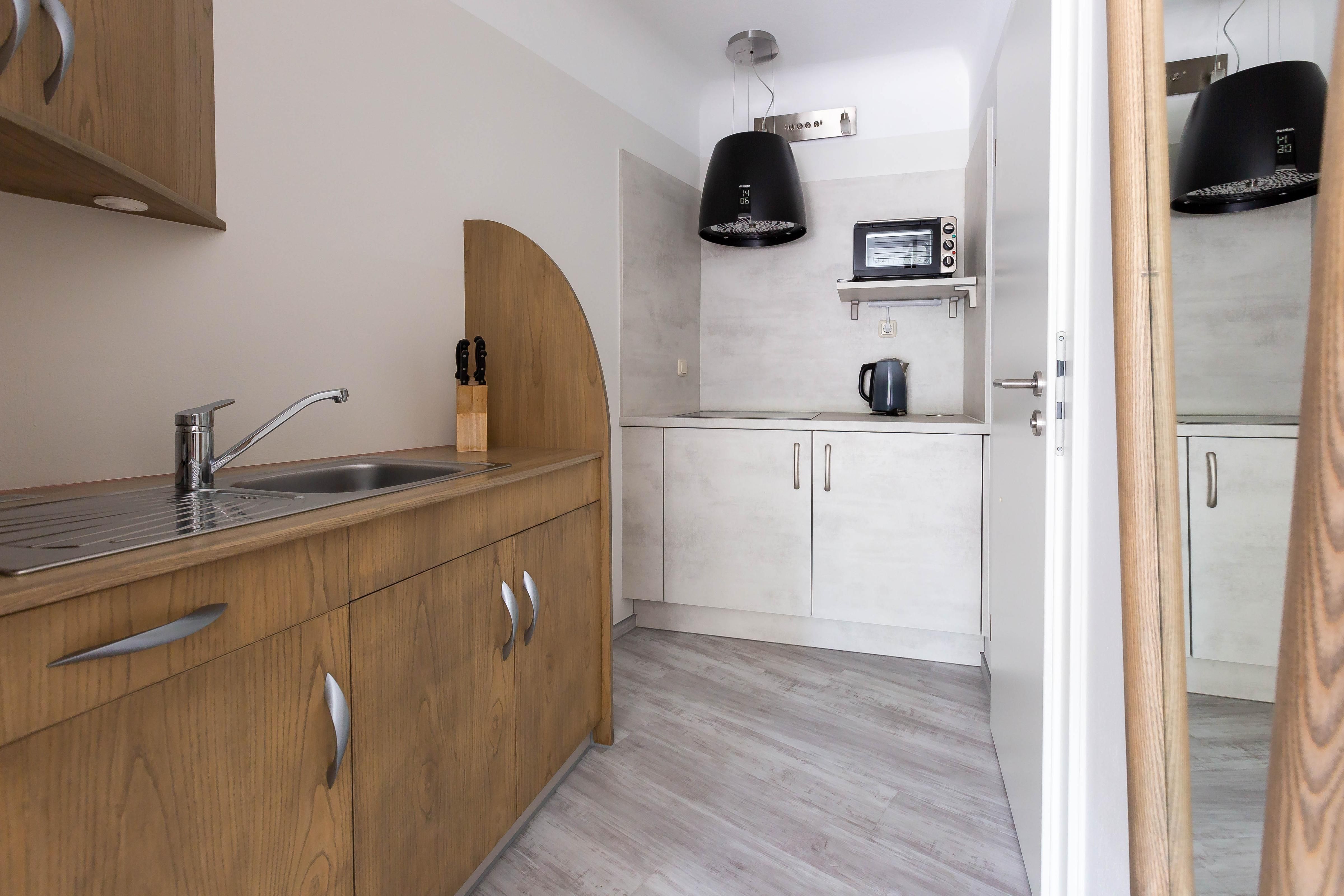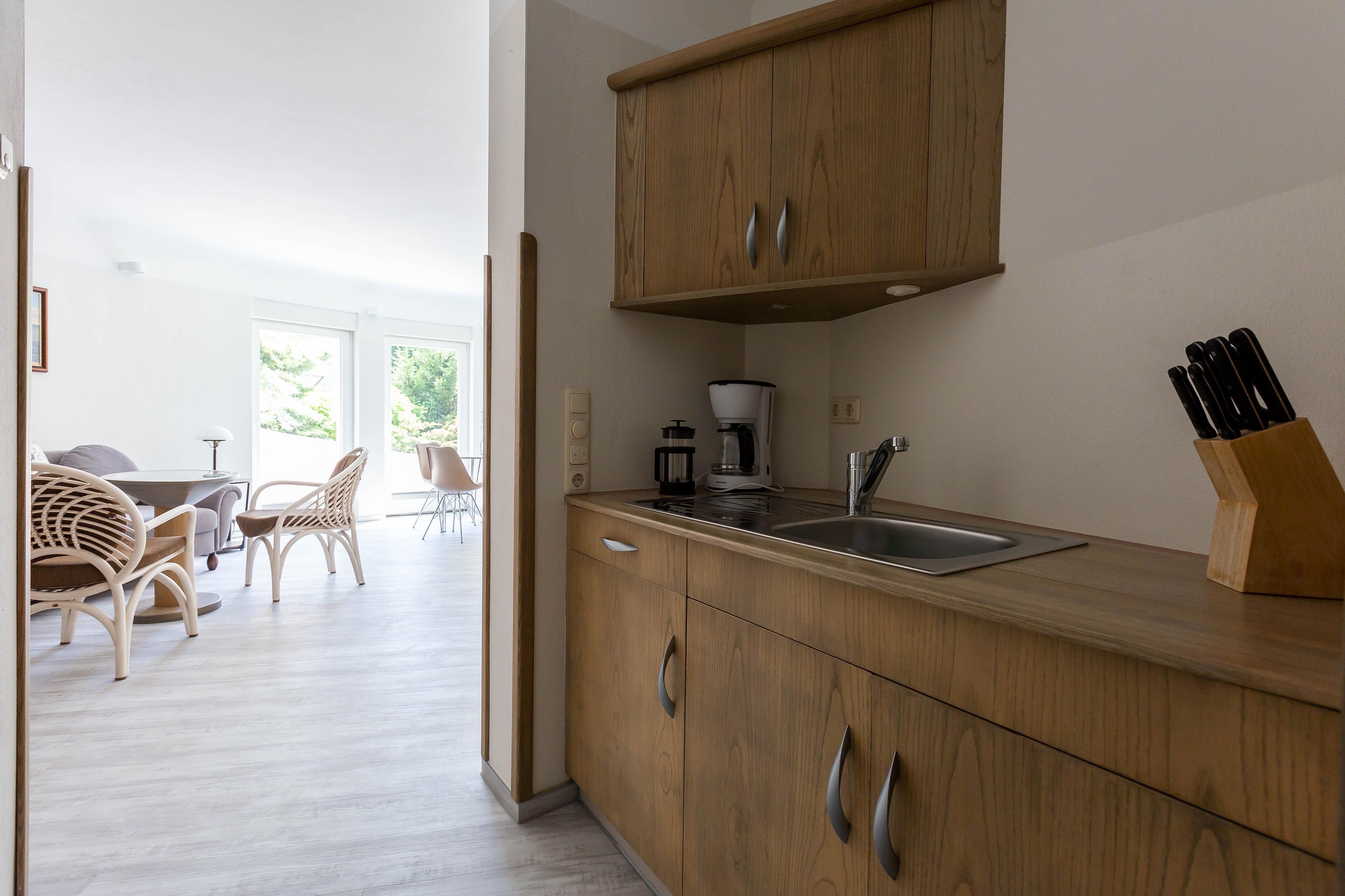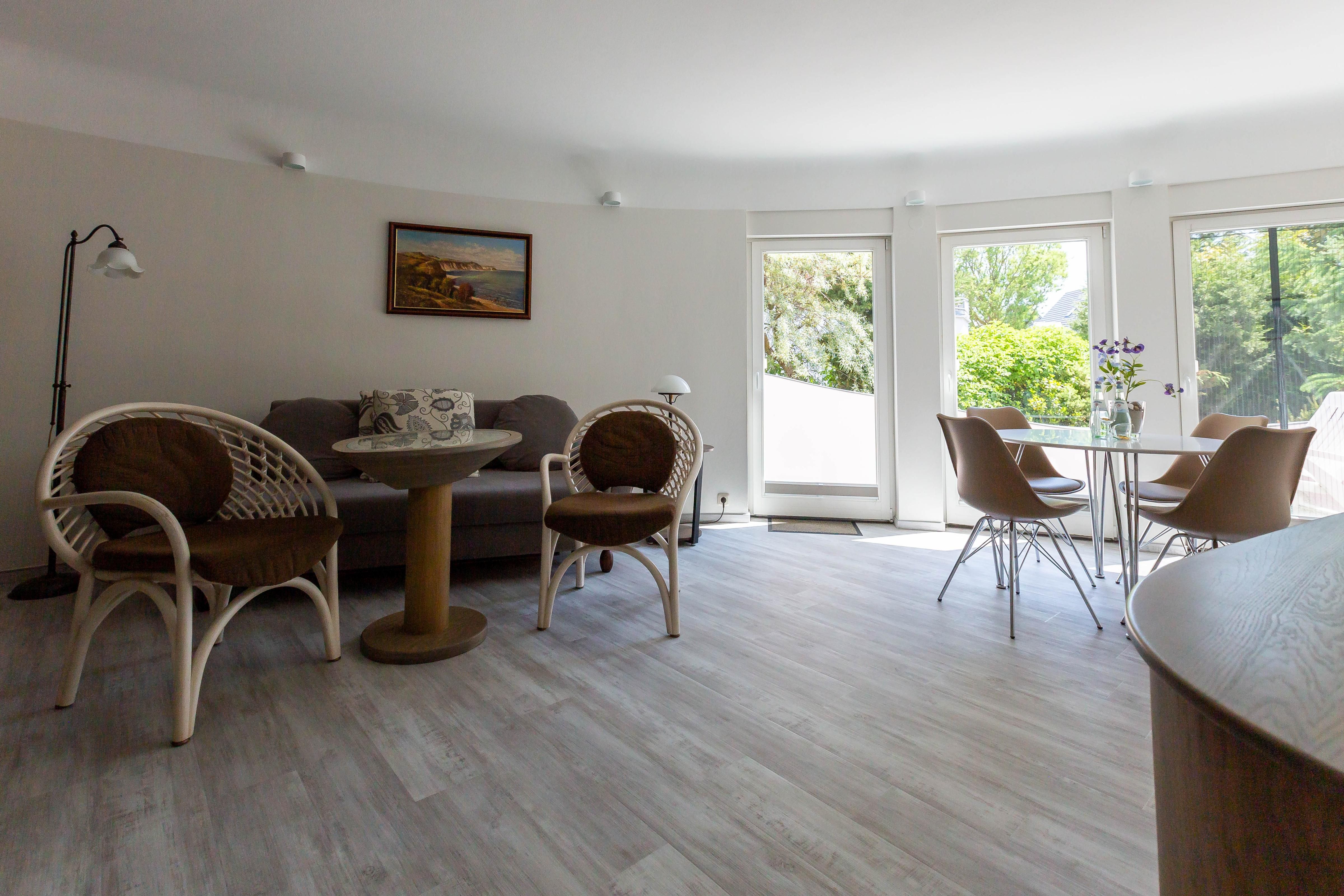 Im Außenbereich steht dir eine kleine sonnige Terrasse mit Tisch und Stühlen zur Verfügung, die von beiden Räumen aus betreten werden kann. Dank der heimischen Pflanzen, die die Terrasse umgeben, kannst du hier ungestört sein, dein Essen unter freiem Himmel genießen oder den Urlaubstag bei einem lauschigen Sommerabend ausklingen lassen. Zur Ferienwohnung gehört außerdem ein PKW-Stellplatz.