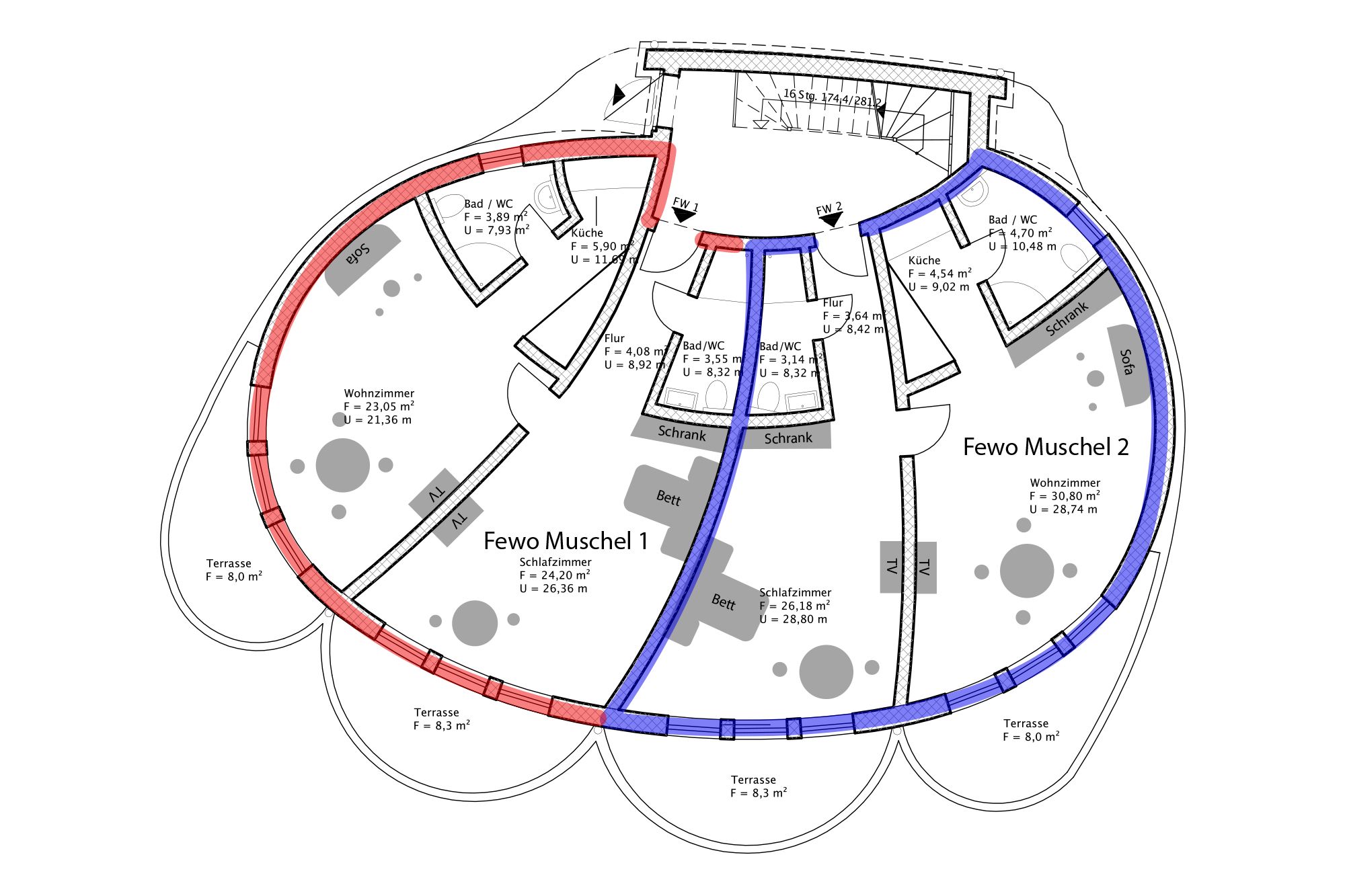 Die Unterkunft „Muschel 2“ befindet sich im Erdgeschoss des Hauses. Großzügige Räume, helle Farben und modernes Mobiliar machen diese Ferienwohnung zu einem besonderen Urlaubsdomizil. Vom Flur mit Garderobe kommst du direkt in das erste Schlafzimmer, dass mit einem großen Doppelbett, Kleiderschrank, Sitzgelegenheit, TV und bodentiefen Fenstern ausgestattet ist. Auch ein Badezimmer mit Dusche und WC kannst du vom Flur aus betreten. Durch eine Tür gelangst du in den großzügigen Wohn- und Schlafbereich. Die vollausgestattete Küchenzeile ist offen integriert und lädt mit Herd, Backofen, Geschirrspüler und Essbereich zum Kochen und Klönen ein. Das gemütliche Sofa kann ausgezogen werden und bietet mit 160 cm Liegefläche einen komfortablen Schlafplatz für bis zu zwei Personen. Abgerundet wird die neu modernisierte Ferienwohnung durch ein zweites Bad mit Dusche und WC.