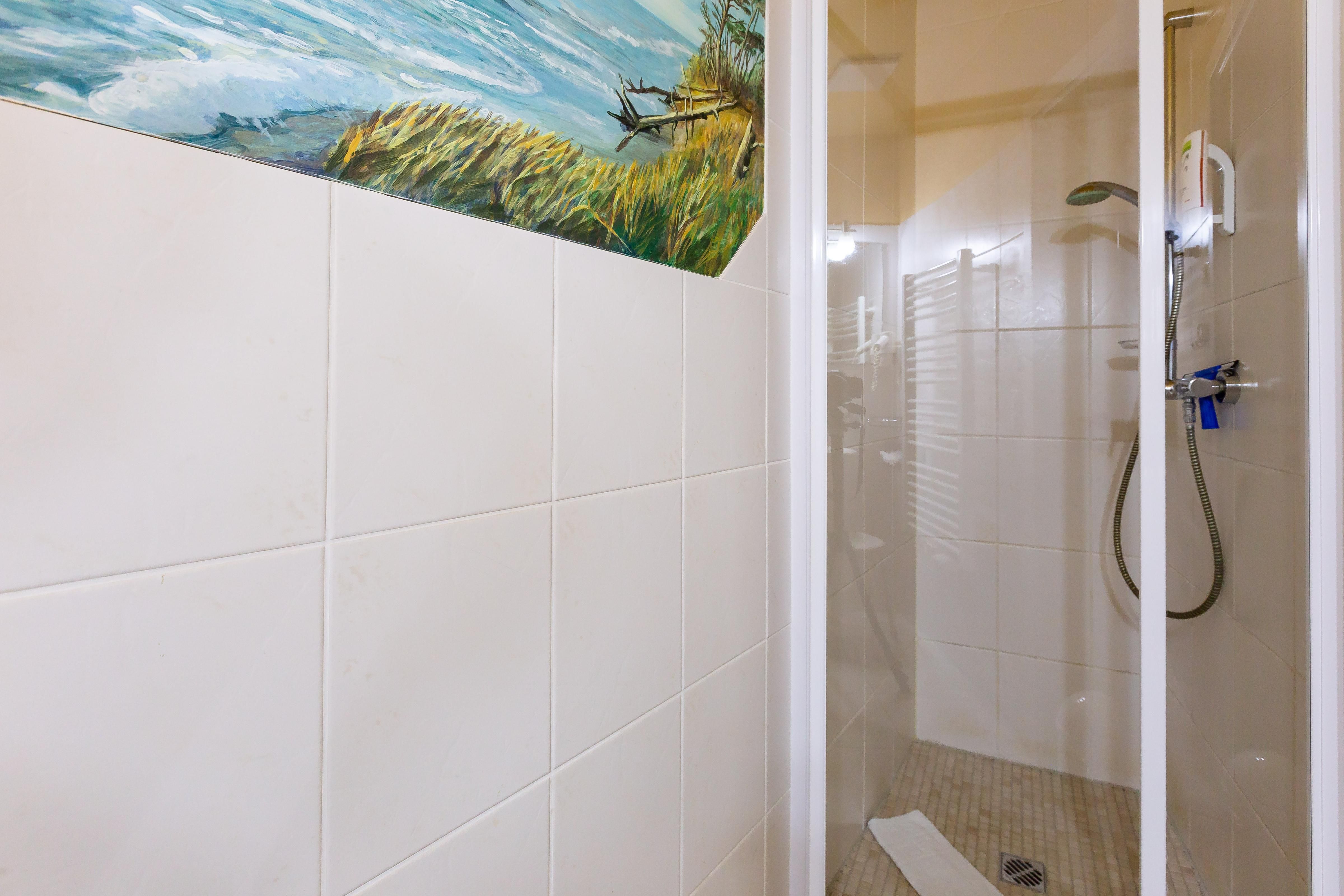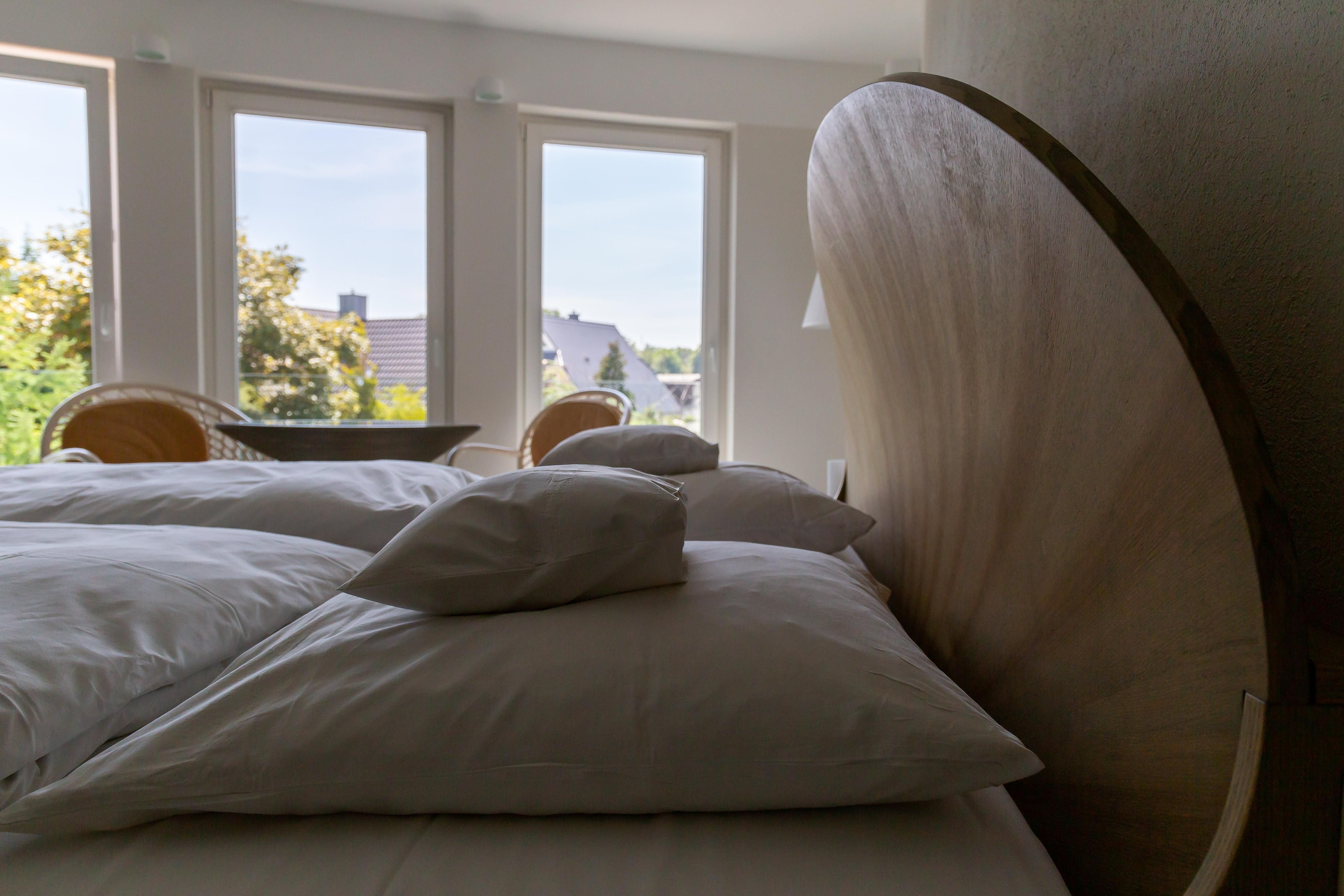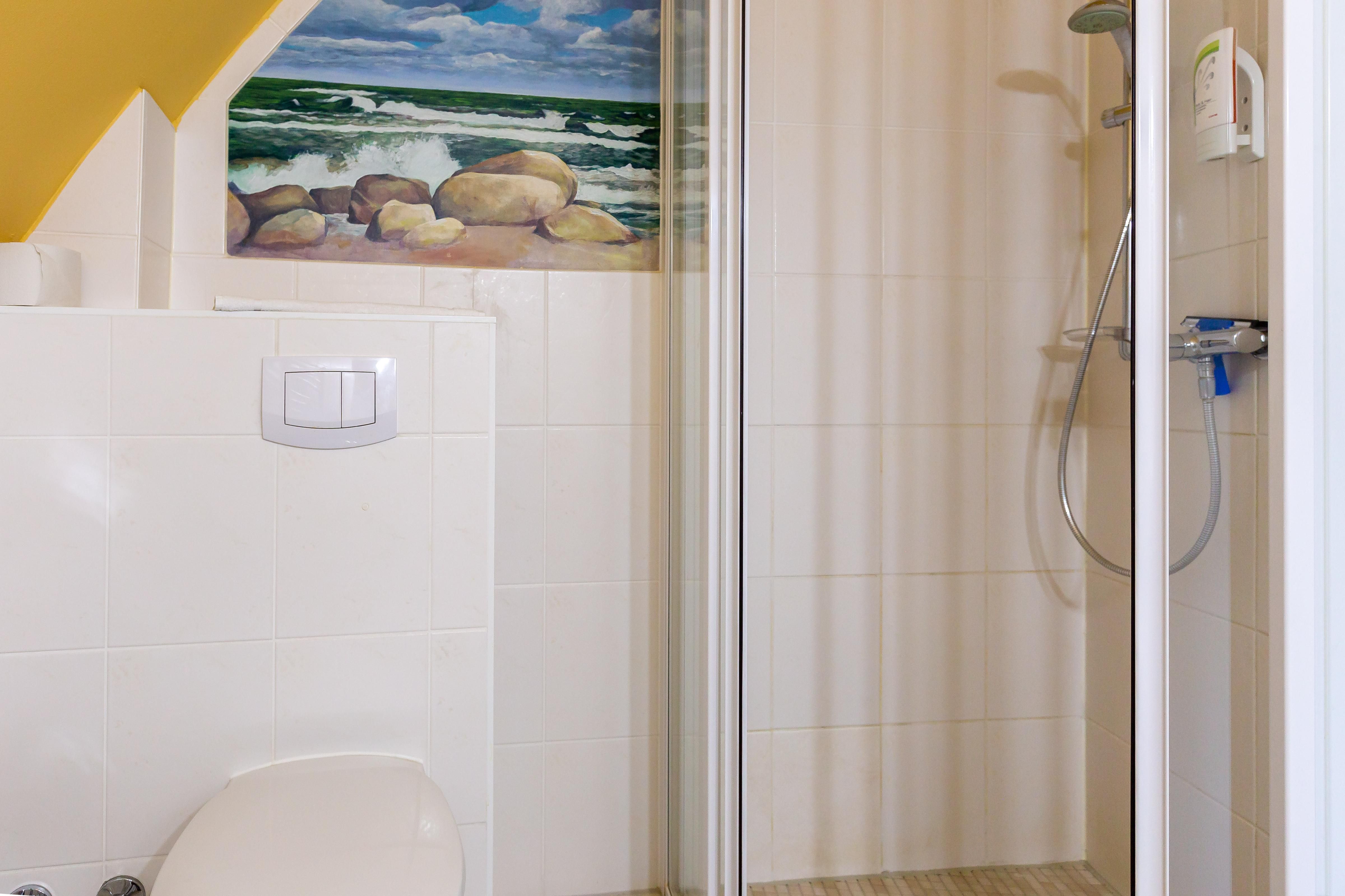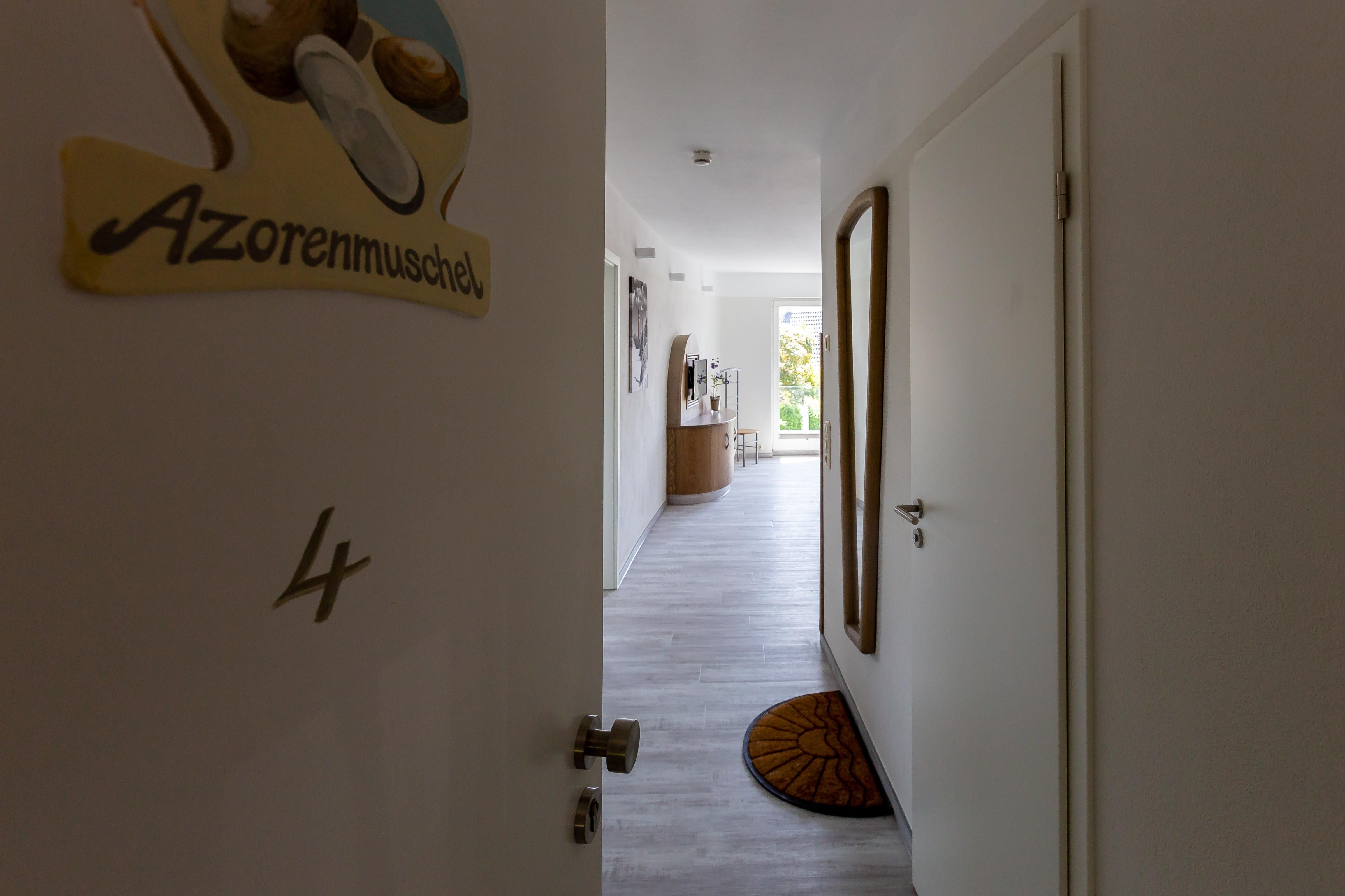 Die Unterkunft „Muschel 4“ befindet sich im ersten Obergeschoss. Großzügige Räume, helle Farben und modernes Mobiliar machen diese Ferienwohnung zu einem besonderen Urlaubsdomizil. Vom Flur mit Garderobe kommst du direkt in das erste Schlafzimmer, dass mit einem großen Doppelbett, Kleiderschrank, Sitzgelegenheit, TV und bodentiefen Fenstern ausgestattet ist. Auch ein Badezimmer mit Dusche und WC kannst du vom Flur aus betreten. Durch eine Tür gelangst du in den großzügigen Wohn- und Schlafbereich. Die vollausgestattete Küchenzeile ist offen integriert und lädt mit Herd, Backofen, Geschirrspüler und Essbereich zum Kochen und Klönen ein. Das gemütliche Sofa kann ausgezogen werden und bietet mit 160 cm Liegefläche einen komfortablen Schlafplatz für bis zu zwei Personen. Abgerundet wird die neu modernisierte Ferienwohnung durch ein zweites Bad mit Dusche und WC.