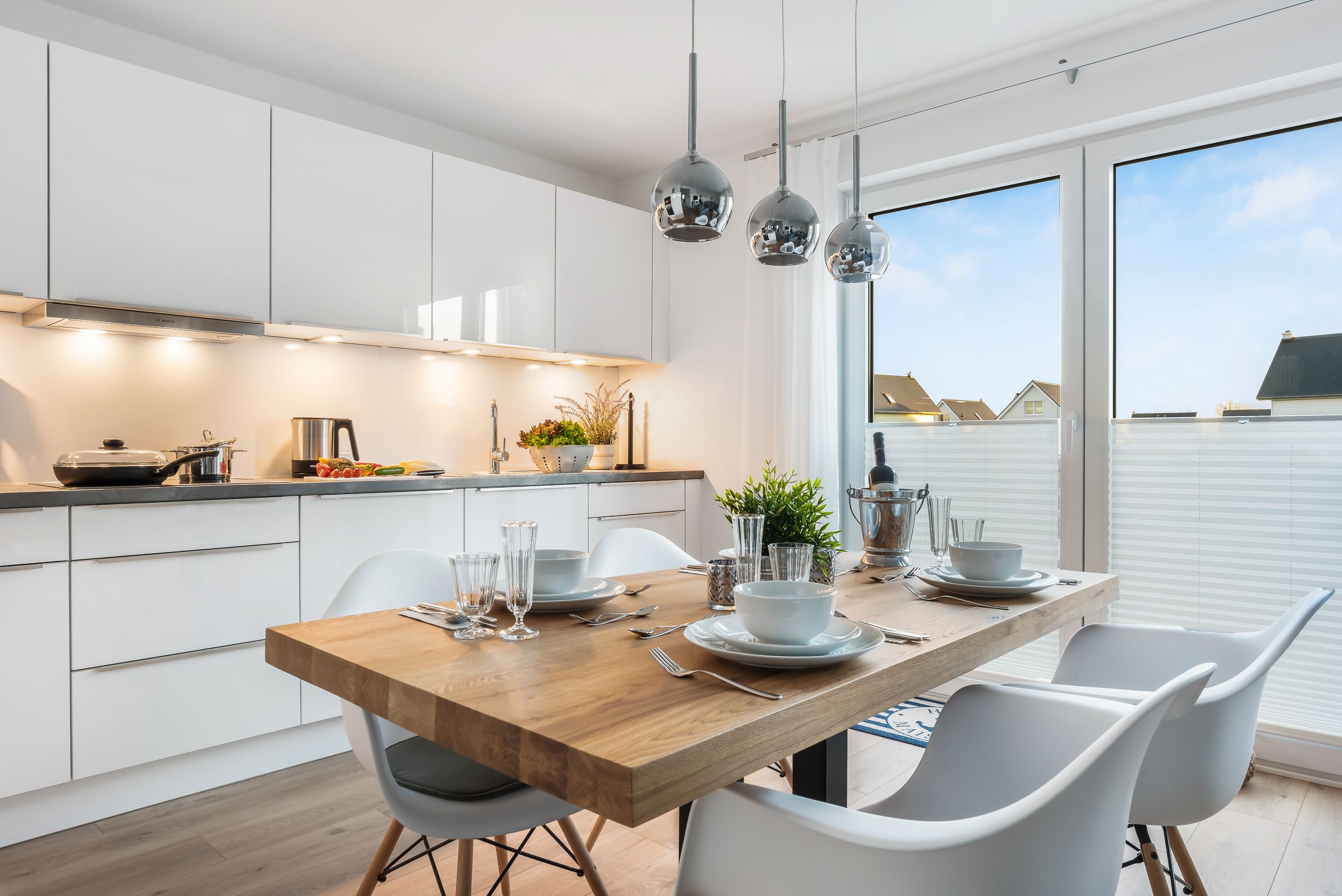 Der lichtdurchflutete Wohn- und Essbereich mit bodentiefen Fenstern und offener Küche lädt zu entspannten Stunden und geselligen Spielabenden ein. Machen Sie es sich auf der Couch oder in den zwei gemütlichen Sesseln vor dem Smart-TV bequem und genießen Sie den Luxus einer Fußbodenheizung und die gemütliche wärme des Kaminofens.