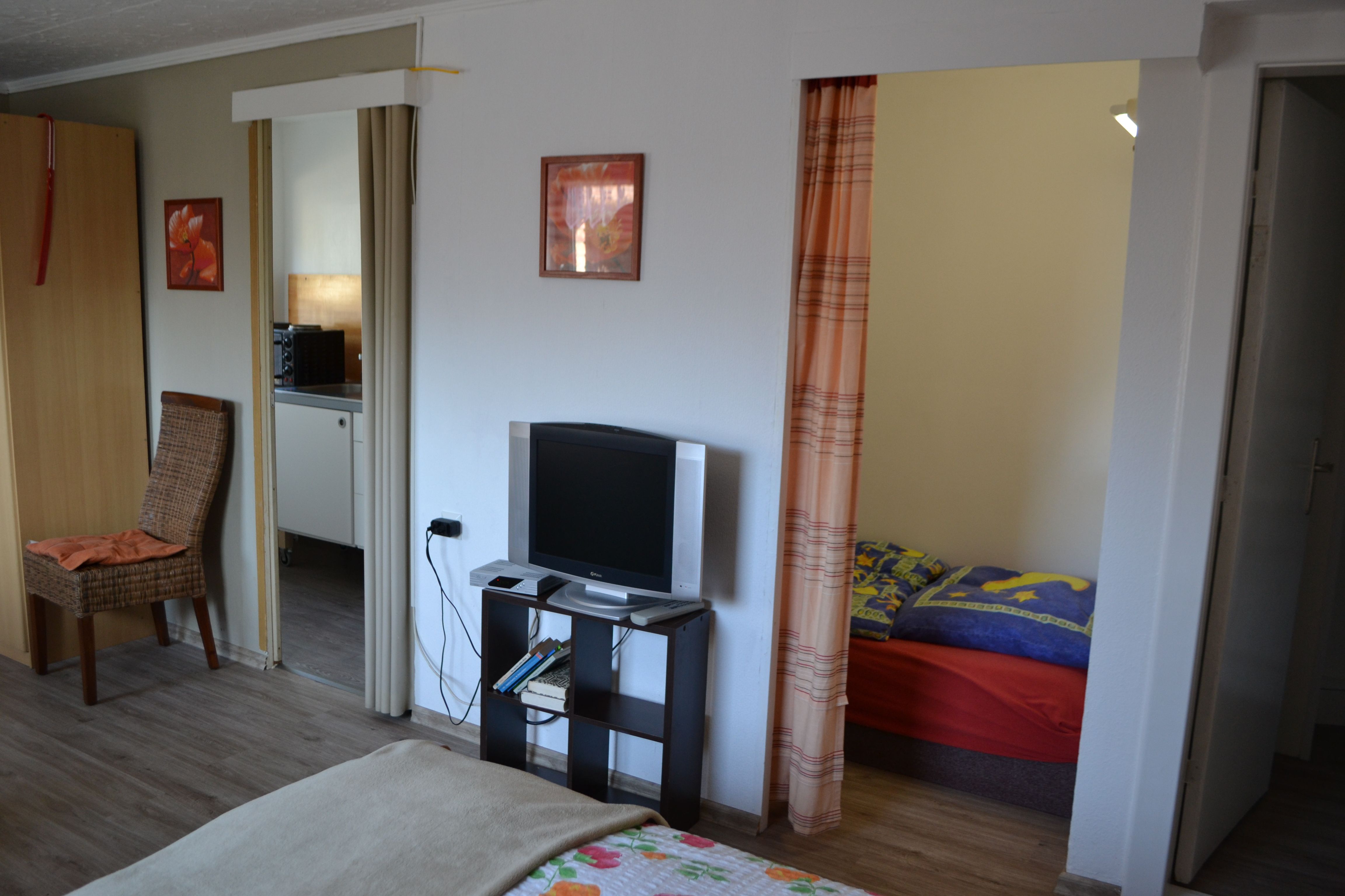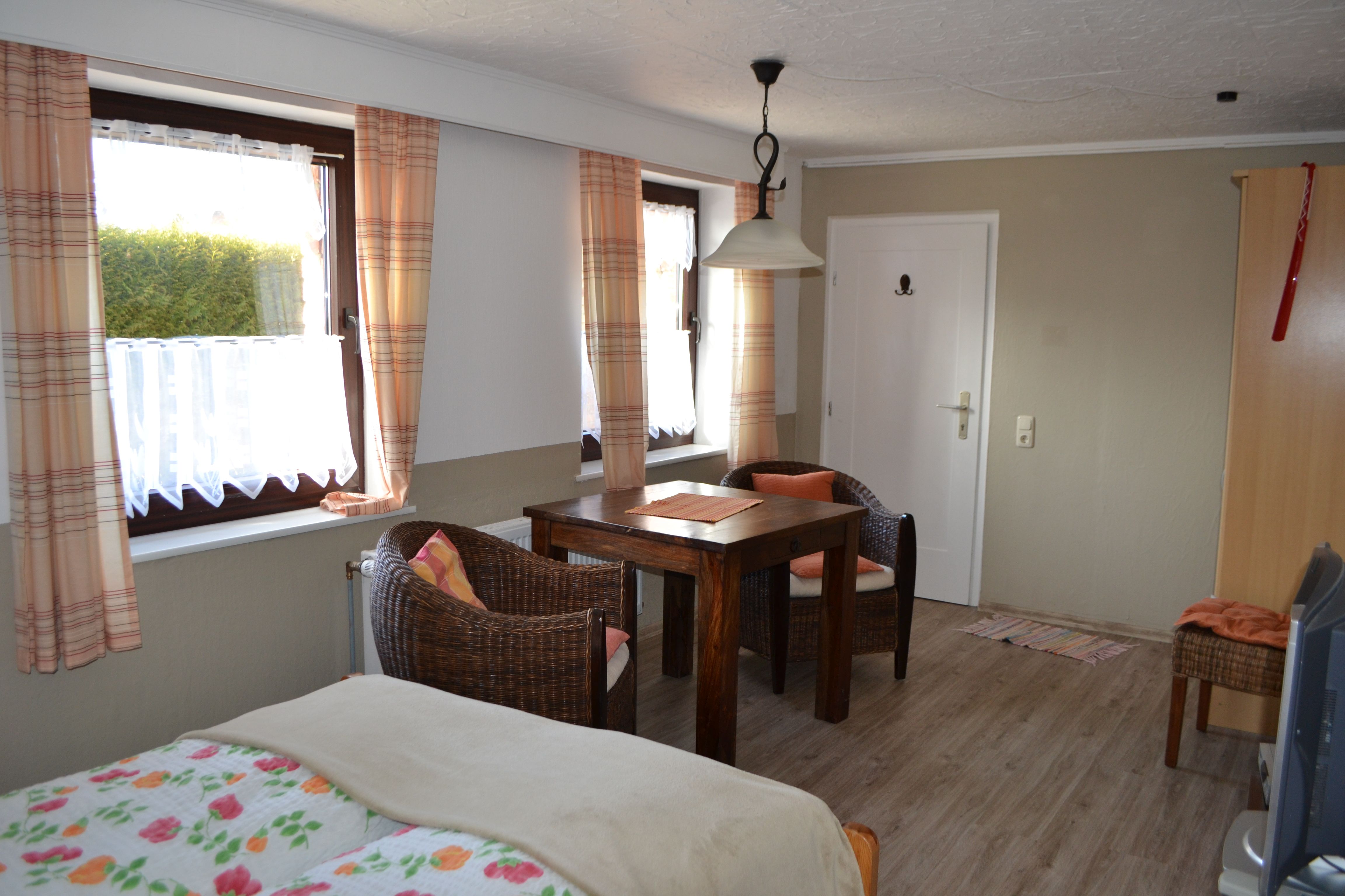 Wohnraum mit Sessel, Esstisch, SAT-TV und Doppelbett (140 x 200 cm)