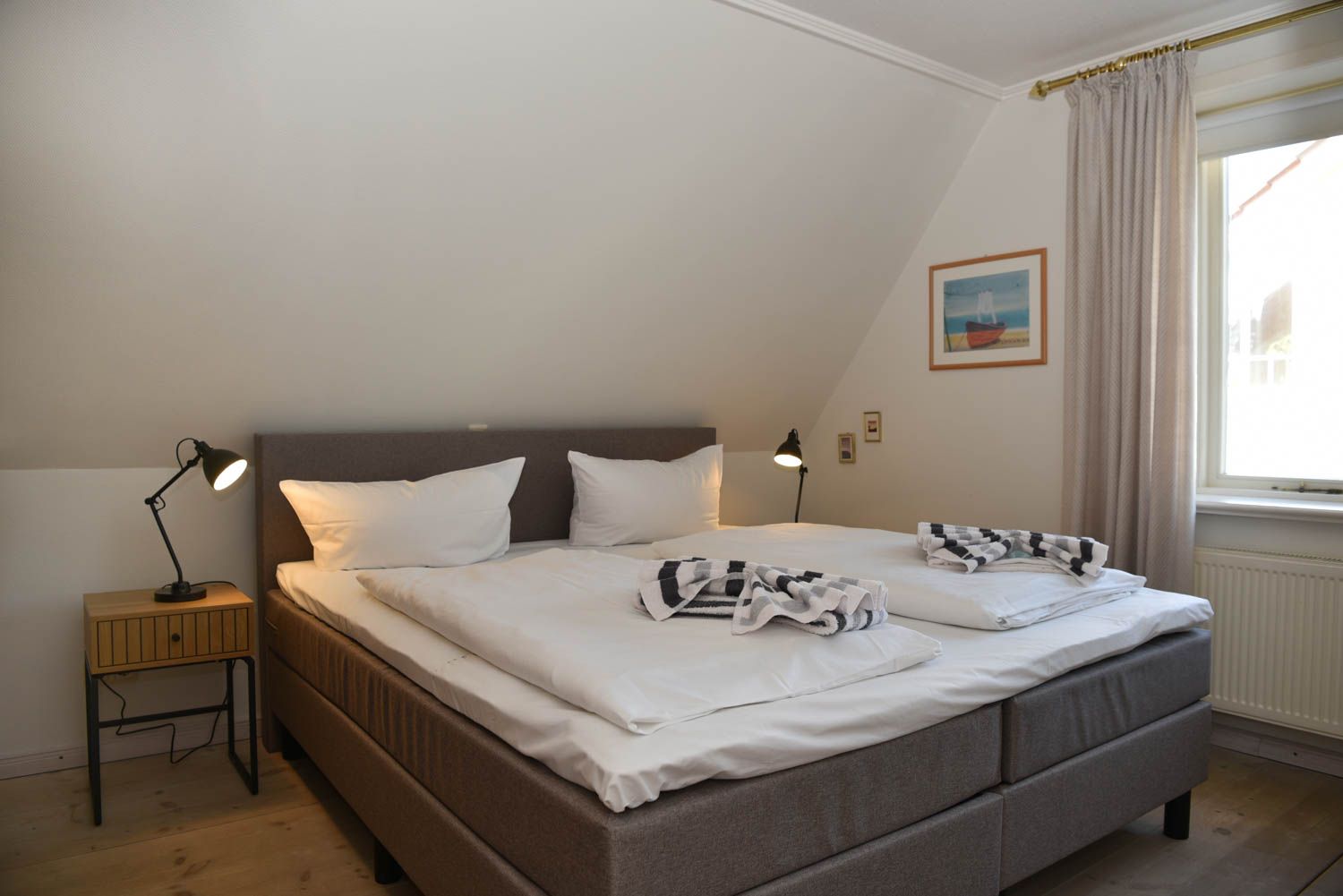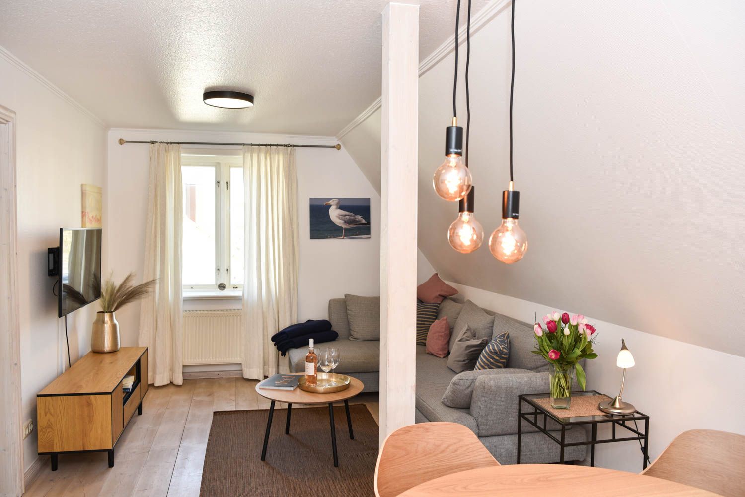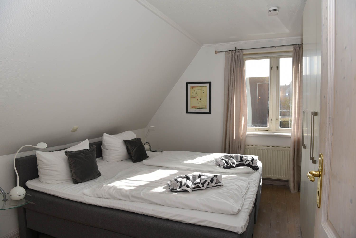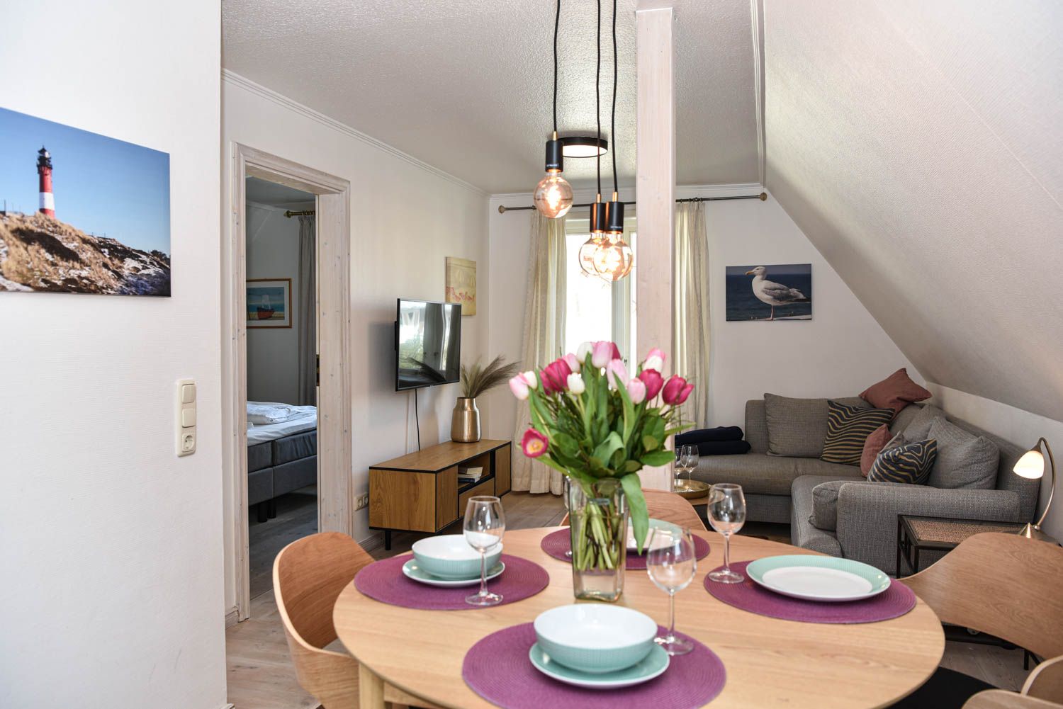Moin, moin, herzlich Willkommen, mitten im besonders maritimen Urlaubsglück. Diese 3-Zimmer-Ferienwohnung "Oberleutnant“ liegt im Haus "Admiral" und nur einen kurzen Fußweg vom Westerländer Strandübergang an der Friesischen Straße entfernt. Jede Menge Meer ist hier also inklusive, in dem liebevoll ausgestatteten Ferienappartement für bis zu vier Personen im ersten Obergeschoss. Sonnig-lichtes Gelb sorgt für Atmosphäre und echtes Flair, genauso wie die teilweise freiliegenden Balken und die "hyggeligen" Schrägen, die Küche ist offen und natürlich voll ausgestattet bis hin zum Toaster und Messerblock. Die Lage ist für Liebhaber der Inselhauptstadt perfekt, das Zentrum ist so nah, dass man in wenigen Minuten zu Fuß hinkommt und weit genug weg, um Ruhe vom vergnügten Trubel der Saison zu genießen. Sagten wir schon, dass der Strand Luftlinie nur gut 500 Meter entfernt ist? Bei Westwind hören Sie also vielleicht sogar leichtes Meeresrauschen nachts.