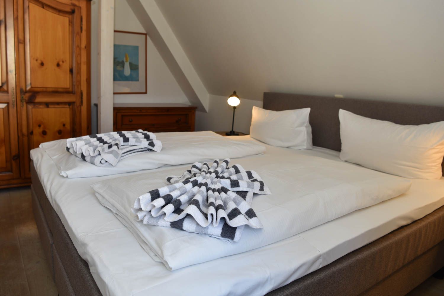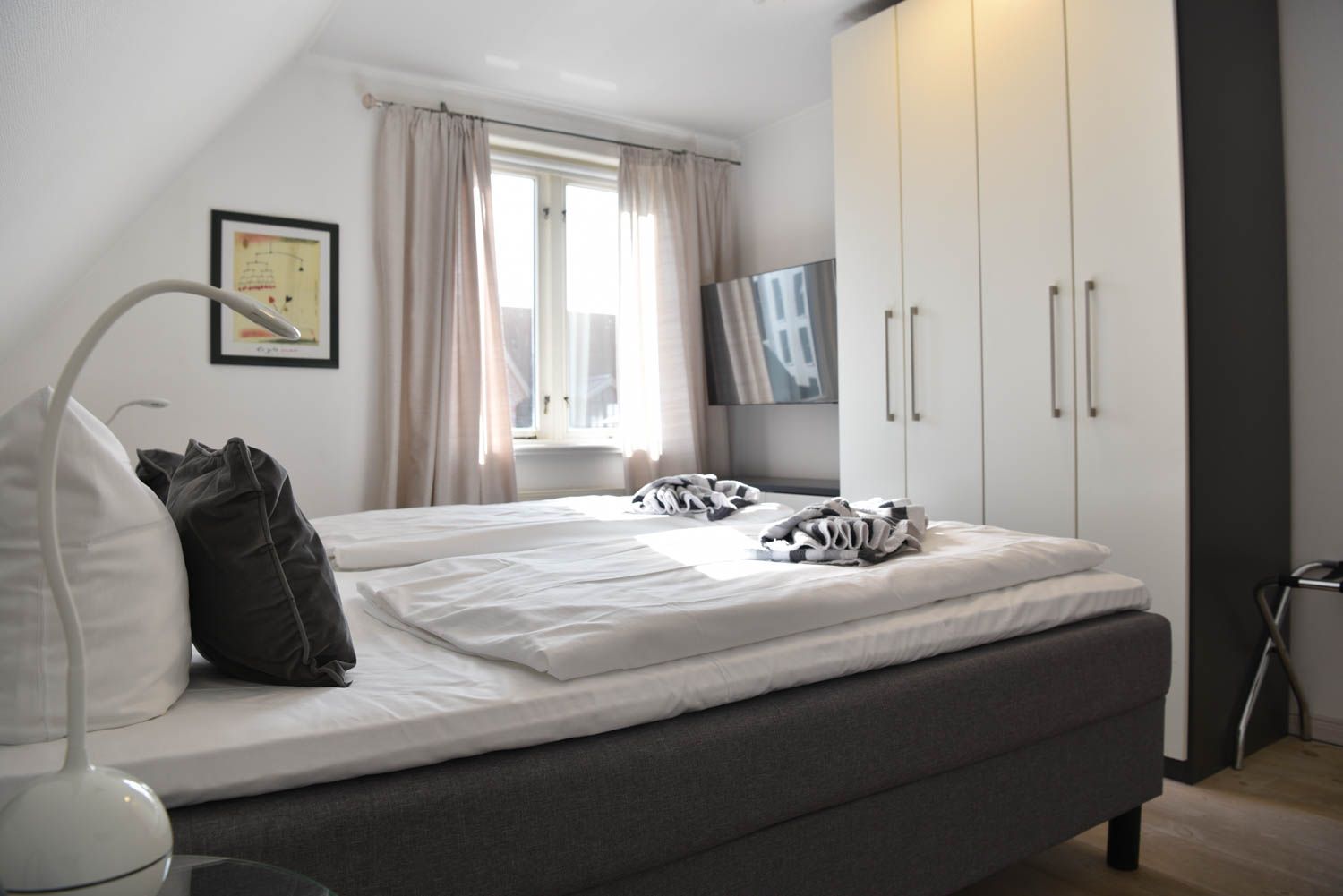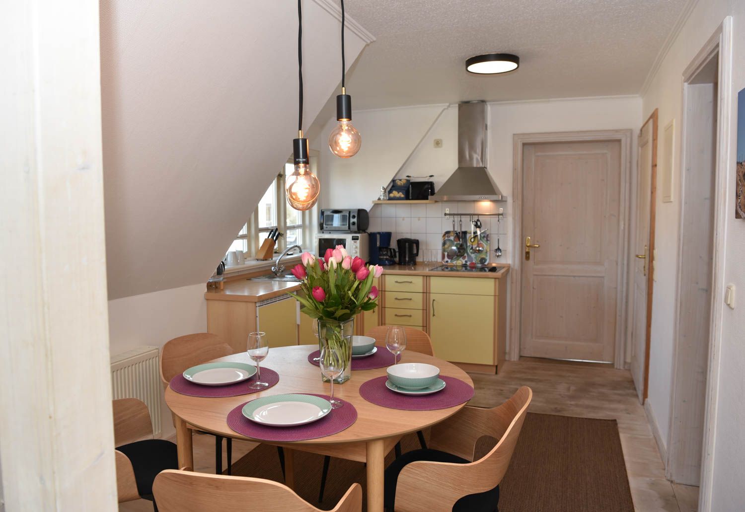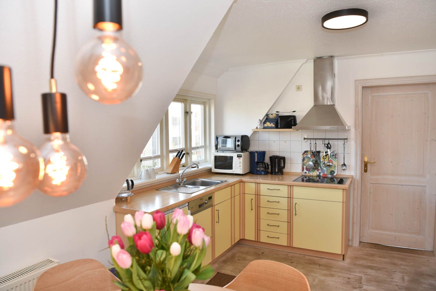 Moin, moin, herzlich Willkommen, mitten im besonders maritimen Urlaubsglück. Diese 3-Zimmer-Ferienwohnung "Oberleutnant“ liegt im Haus "Admiral" und nur einen kurzen Fußweg vom Westerländer Strandübergang an der Friesischen Straße entfernt. Jede Menge Meer ist hier also inklusive, in dem liebevoll ausgestatteten Ferienappartement für bis zu vier Personen im ersten Obergeschoss. Sonnig-lichtes Gelb sorgt für Atmosphäre und echtes Flair, genauso wie die teilweise freiliegenden Balken und die "hyggeligen" Schrägen, die Küche ist offen und natürlich voll ausgestattet bis hin zum Toaster und Messerblock. Die Lage ist für Liebhaber der Inselhauptstadt perfekt, das Zentrum ist so nah, dass man in wenigen Minuten zu Fuß hinkommt und weit genug weg, um Ruhe vom vergnügten Trubel der Saison zu genießen. Sagten wir schon, dass der Strand Luftlinie nur gut 500 Meter entfernt ist? Bei Westwind hören Sie also vielleicht sogar leichtes Meeresrauschen nachts.