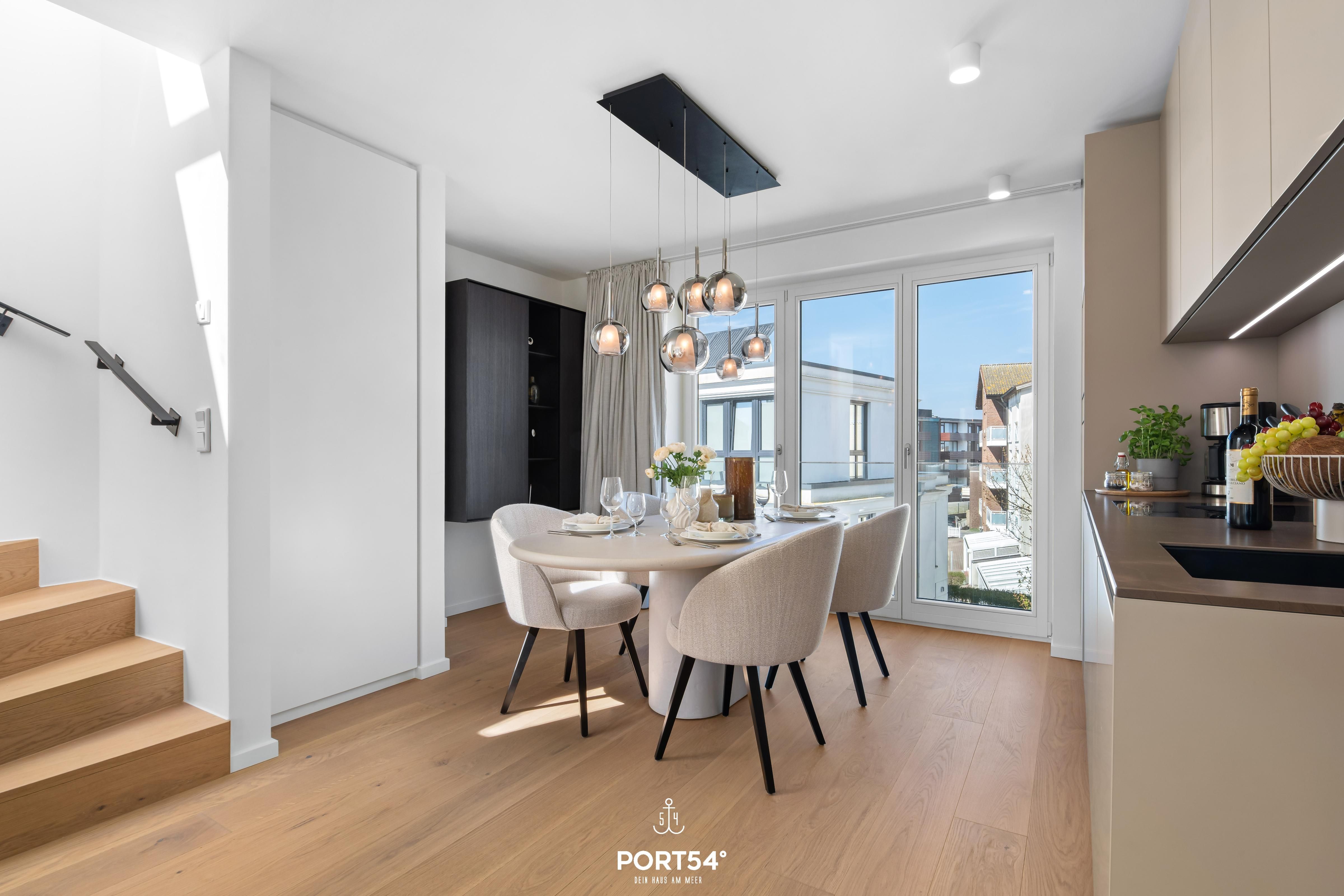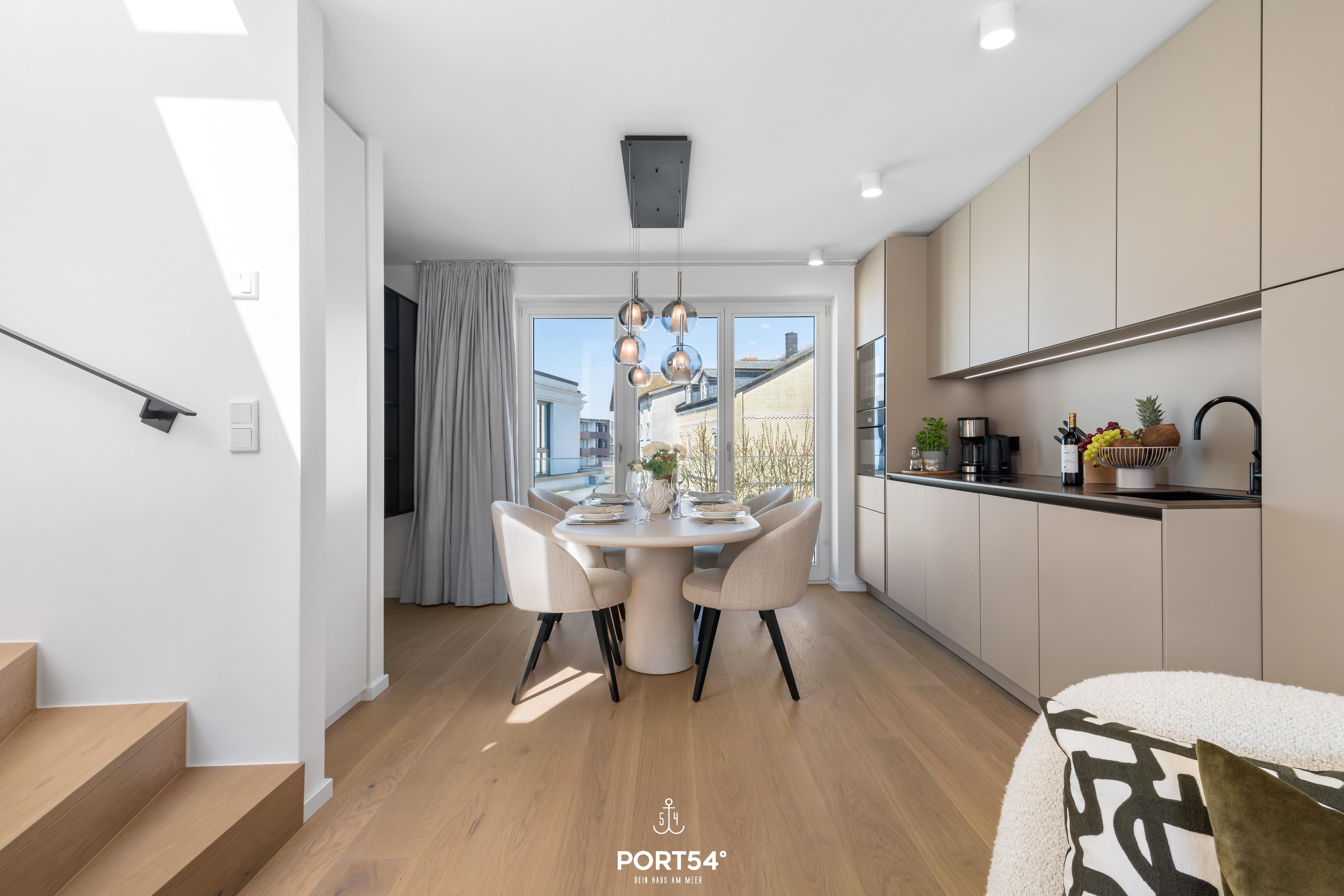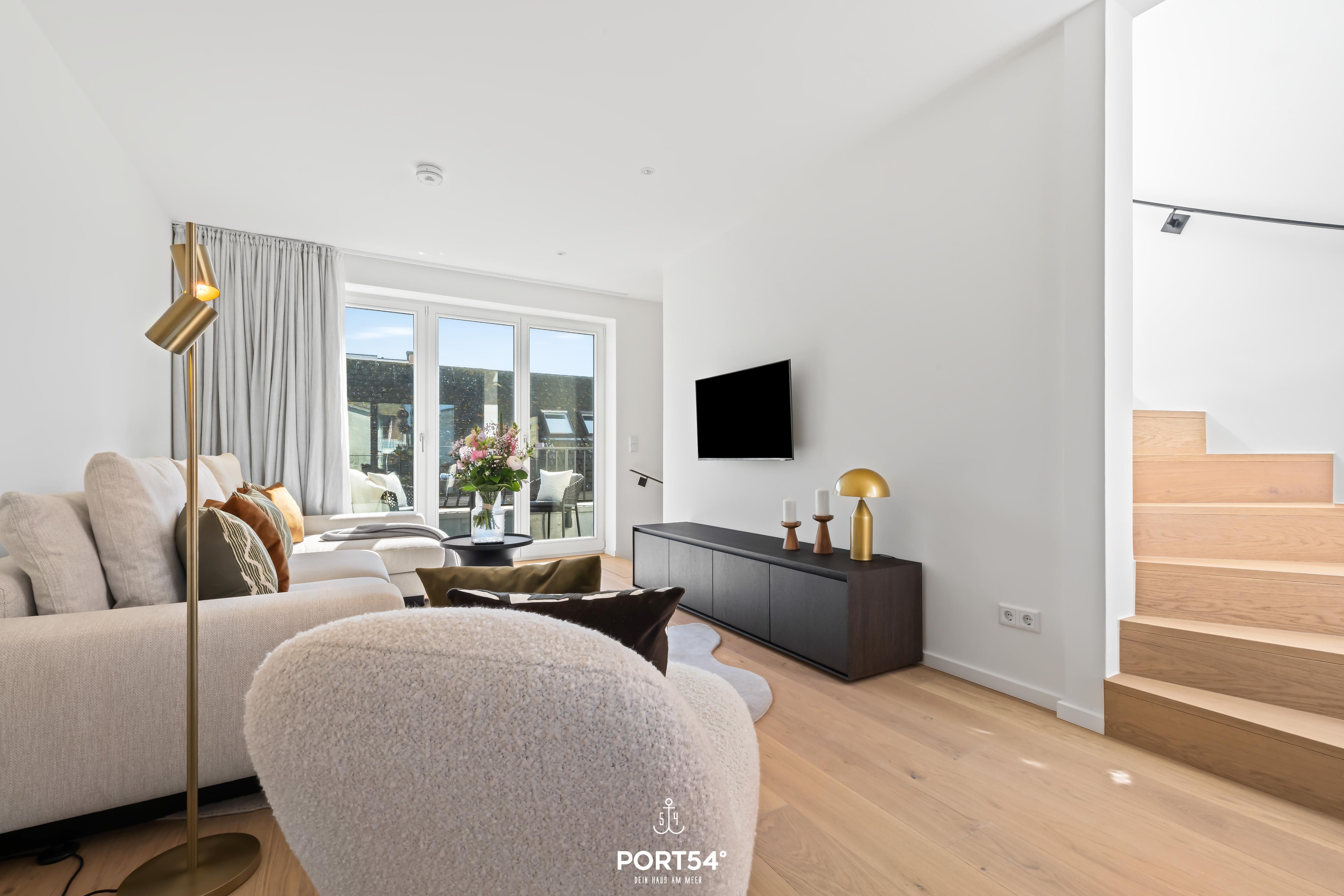 Das Luxus Maisonette Apartment bietet im 1. und 2. Obergeschoss Platz für bis zu drei Personen. Auf der ersten Etage erwarten Sie die beiden Schlafzimmer eins mit einem Doppelbett und eins mit Einzelbett, Flachbild-TV und Verdunkelungsmöglichkeiten, perfekt für Ihre Nachtruhe. Außerdem finden Sie auf der Etage das Master-Bad mit Doppelwaschbecken, Regendusche, Föhn und WC. Im zweiten Obergeschoss befindet sich der offene Wohn- und Essbereich mit vollausgestatteter Küche, Balkon und Zugang zur großen Dachterrasse. Hier haben Sie genug Platz um die frische Nordseeluft auf dem Dach zu genießen.