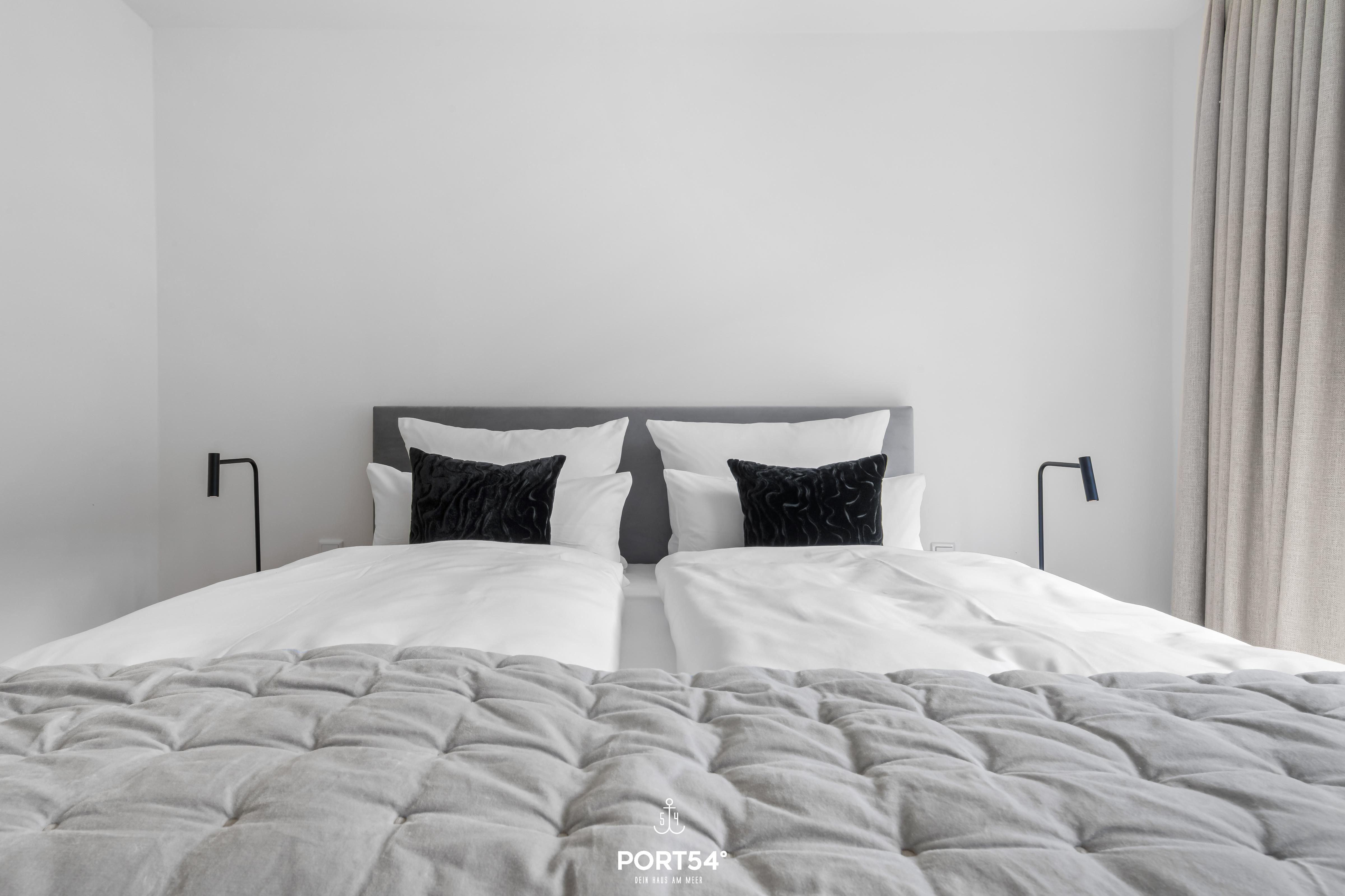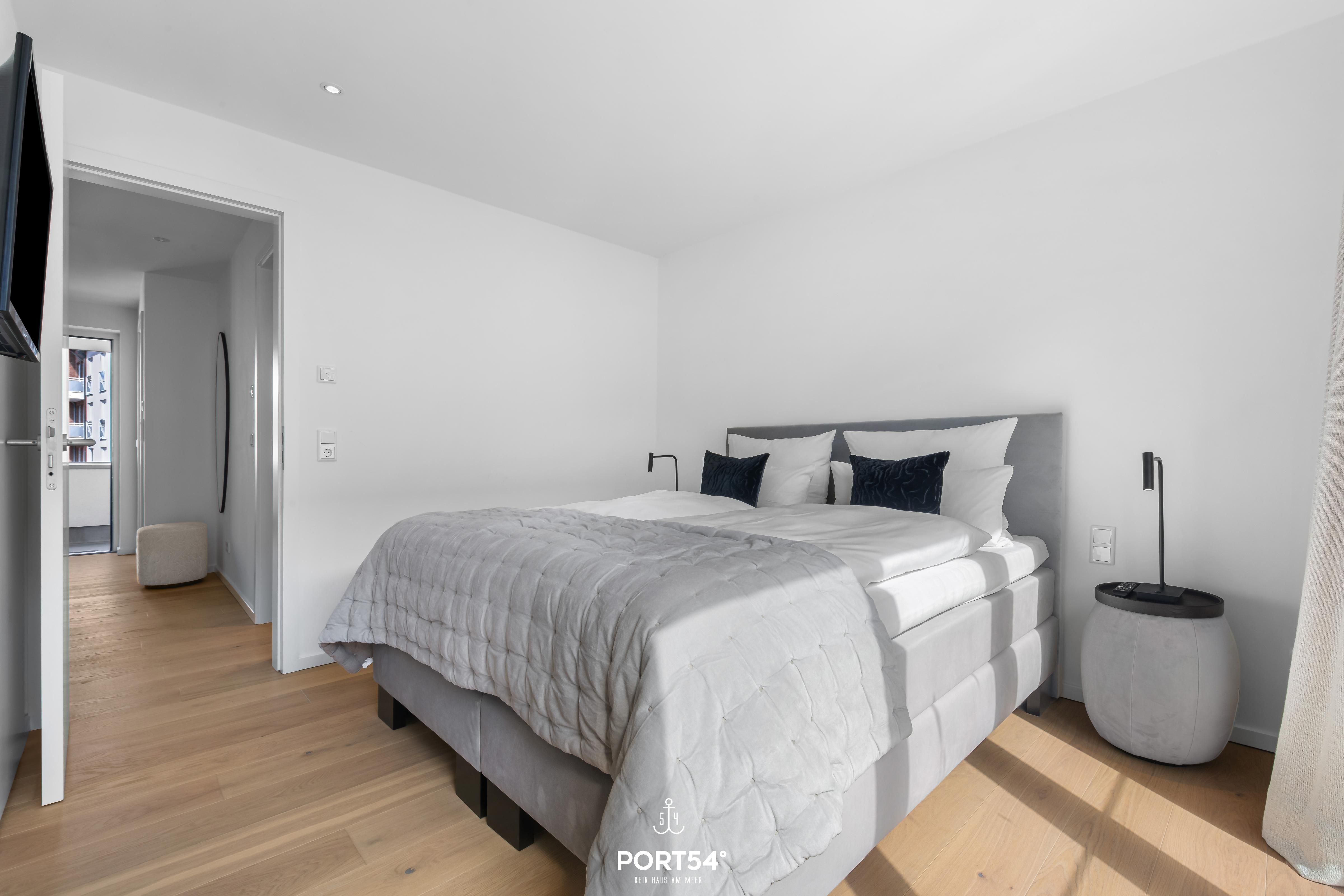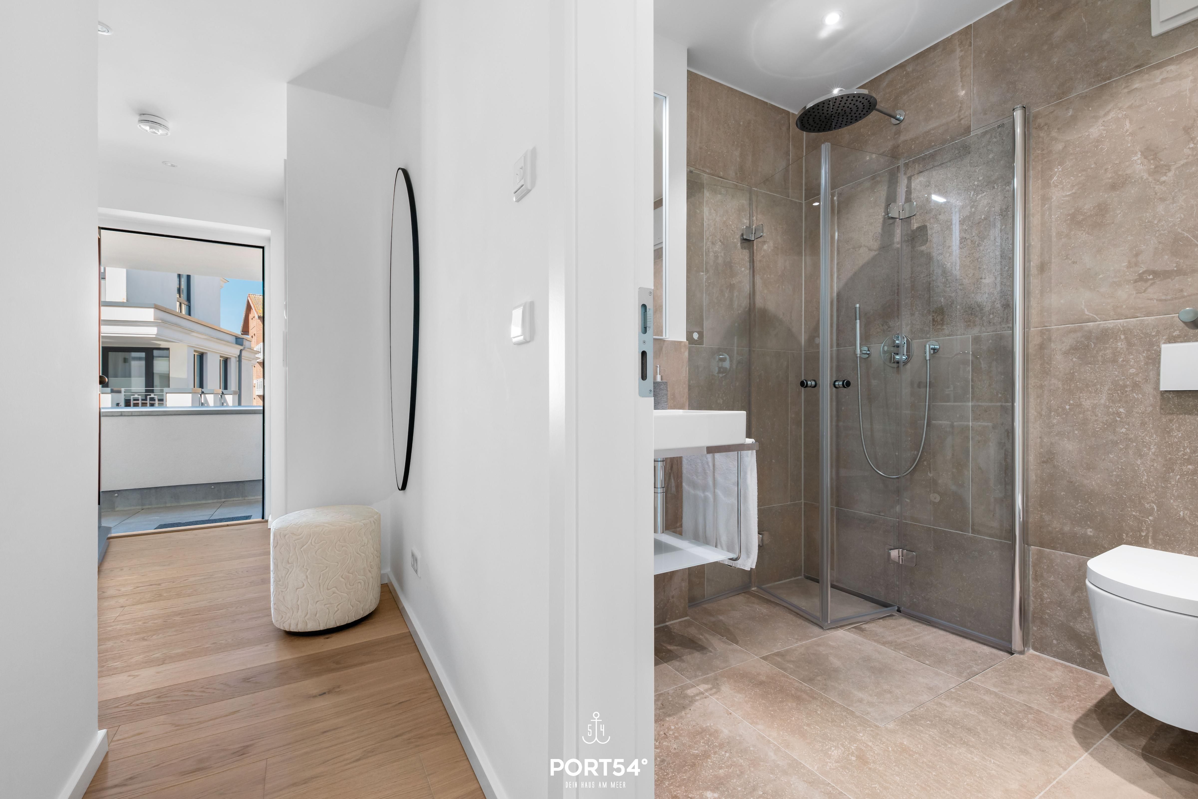 Das Luxus Maisonette Apartment bietet im 1. und 2. Obergeschoss Platz für bis zu drei Personen. Auf der ersten Etage erwarten Sie die beiden Schlafzimmer eins mit einem Doppelbett und eins mit Einzelbett, Flachbild-TV und Verdunkelungsmöglichkeiten, perfekt für Ihre Nachtruhe. Außerdem finden Sie auf der Etage das Master-Bad mit Doppelwaschbecken, Regendusche, Föhn und WC. Im zweiten Obergeschoss befindet sich der offene Wohn- und Essbereich mit vollausgestatteter Küche, Balkon und Zugang zur großen Dachterrasse. Hier haben Sie genug Platz um die frische Nordseeluft auf dem Dach zu genießen.
