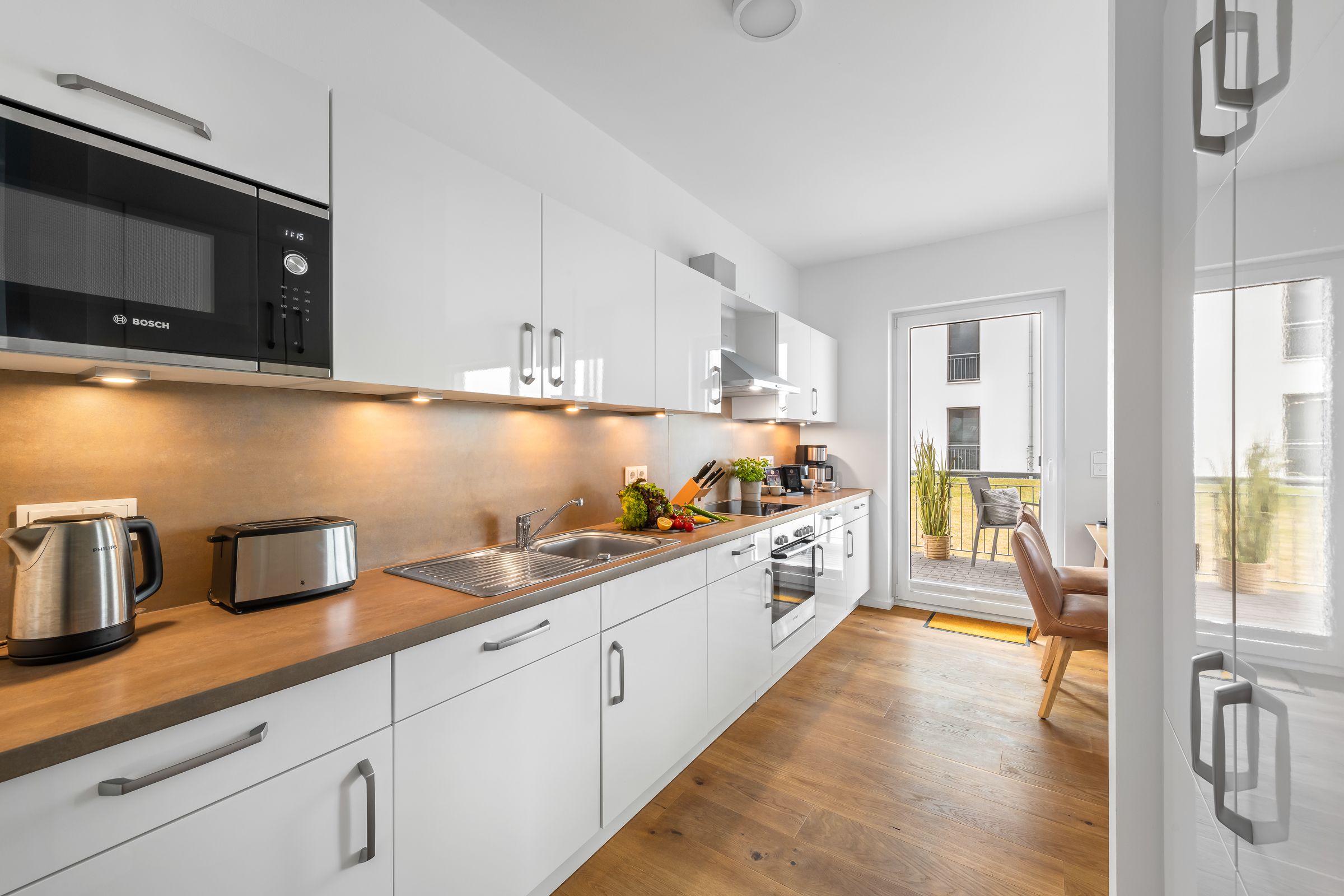 Der traumhafte Balkon bietet einen weiten Blick auf das Hafenkino, vorbeiziehenden Segelschiffe und Ausflugsdampfer. Eine hochwertige Sitzgarnitur sowie Sonnenliegen stehen bereit um erholsame Sonnenstunden zu genießen.