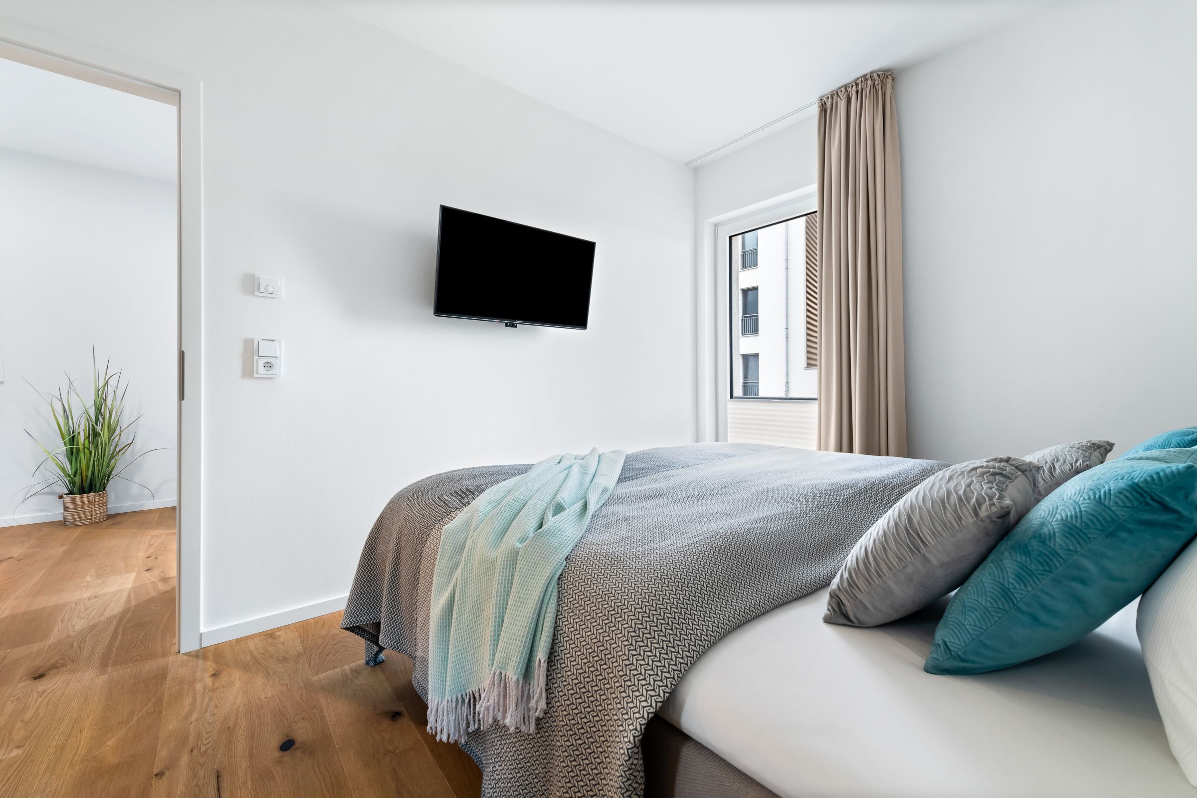 Das helle Schlafzimmer verfügt über ein hochwertiges Doppel-Boxspringbett, das für einen tiefen und erholsamen Schlaf sorgt. Das bodentiefe Fenster lässt sich durch Gardinen abdunkeln.