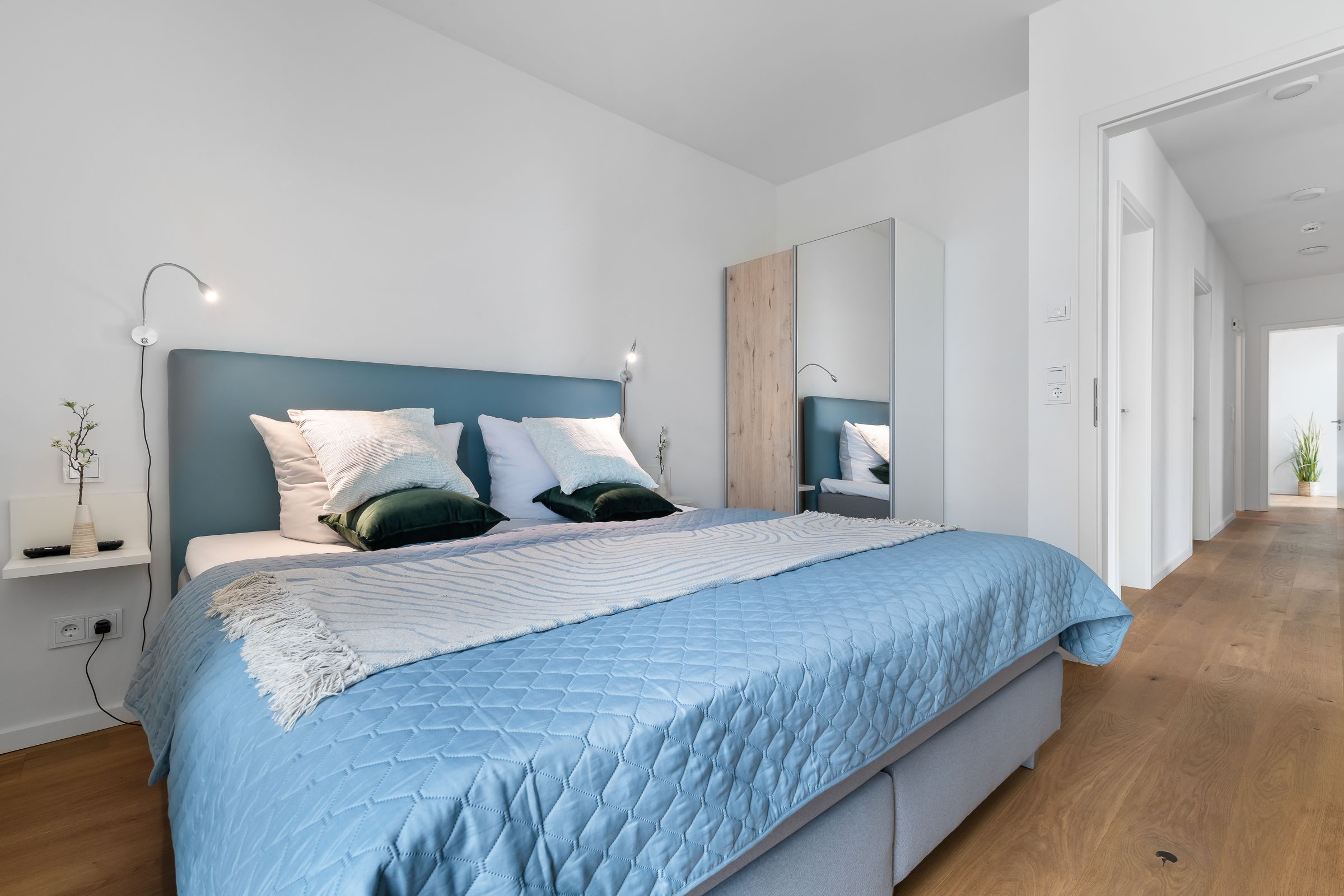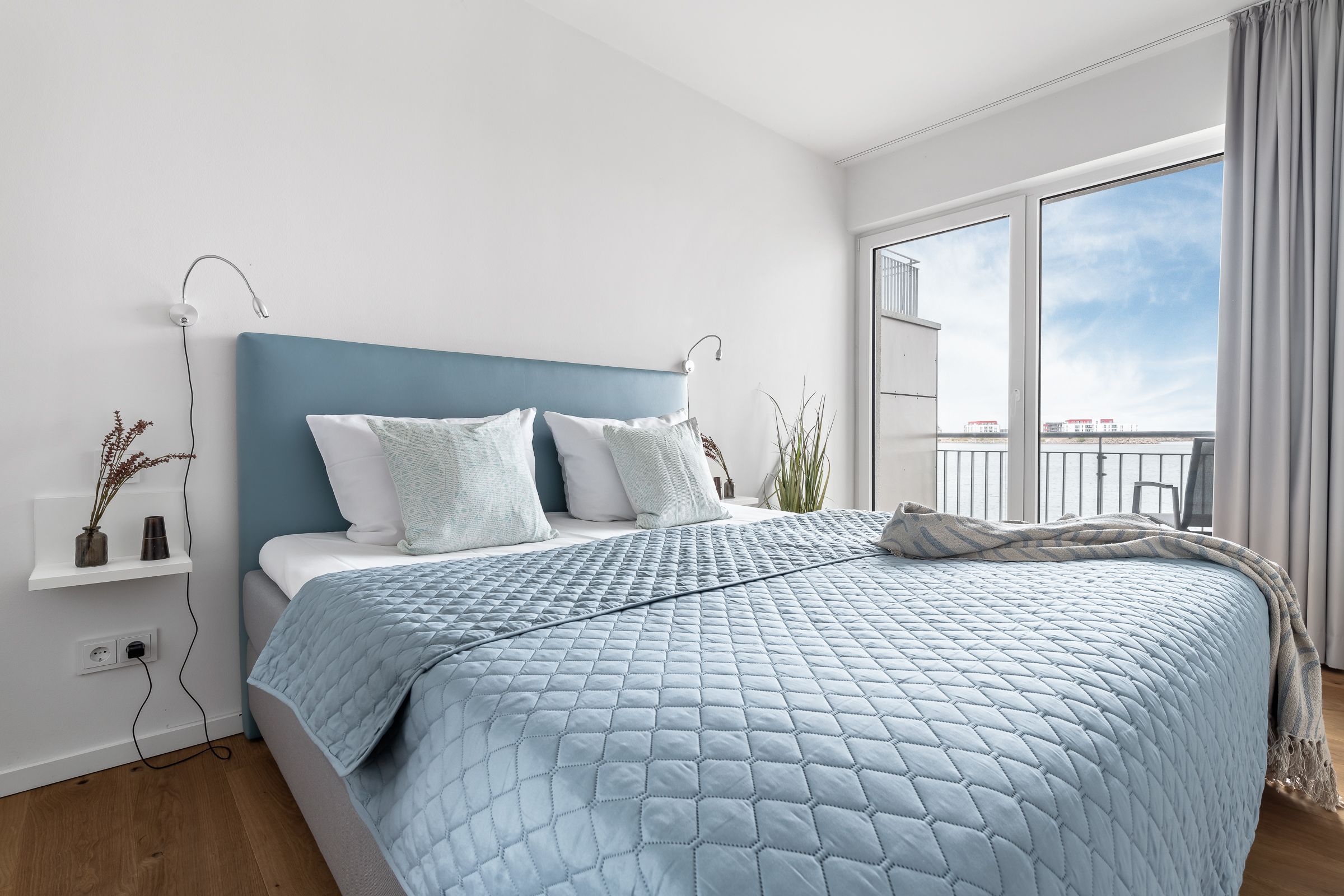 Drei Schlafzimmer bieten Platz für insgesamt sechs Personen und verfügen alle über hochwertige Boxspringbetten, die einen entspannten und erholsamen Schlaf versprechen. Die bodentiefen Fenster lassen sich mittels Gardinen abdunkeln und in einem der drei Schlafzimmer befindet sich ein weiterer Flatscreen TV.