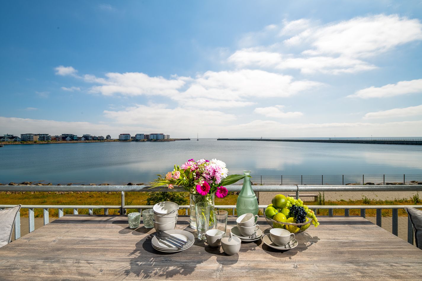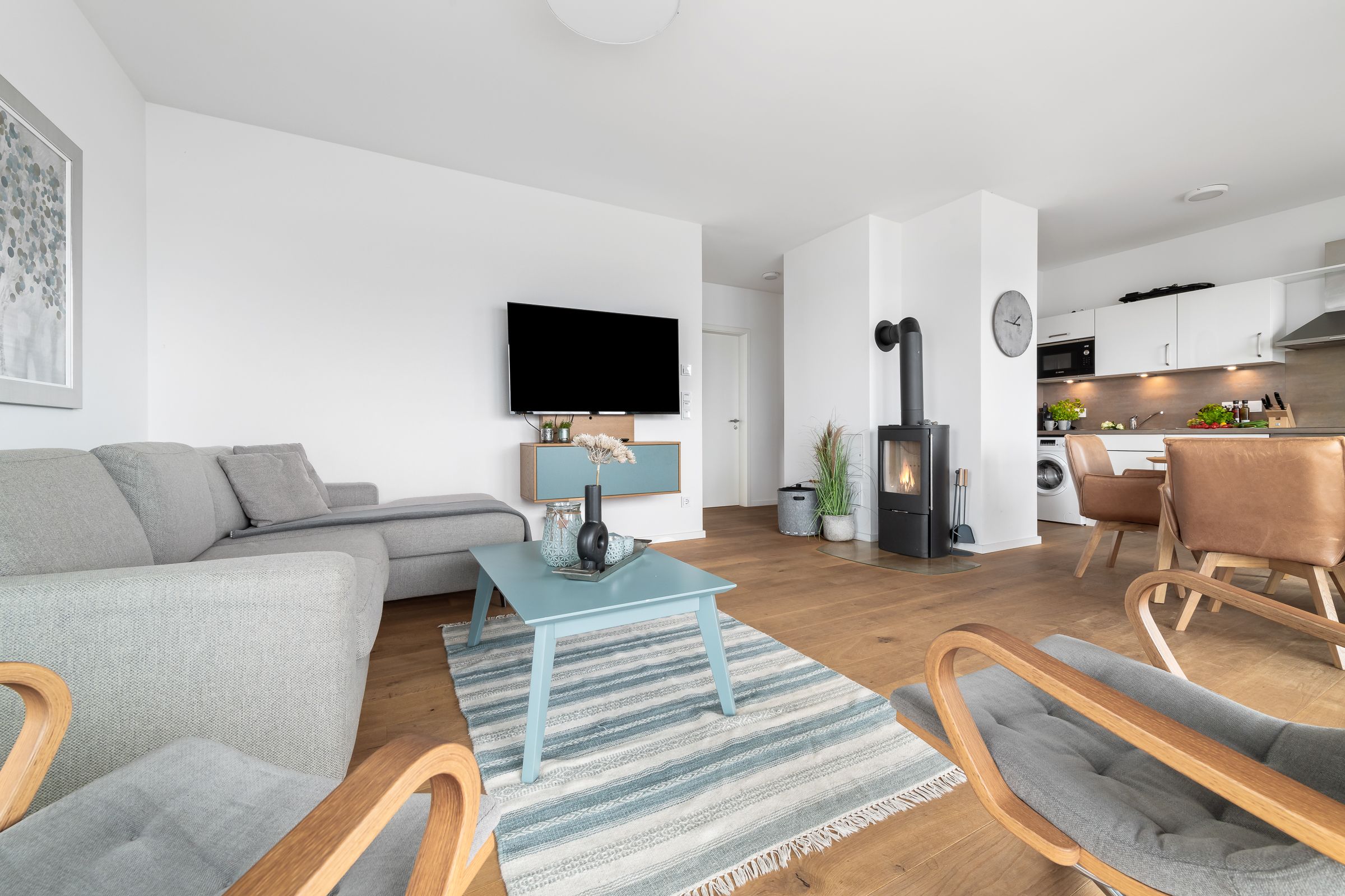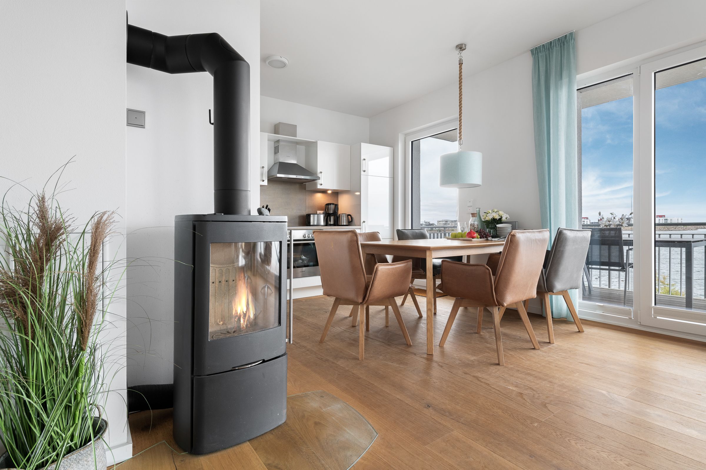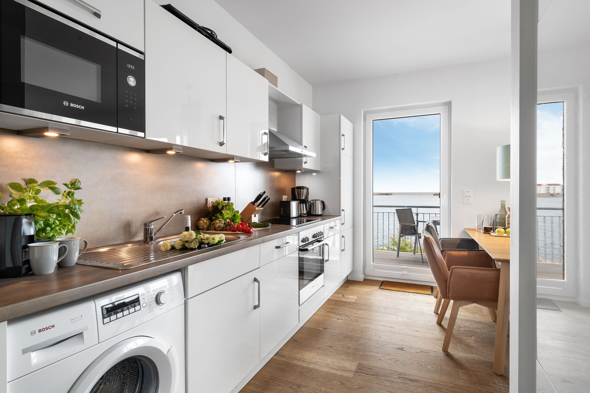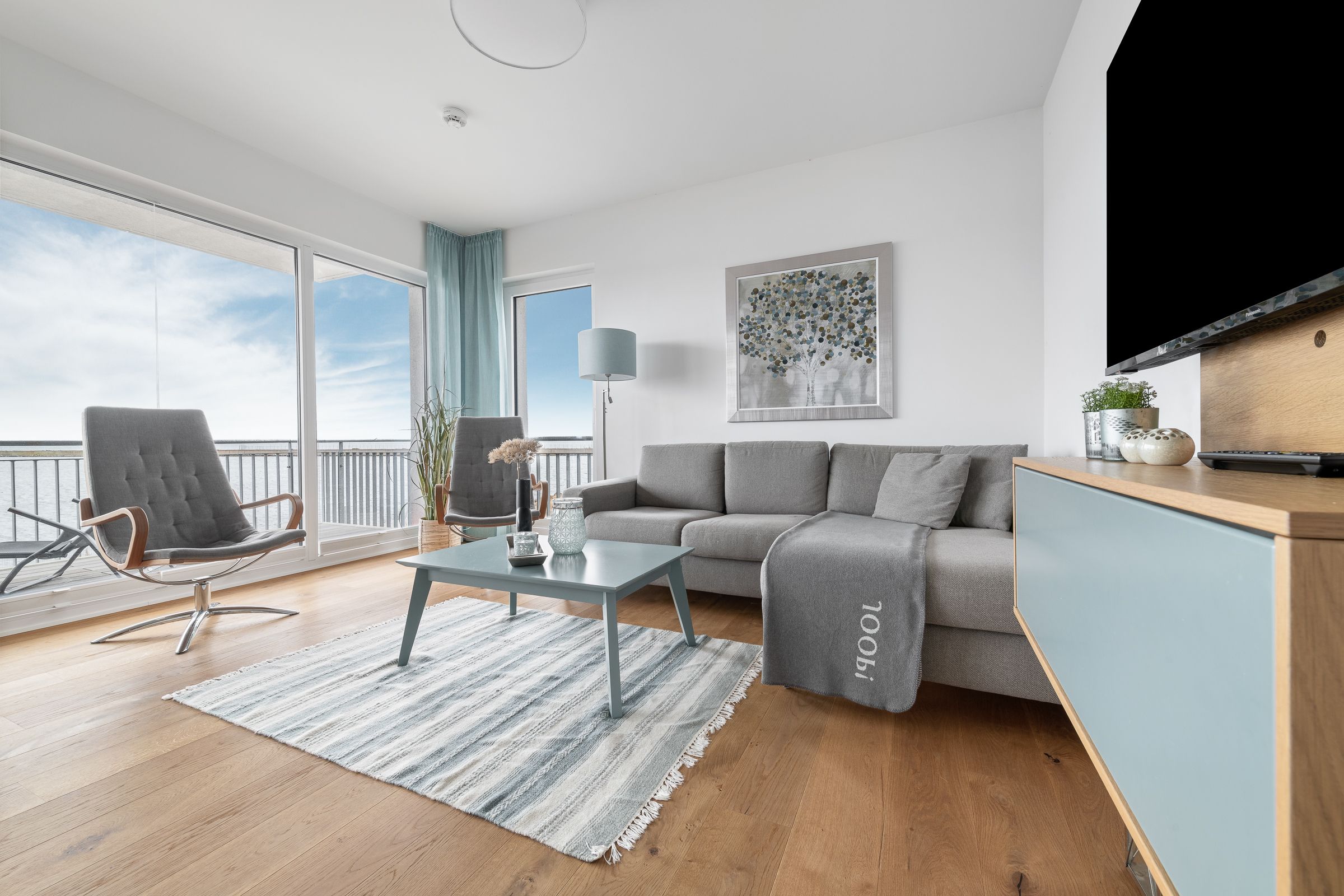 Durch die bodentiefe Fensterfront dringt viel Licht in die Wohnung und bietet vom Wohn-, als auch vom Essbereich einen unvergleichlichen Blick auf die Wasserkulisse von Schlei und Ostsee.
