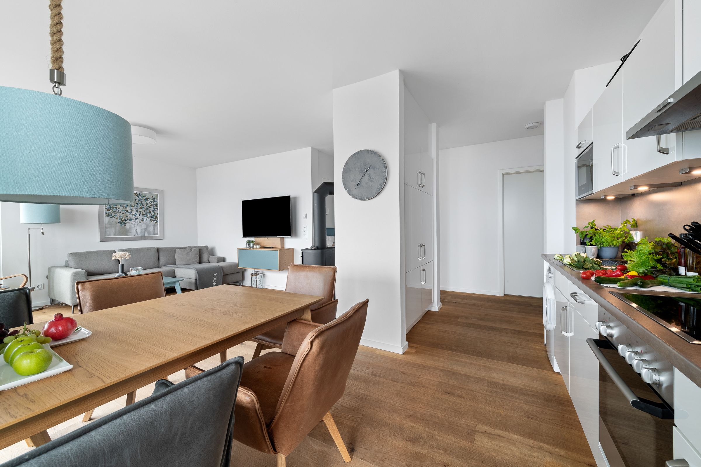 Die moderne Einbauküche bietet alles, was das Herz eines Hobbykochs begehrt. Die dort zubereiteten Mahlzeiten können anschließend entweder am direkt angrenzenden Esstisch oder, je nach Wetterlage, auf dem großzügigen Balkon verspeist werden. Ein Elektro-Grill steht den Gästen zur freien Verfügung.