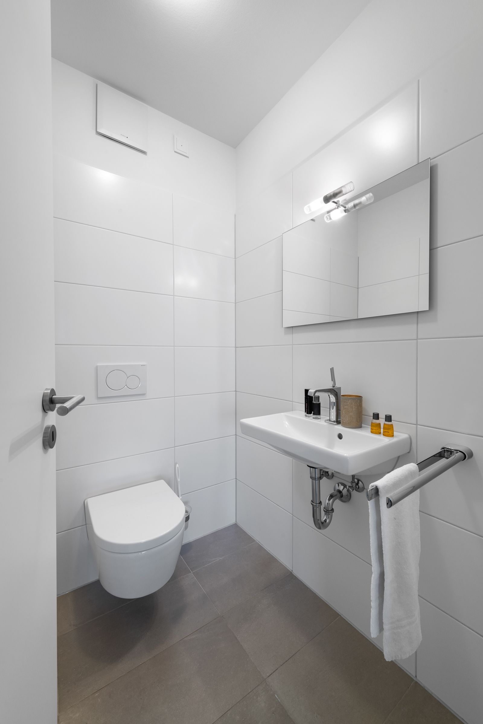Zu dem modernen Badezimmer, dass mit einer Badewanne mit Dusche und WC ausgestattet ist, steht den Gästen noch ein separates WC zur Verfügung.