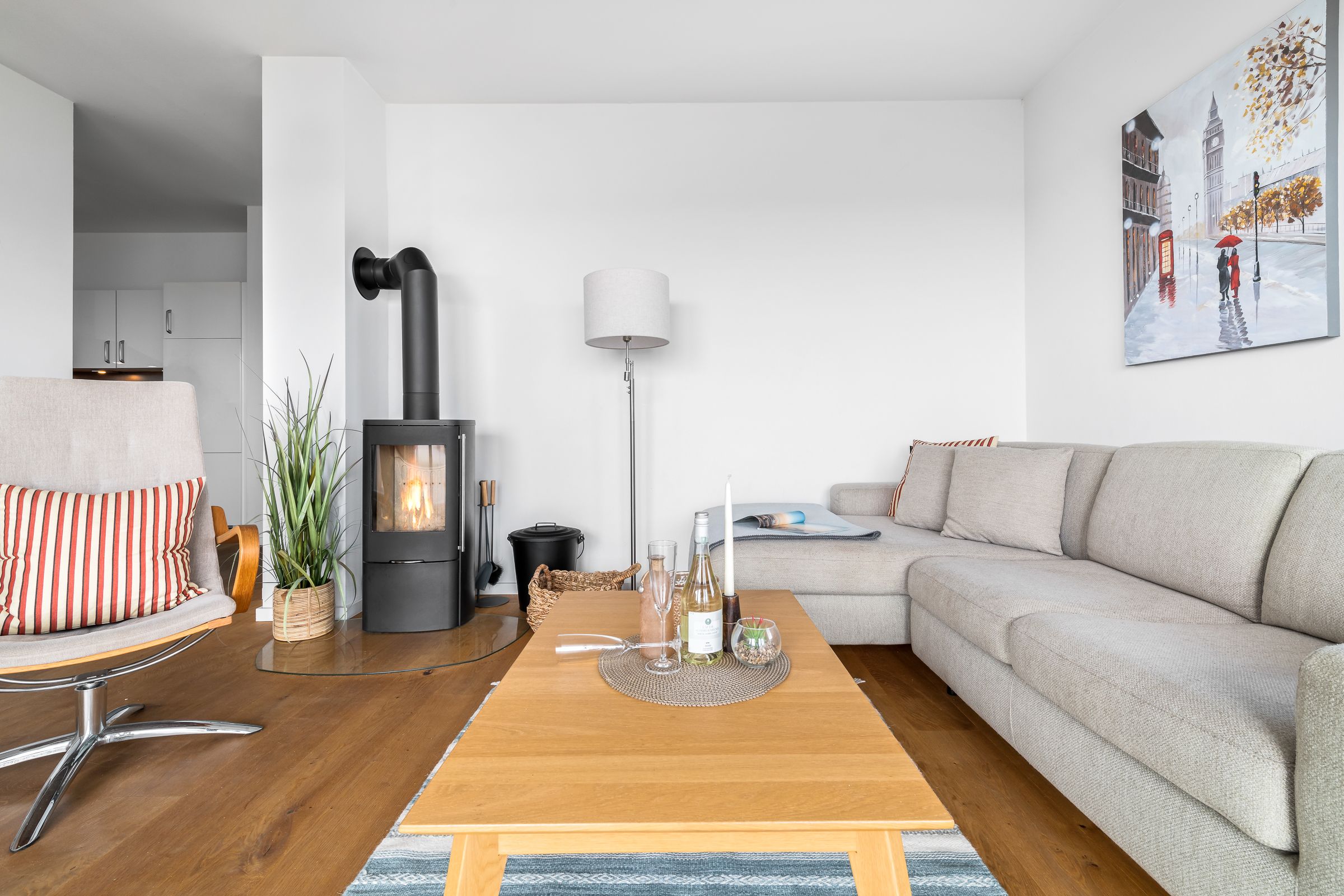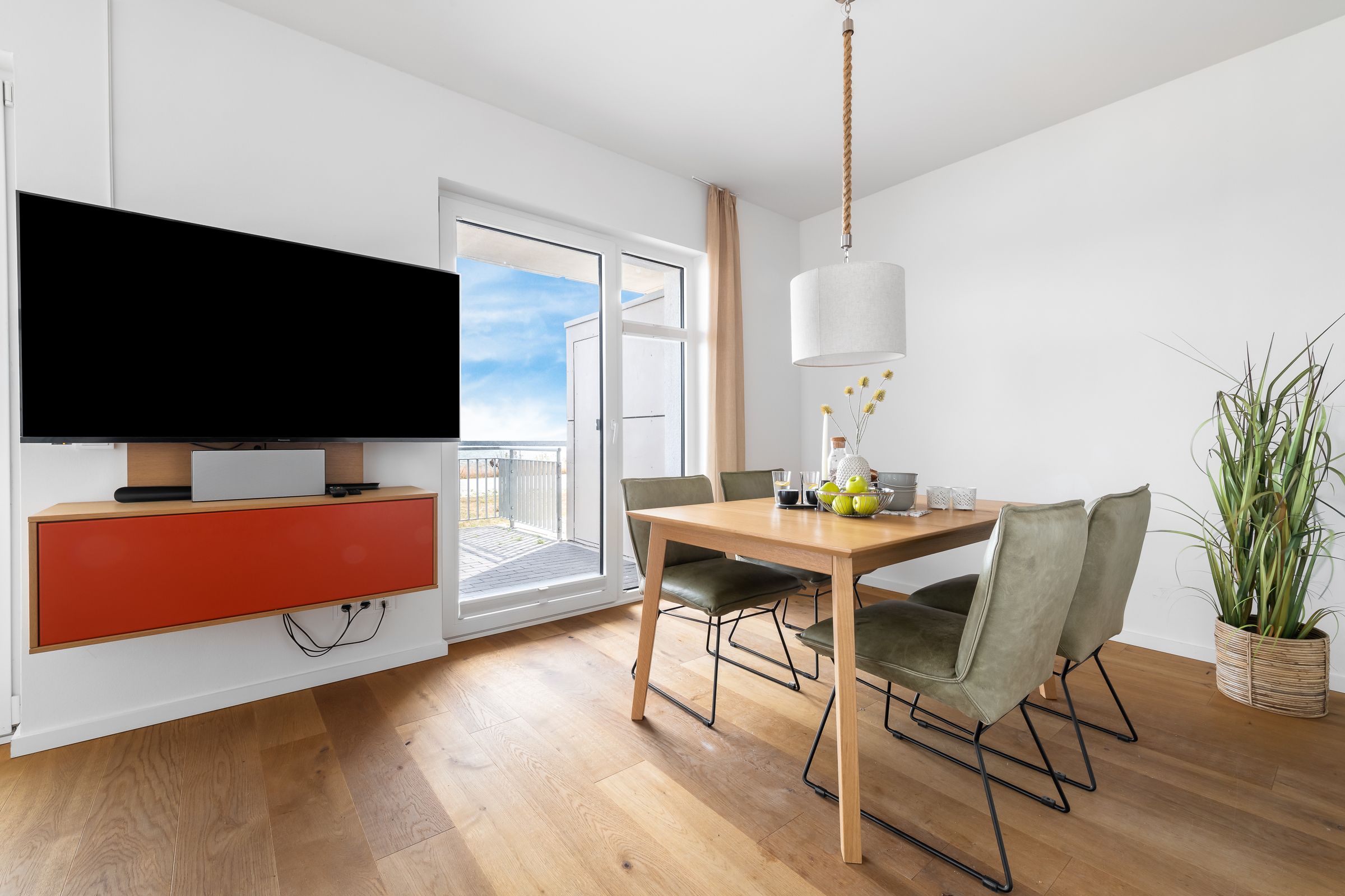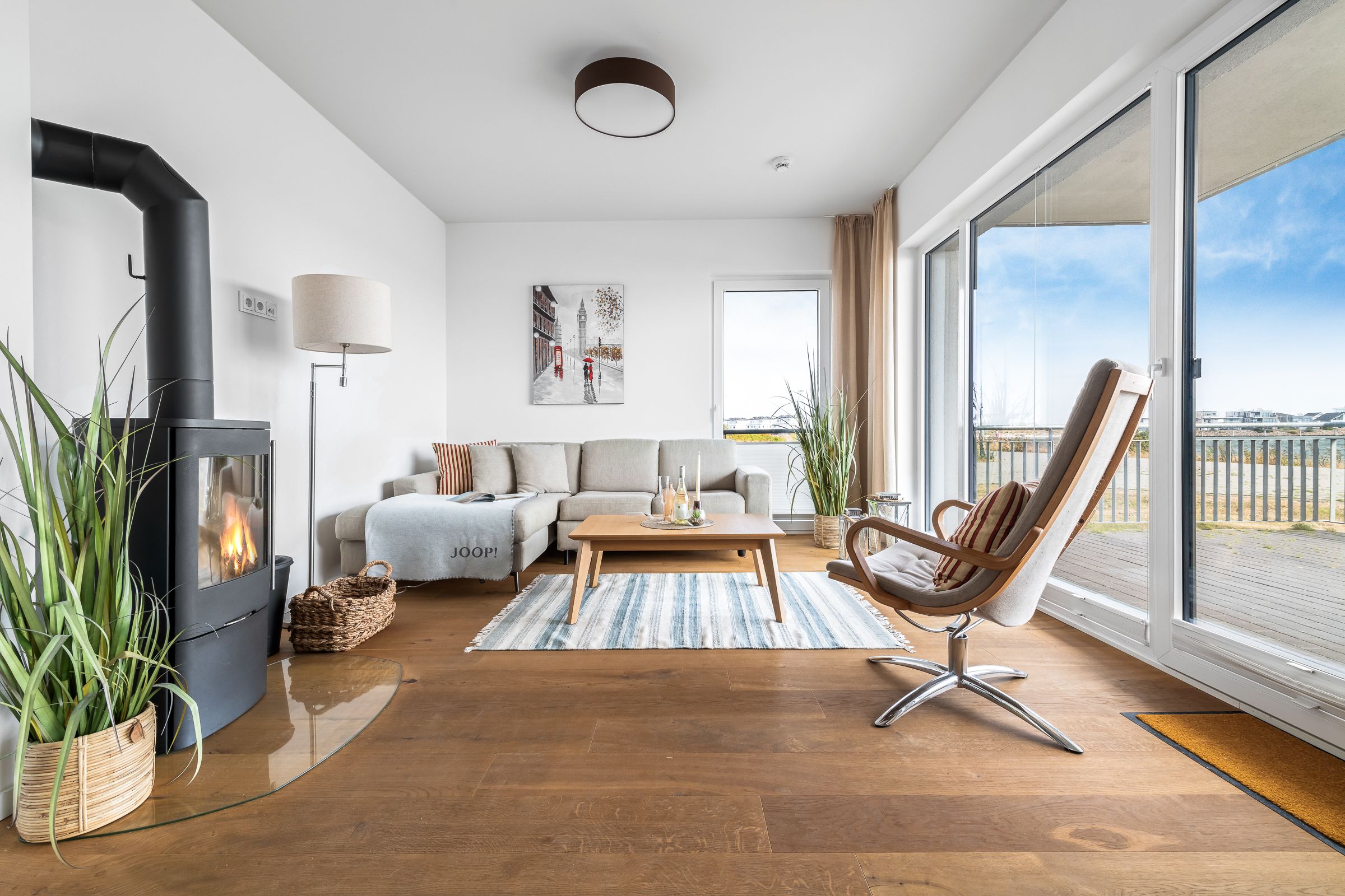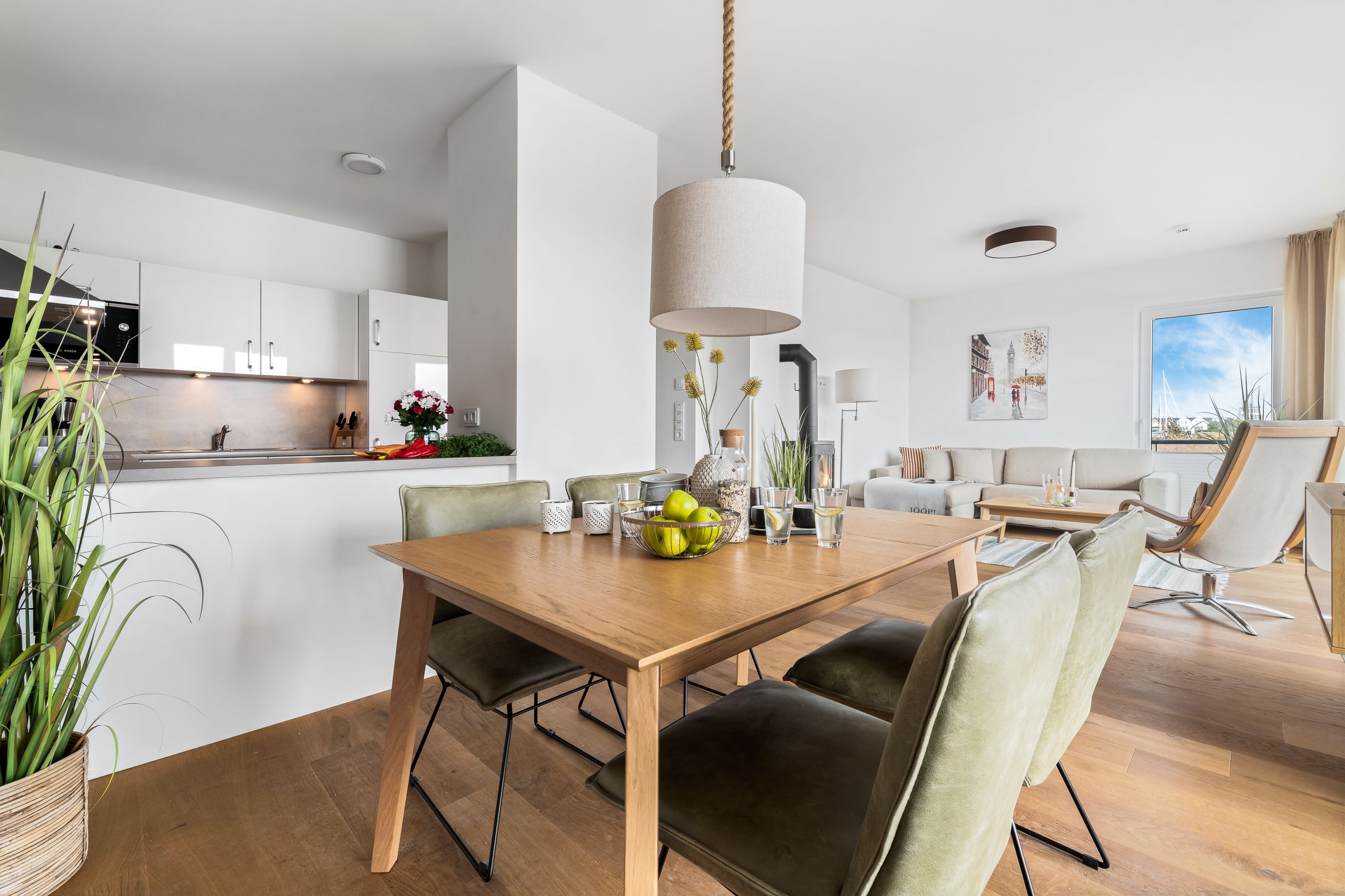 Der Wohnbereich erwartet unsere Gäste mit maritimem Flair, hell-nordischer Einrichtung und Gemütlichkeit. Durch die großzügige Panoramawand ist die Wohnung immer lichtdurchflutet und bietet einen traumhaften Blick auf Ostsee und Schlei. Kaminofen, gemütliche Sitzmöbel und ein Flatscreen laden zur Urlaubsentspannung ein!