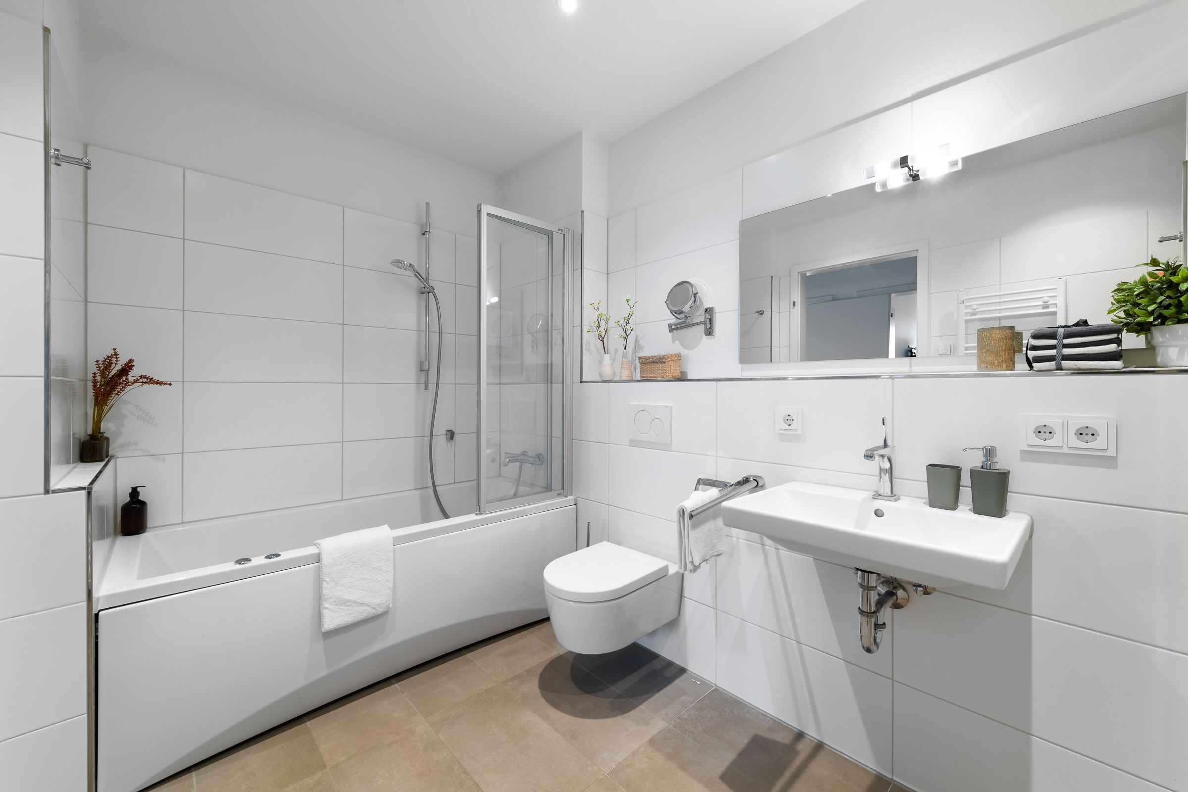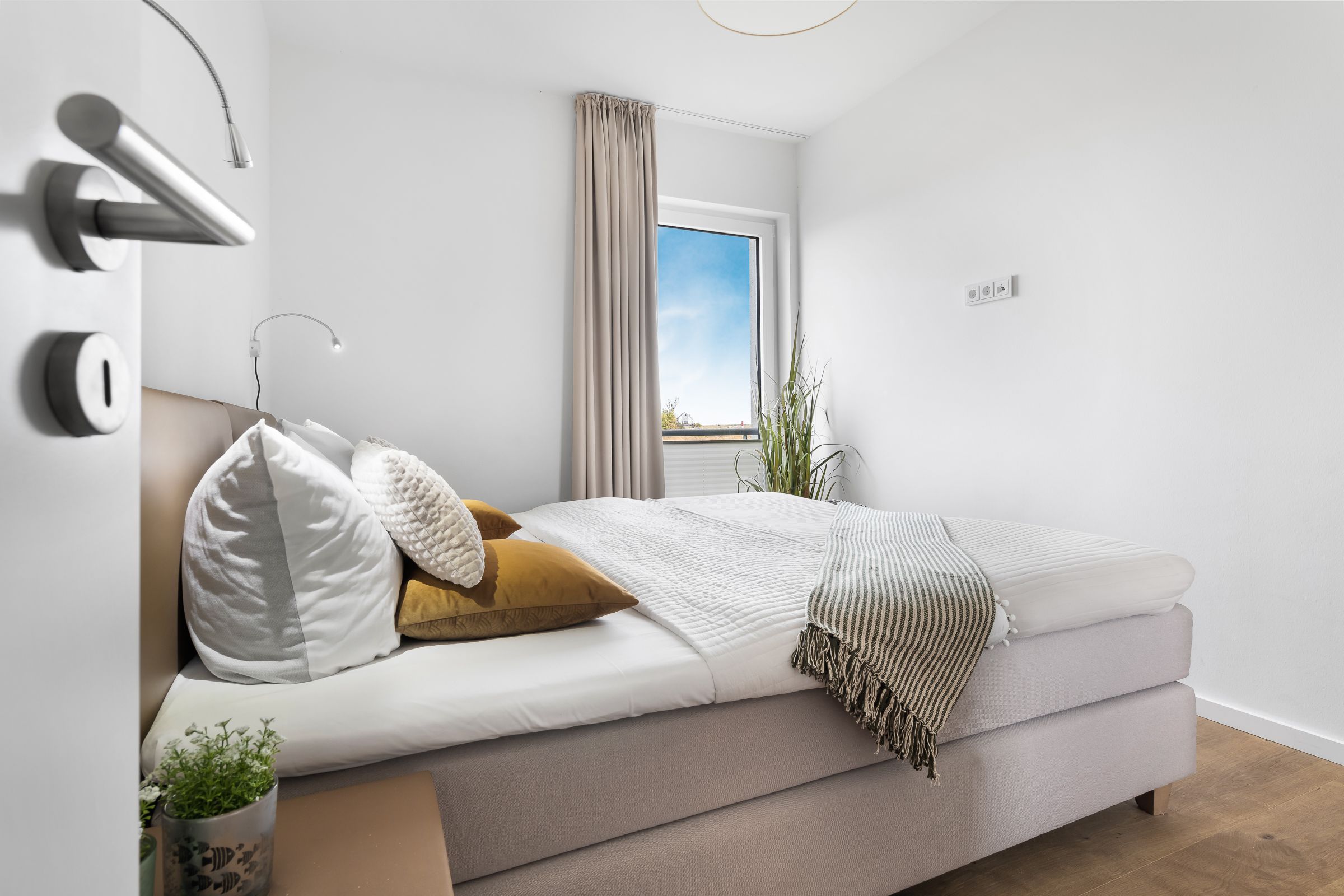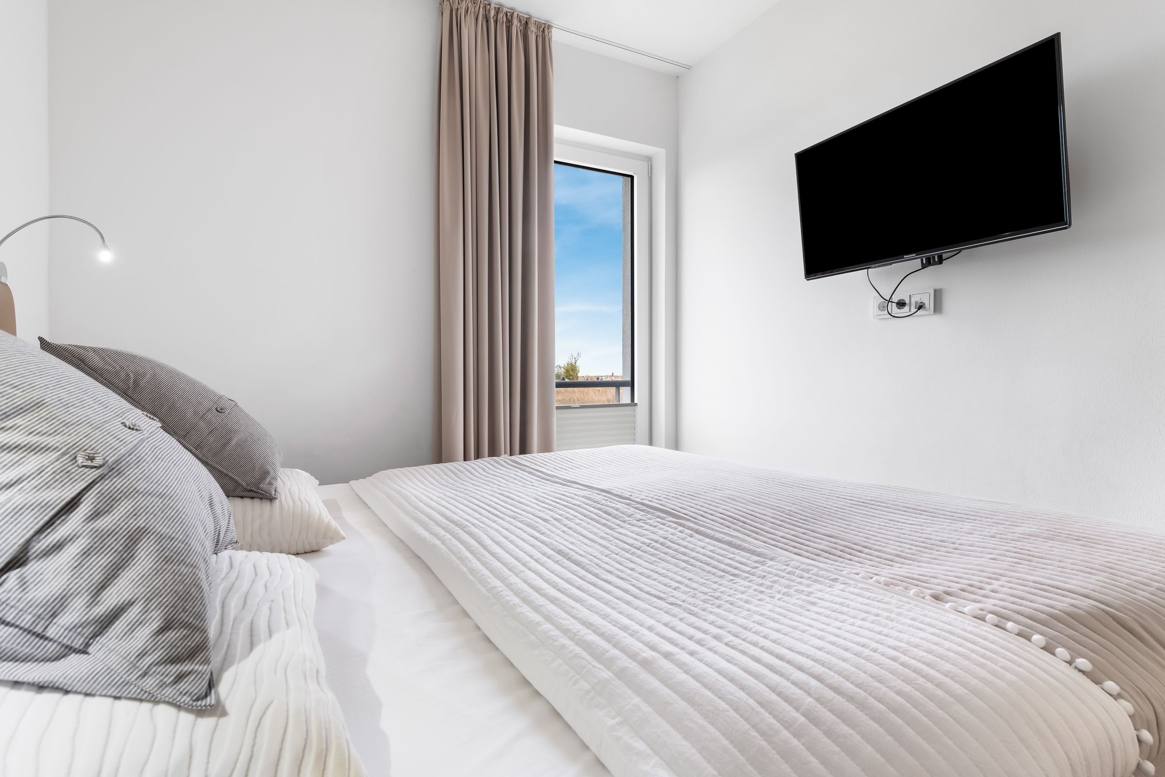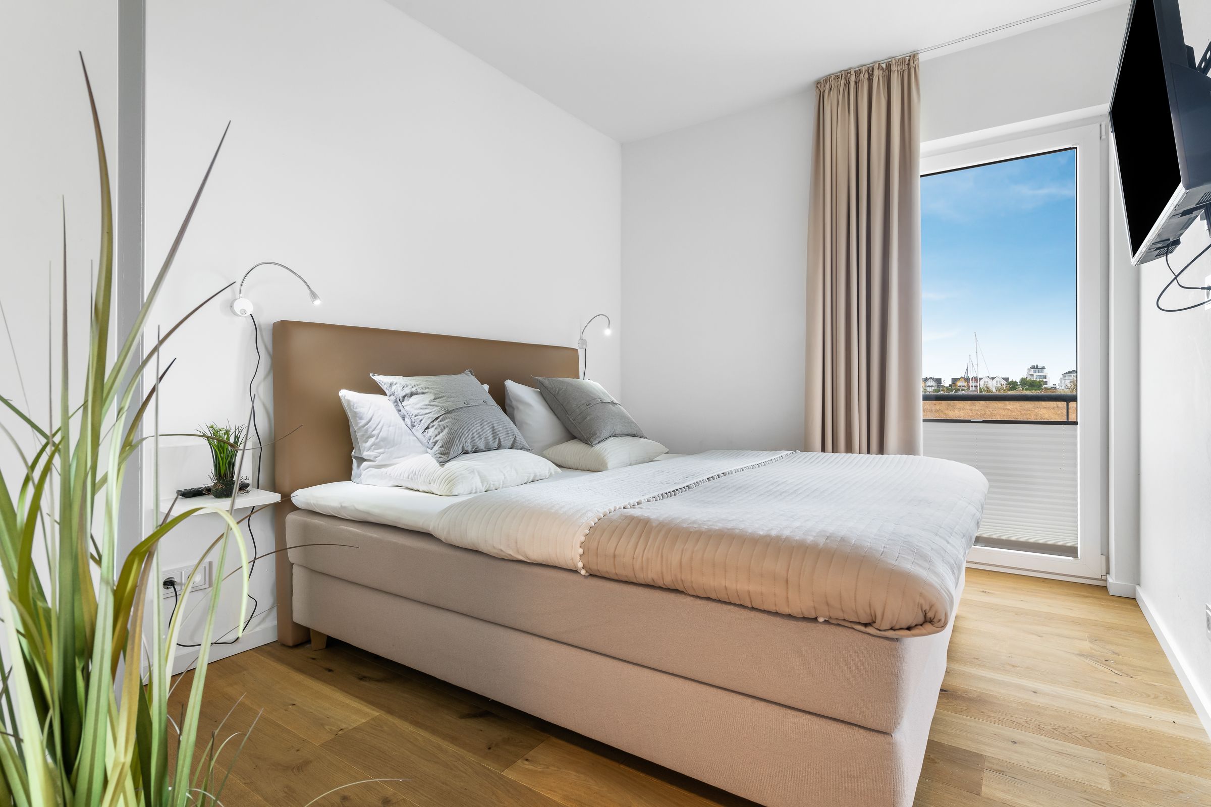 Die zwei Schlafzimmer bieten Platz für vier Personen und verfügen über hochwertige Boxspringbetten, Kleiderschränke und bodentiefe Fenster. Für gemütliche Filmabende steht in einem der Schlafzimmer ein Smart-TV bereit.