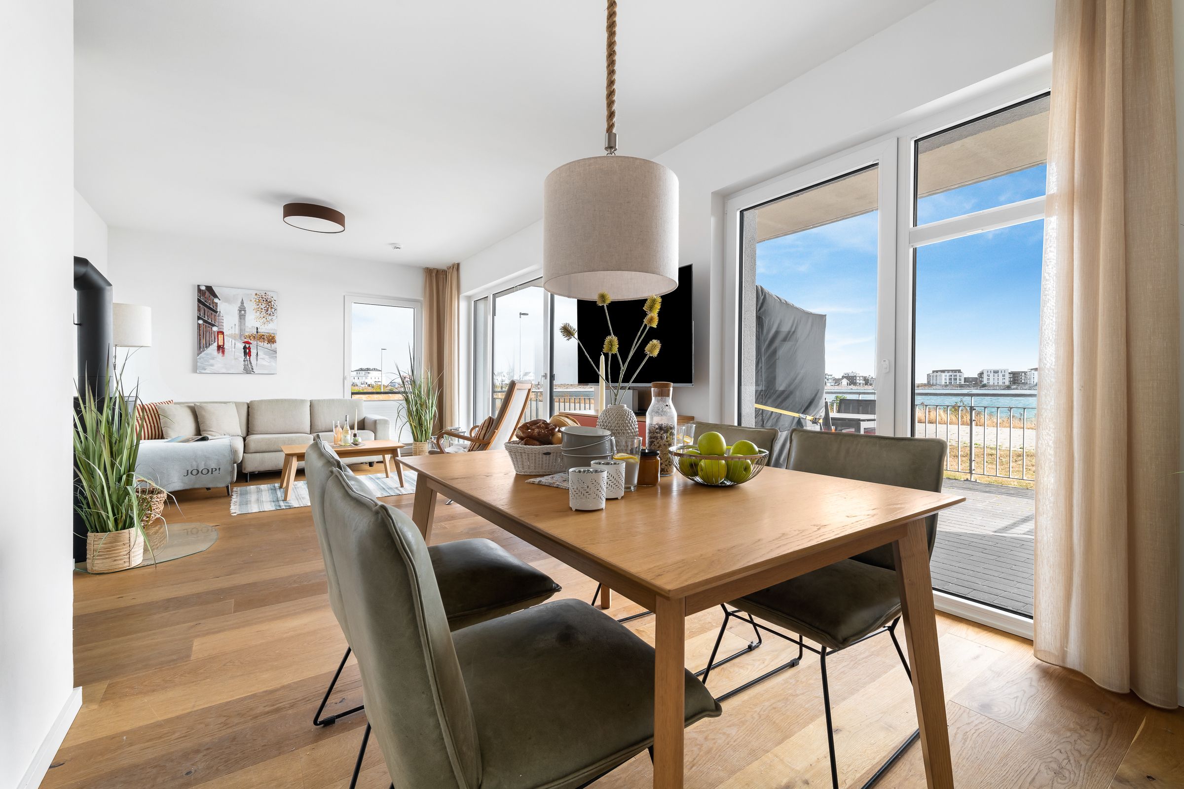 Die frisch zubereiteten Köstlichkeiten können dann am großzügigen Esstisch oder auf der Sonnenterrasse verspeist werden. Durch Möwengeschrei oder vorbeifahrende Segelschiffe verblasst hier jeglicher Alltagsstress.
