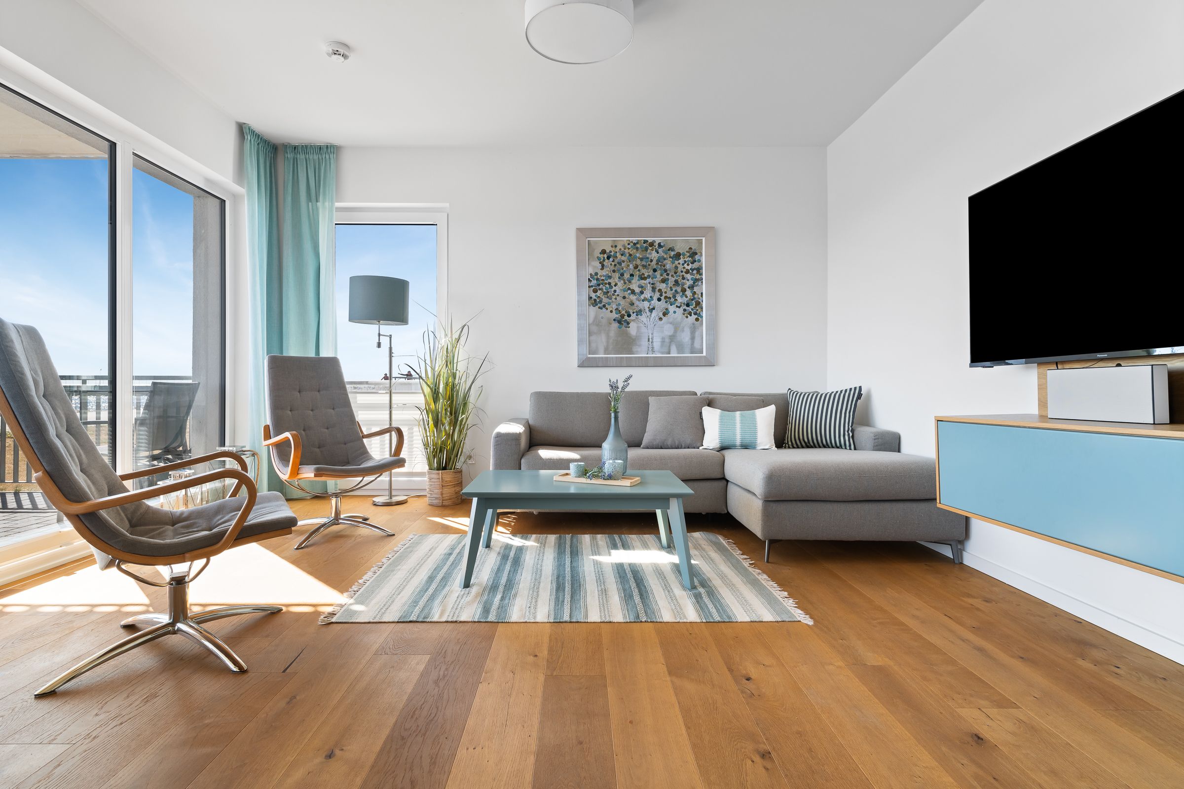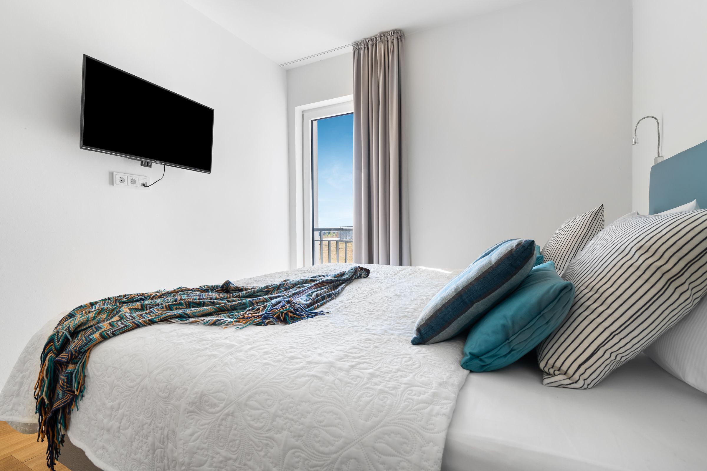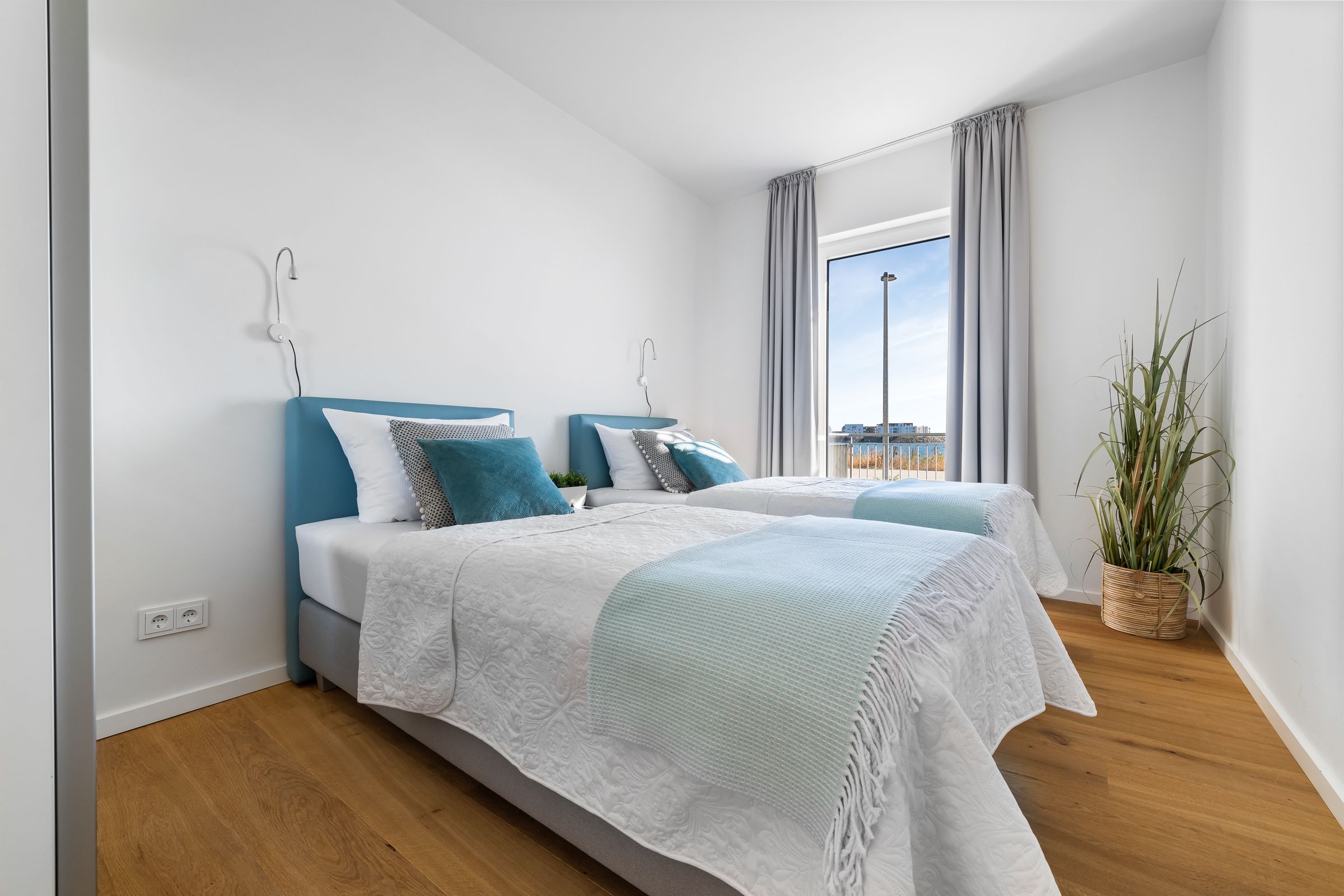 Zwei Schlafzimmer bieten Platz für insgesamt vier Personen und verfügen alle über hochwertige Boxspringbetten, die einen entspannten und erholsamen Schlaf versprechen. Die bodentiefen Fenster lassen sich mittels Gardinen abdunkeln und in einem der zwei Schlafzimmer befindet sich ein weiterer Flatscreen TV.