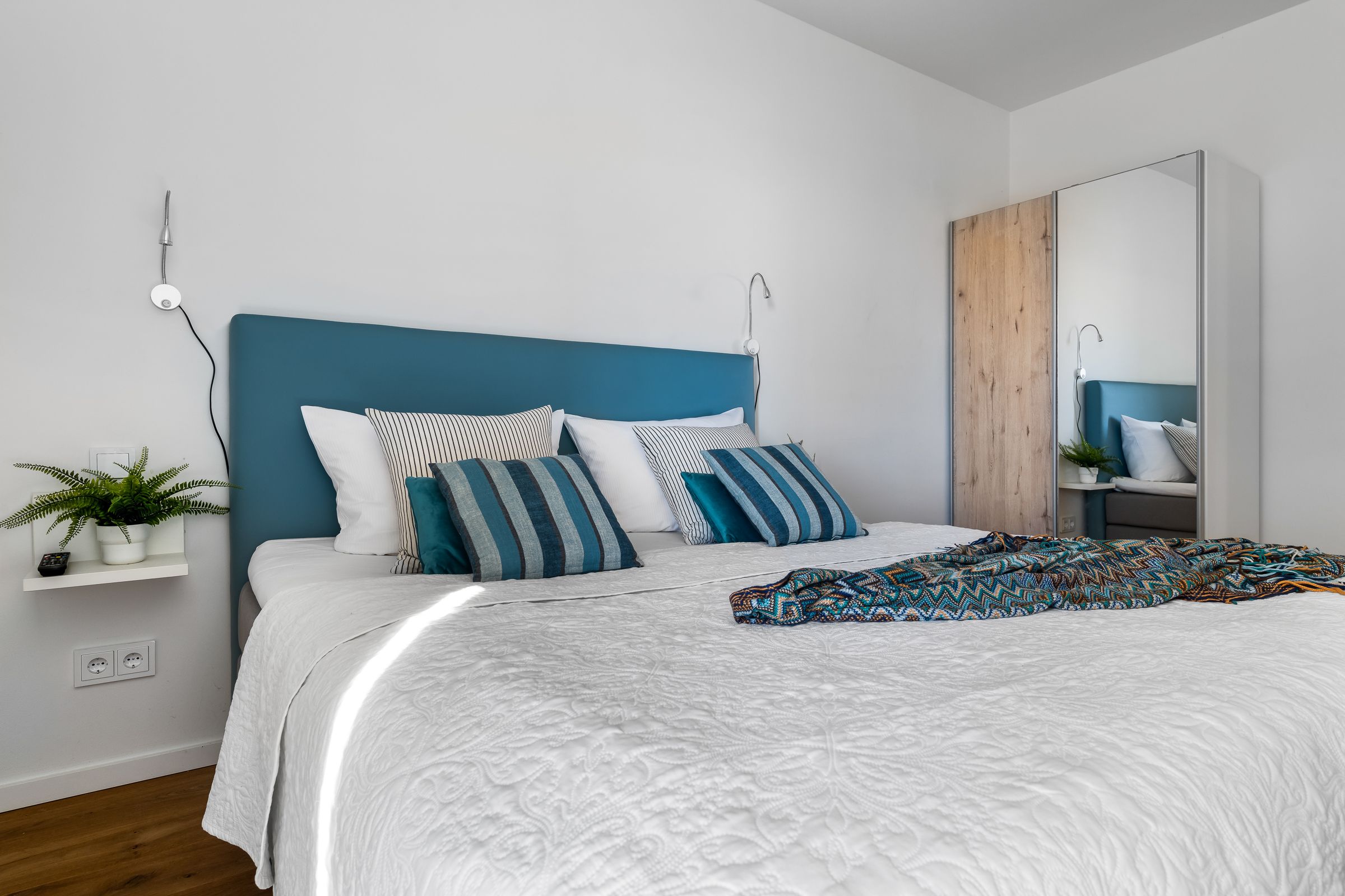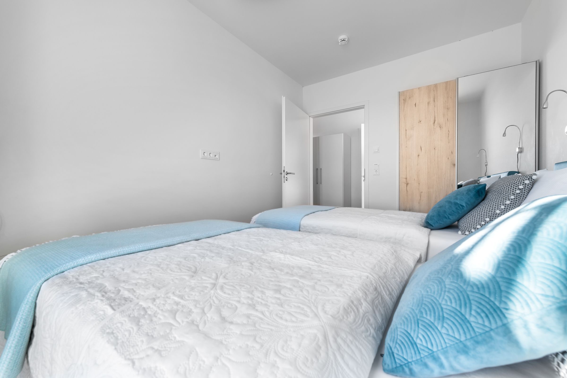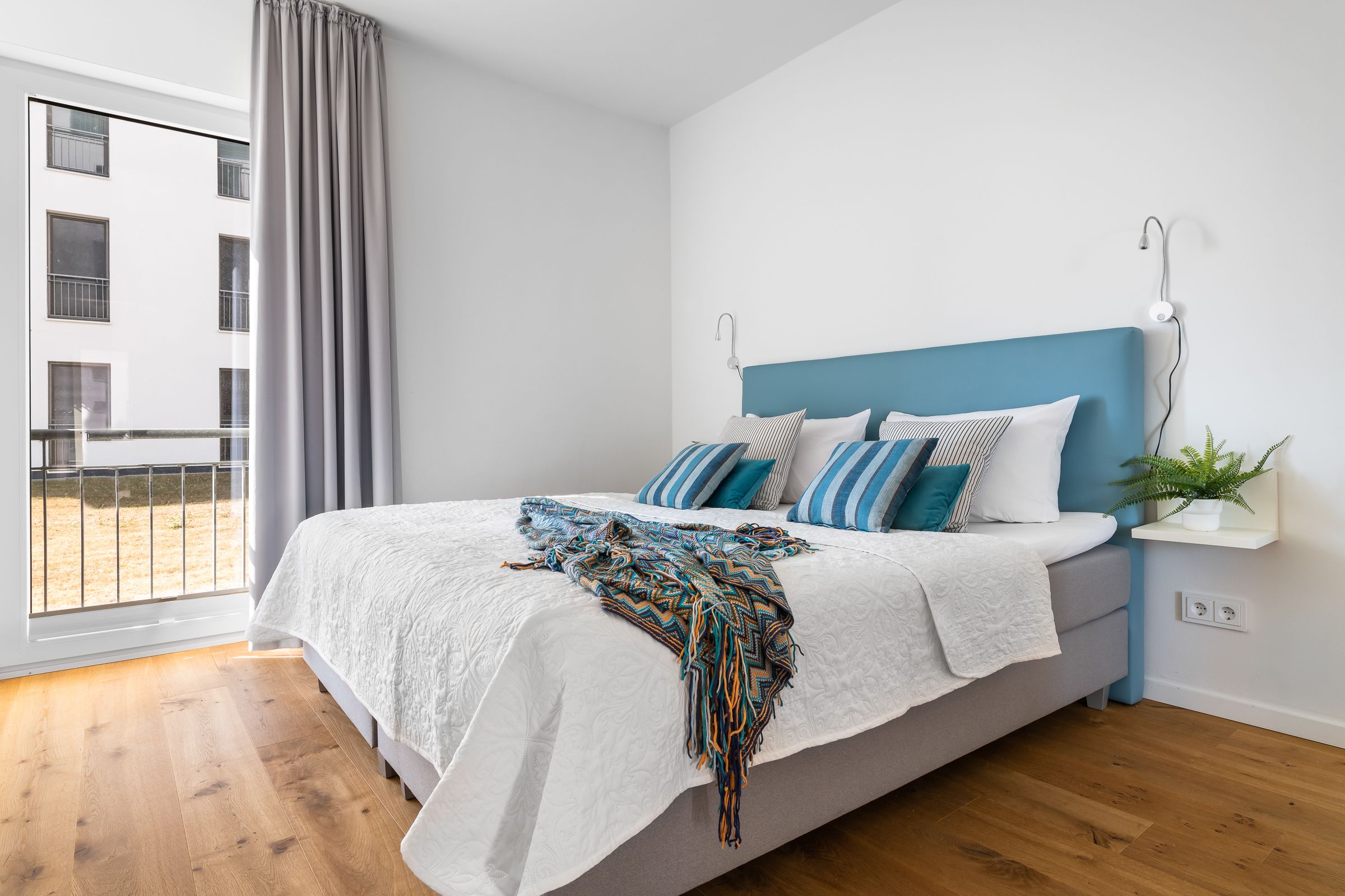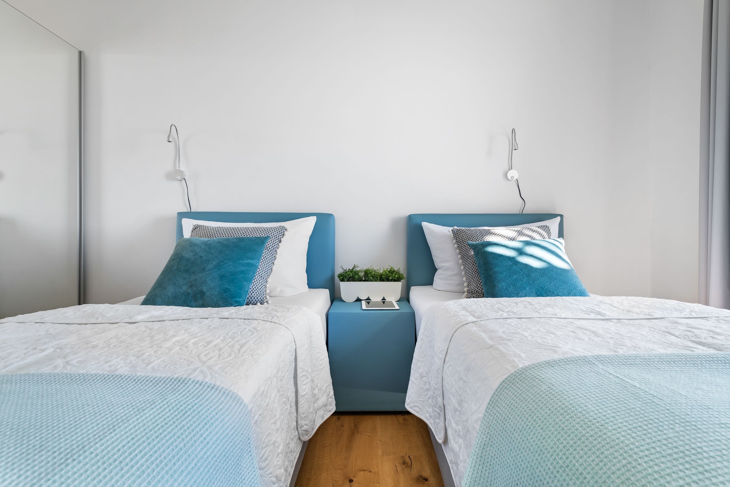 Zwei Schlafzimmer bieten Platz für insgesamt vier Personen und verfügen alle über hochwertige Boxspringbetten, die einen entspannten und erholsamen Schlaf versprechen. Die bodentiefen Fenster lassen sich mittels Gardinen abdunkeln und in einem der zwei Schlafzimmer befindet sich ein weiterer Flatscreen TV.
