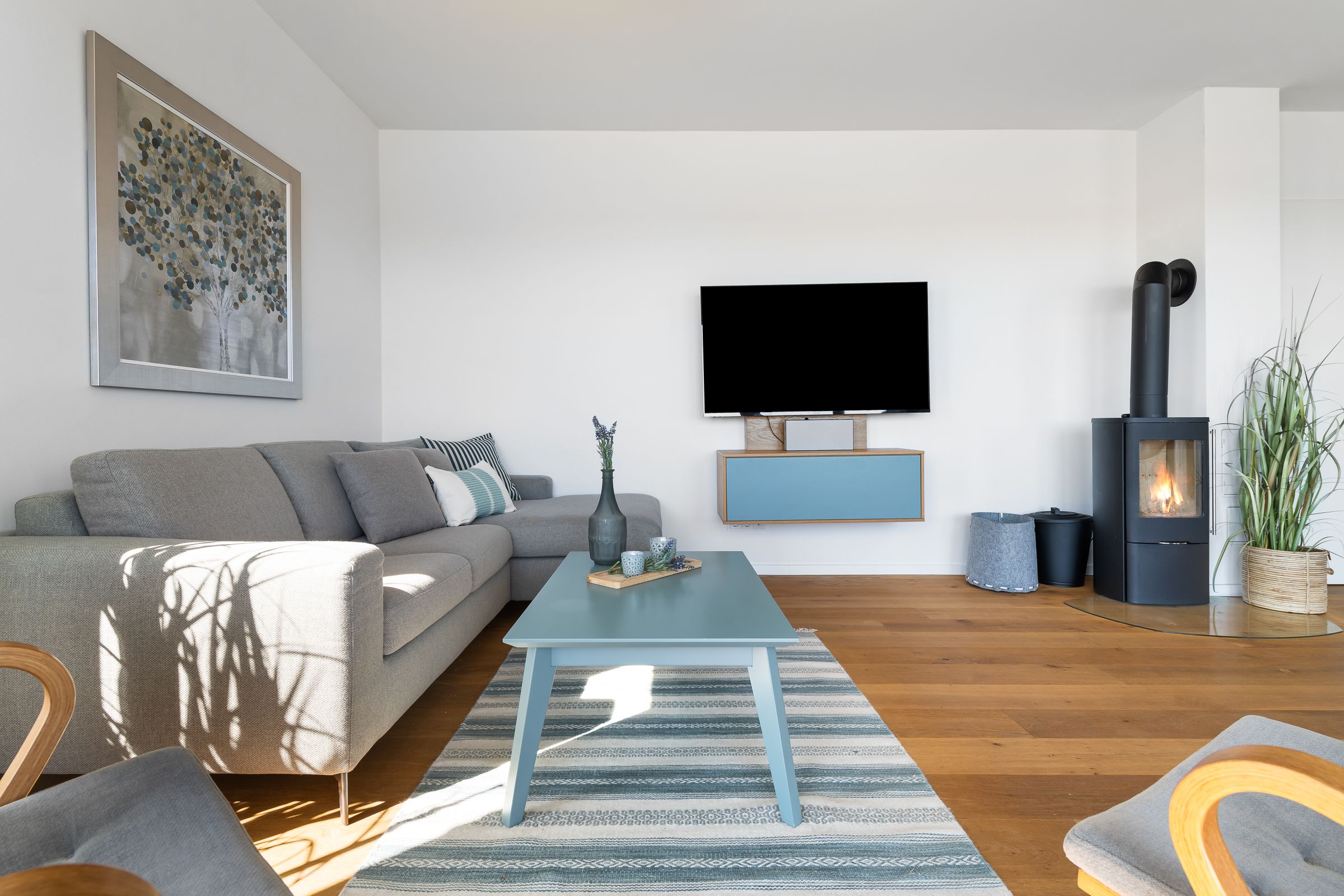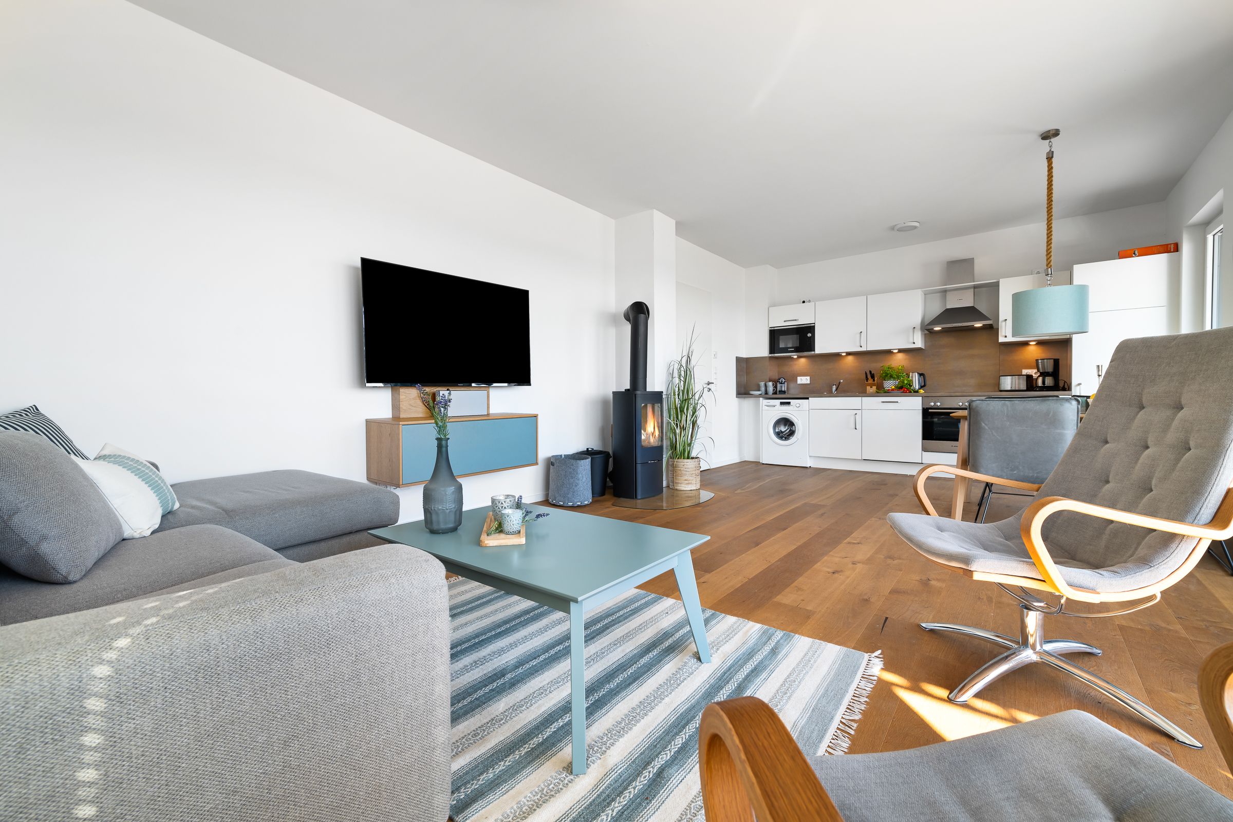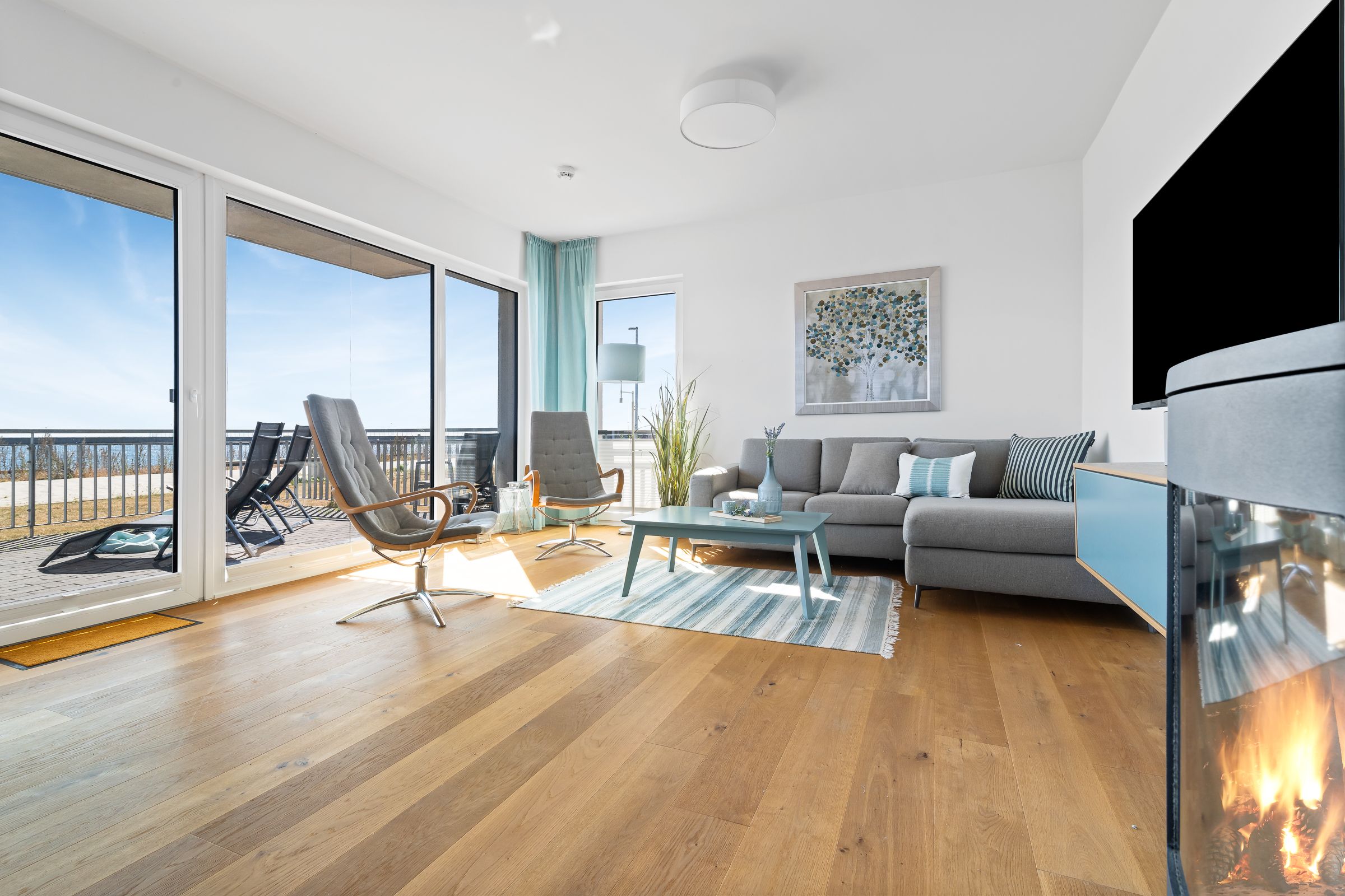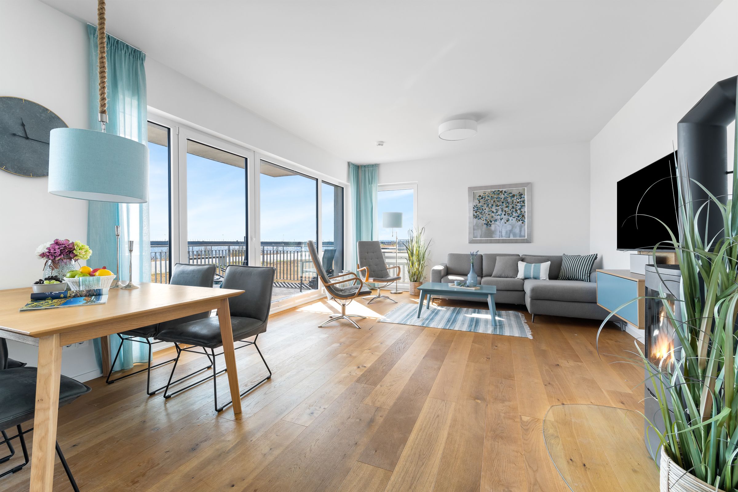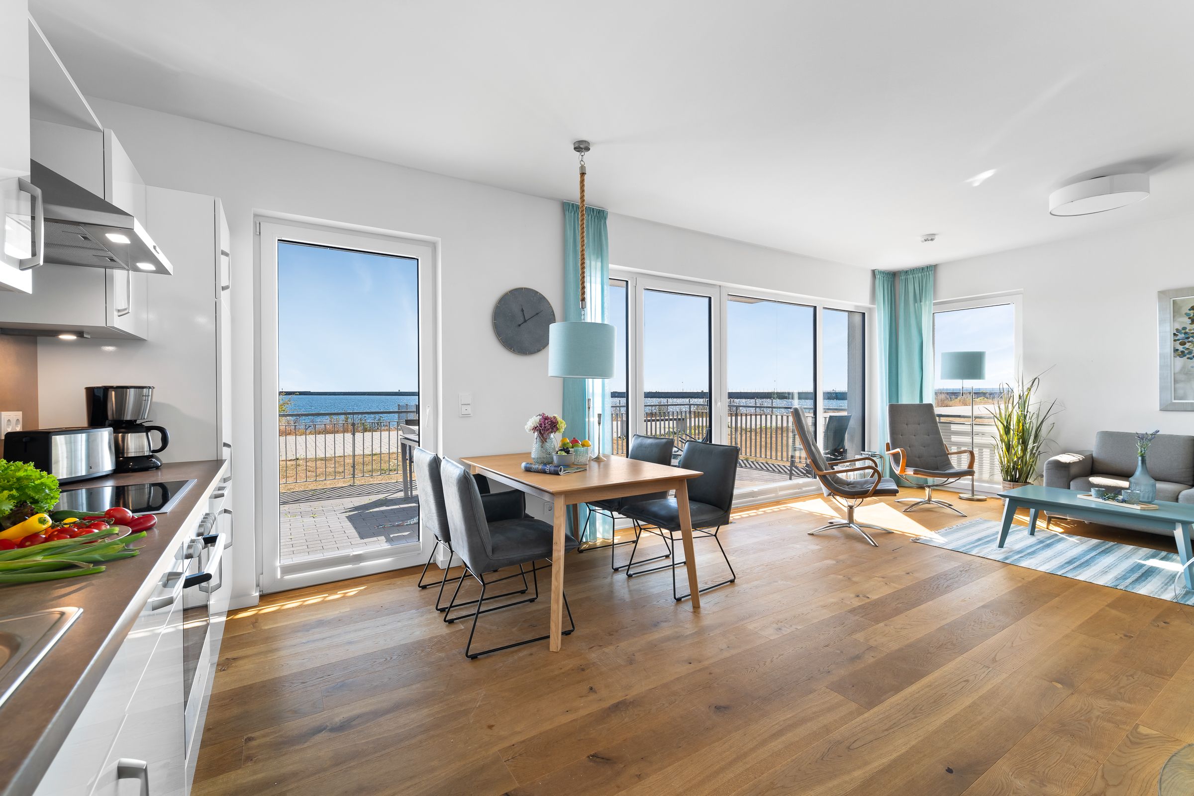 Durch die bodentiefe Fensterfront dringt viel Licht in die Wohnung und bietet vom Wohn-, als auch vom Essbereich einen unvergleichlichen Blick auf die Wasserkulisse von Schlei und Ostsee.