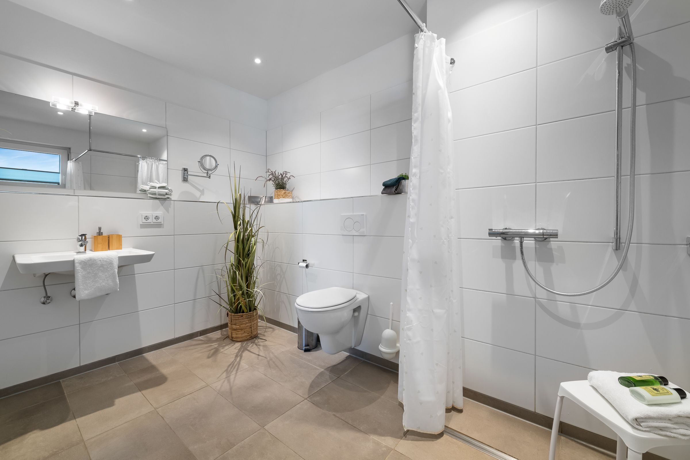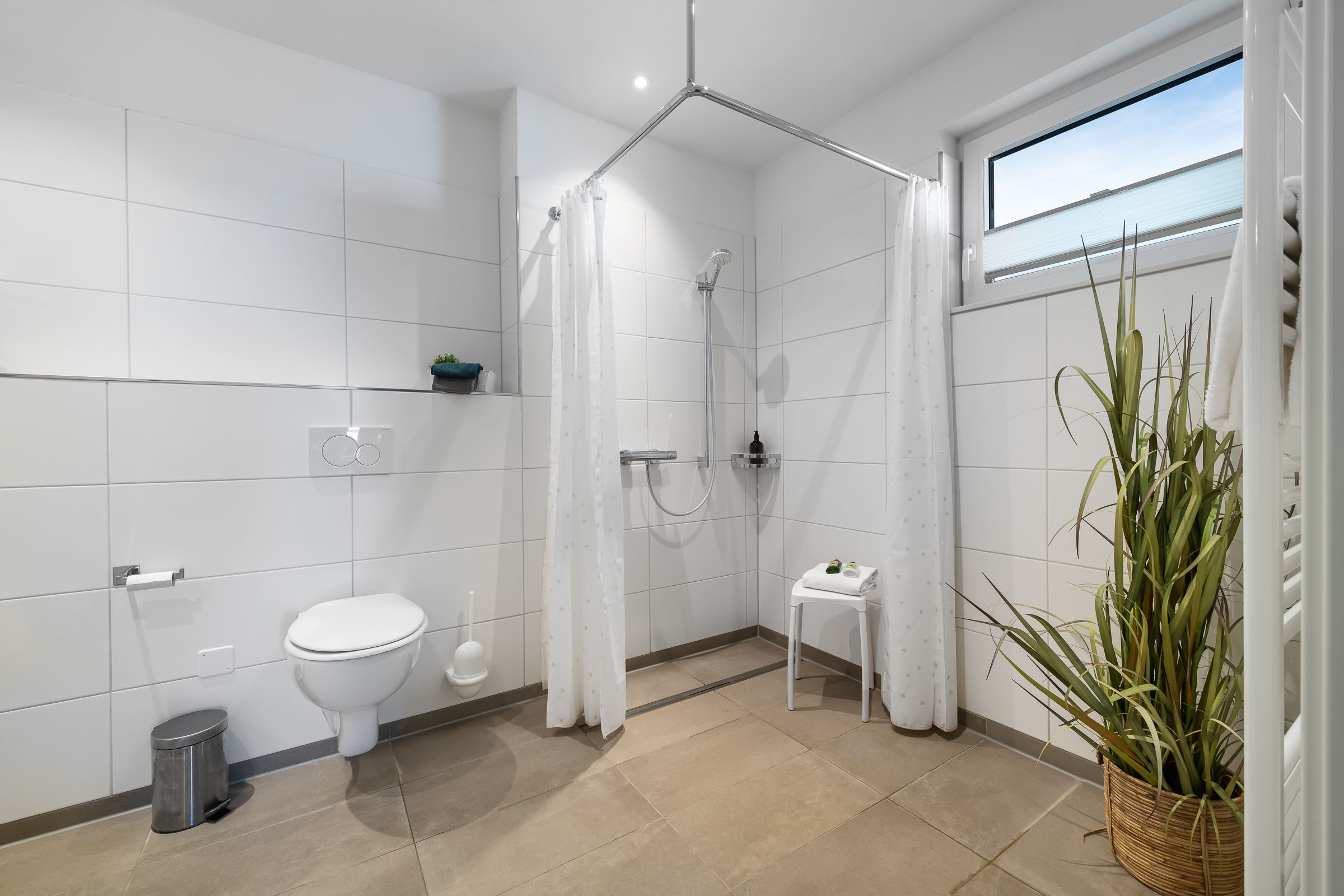 Das moderne Badezimmer ist mit einer Badewanne, Dusche und WC ausgestattet.