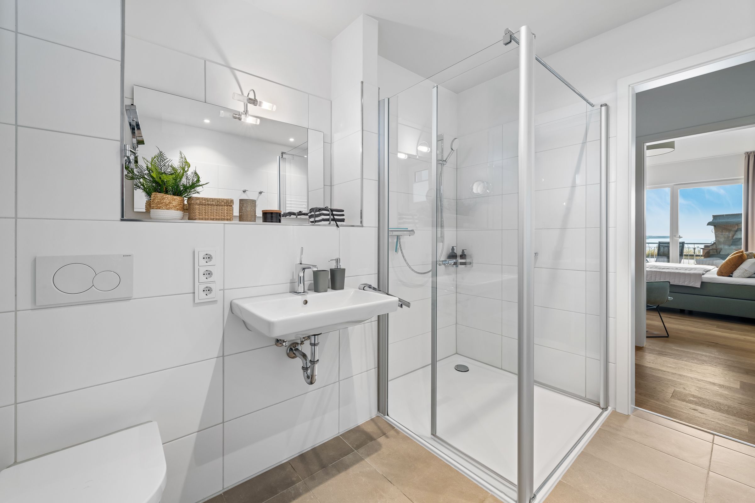 Das moderne Badezimmer mit großer, ebenerdiger Dusche und Fußbodenheizung lässt ebenfalls keine Wünsche offen.