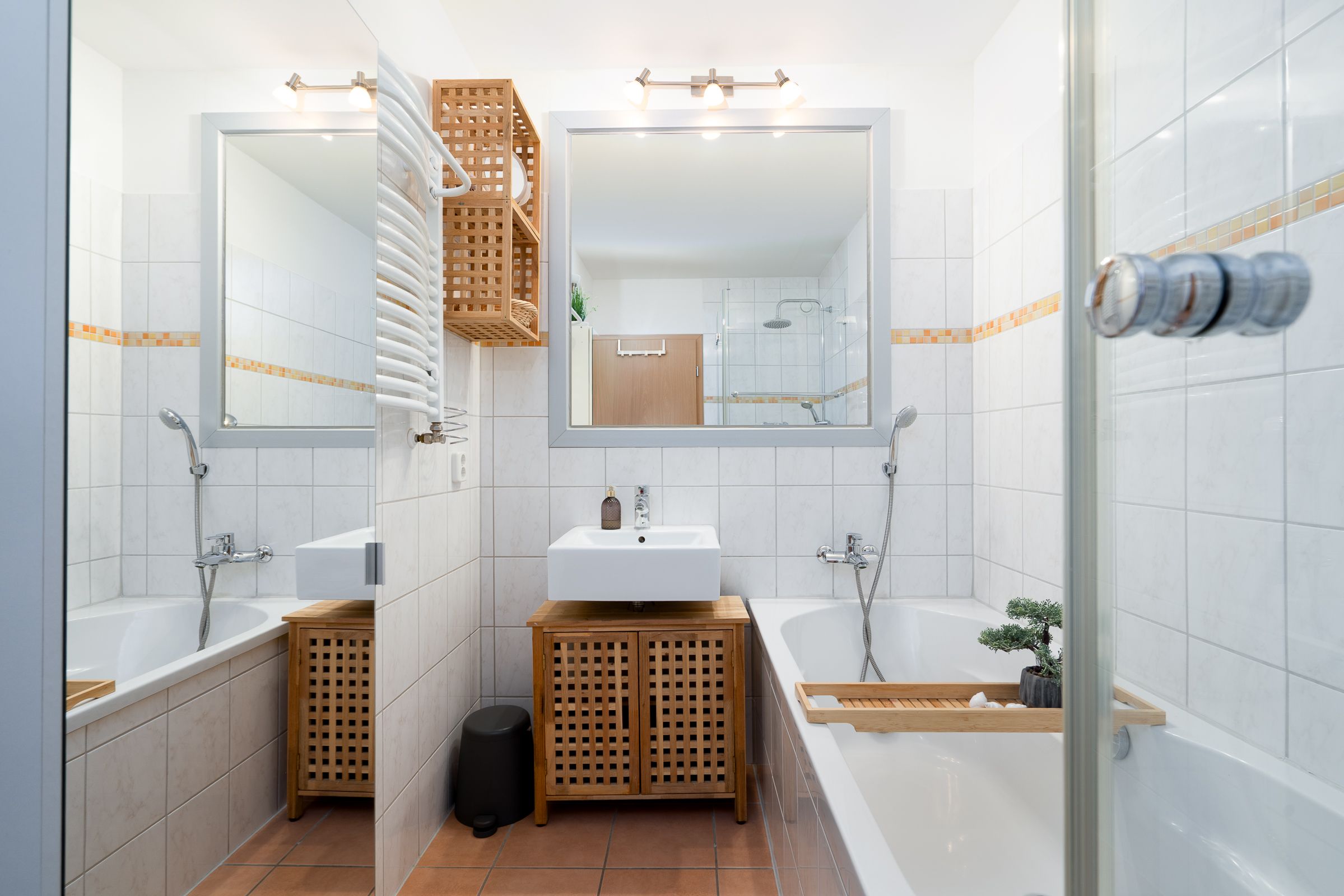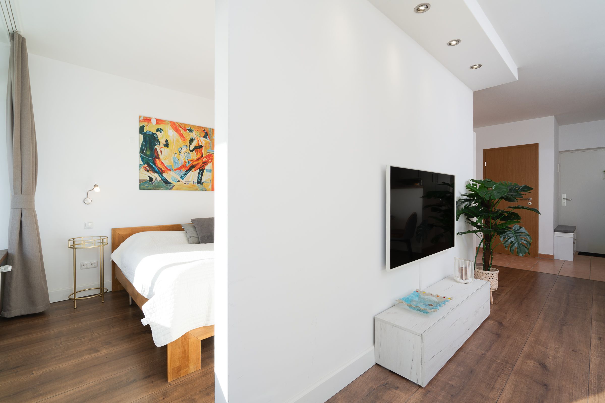 Das separate Schlafzimmer verfügt über ein bequemes Doppelbett (2x 90 cm x 200 cm) und hat einen großen Kleiderschrank. Im Wohnzimmer befindet sich eine Schlafcouch (90 x 190 cm), auf der eine Person nächtigen kann. Ein modernes Badezimmer bietet eine Dusche und eine Badewanne, sowie ein abgetrenntes WC.