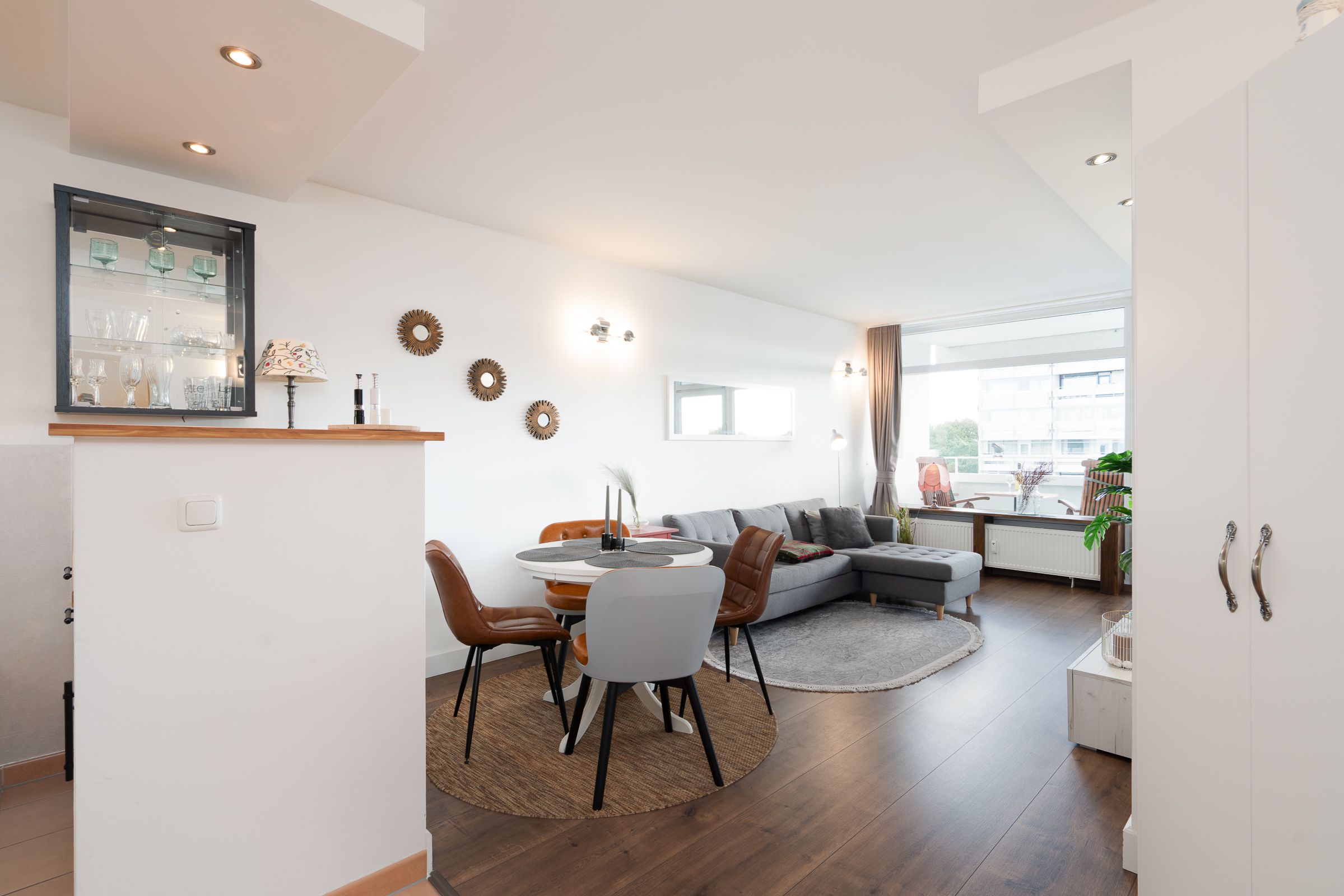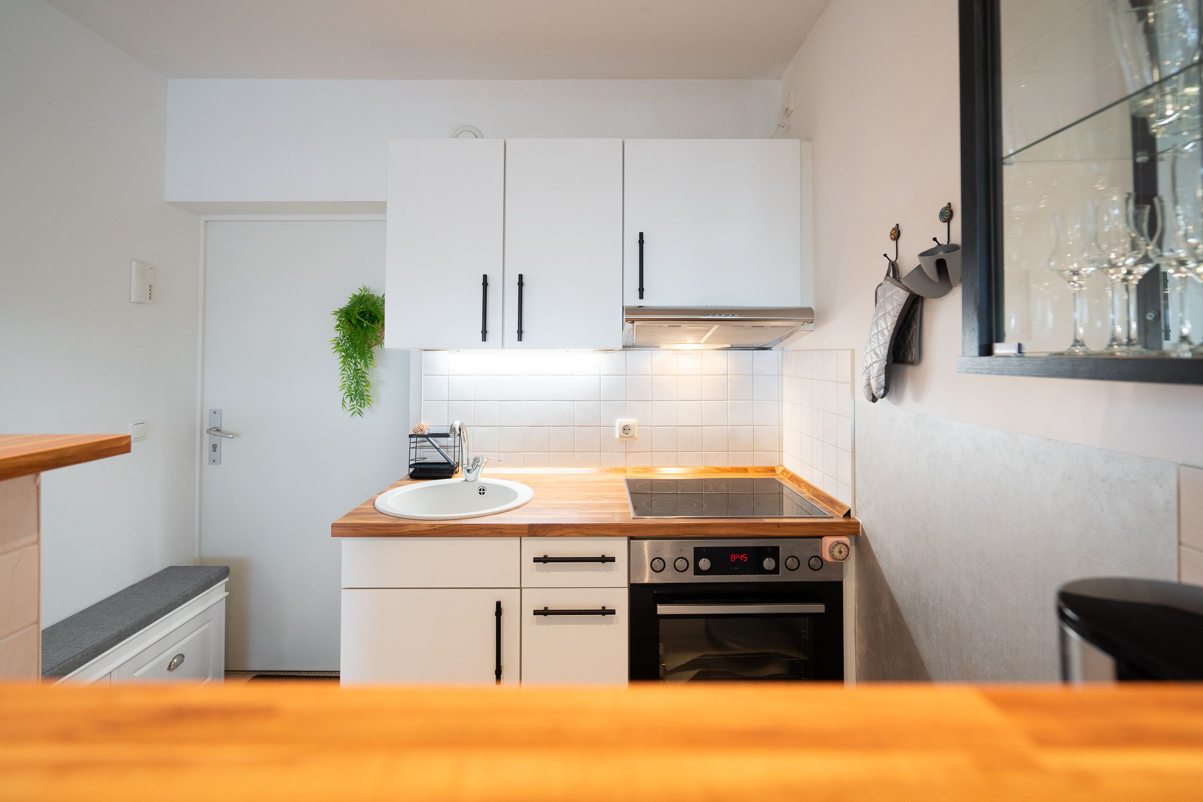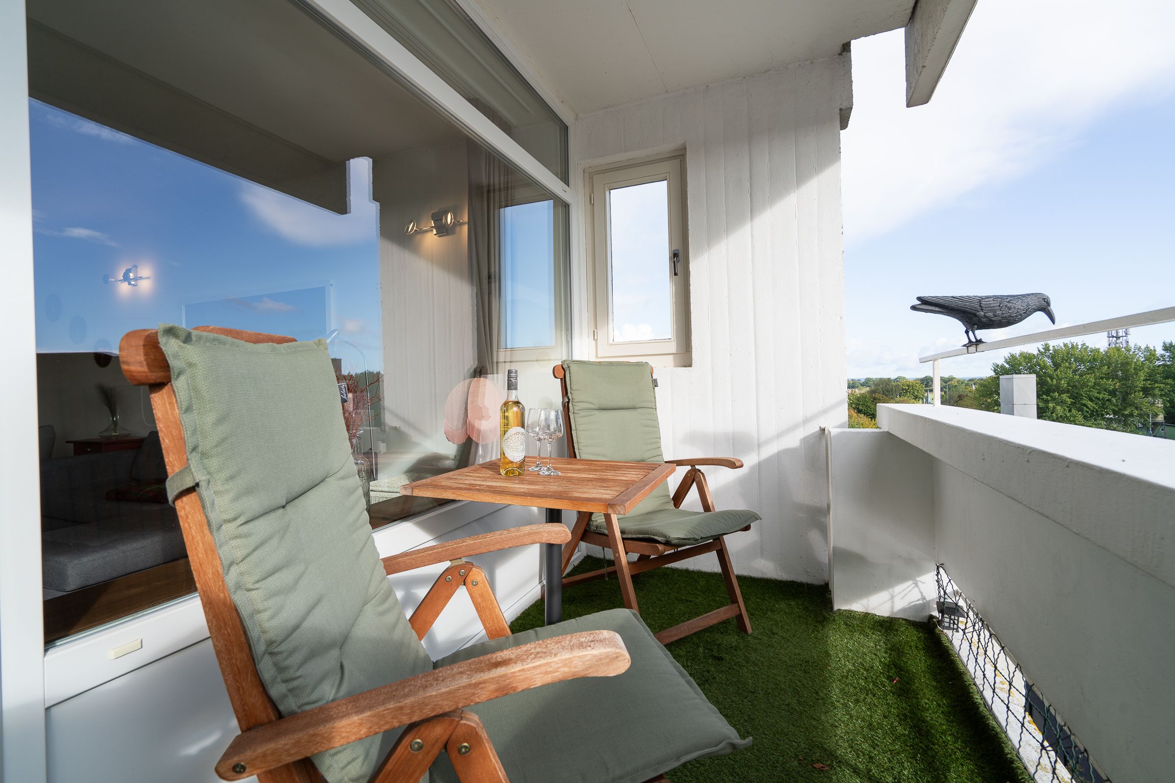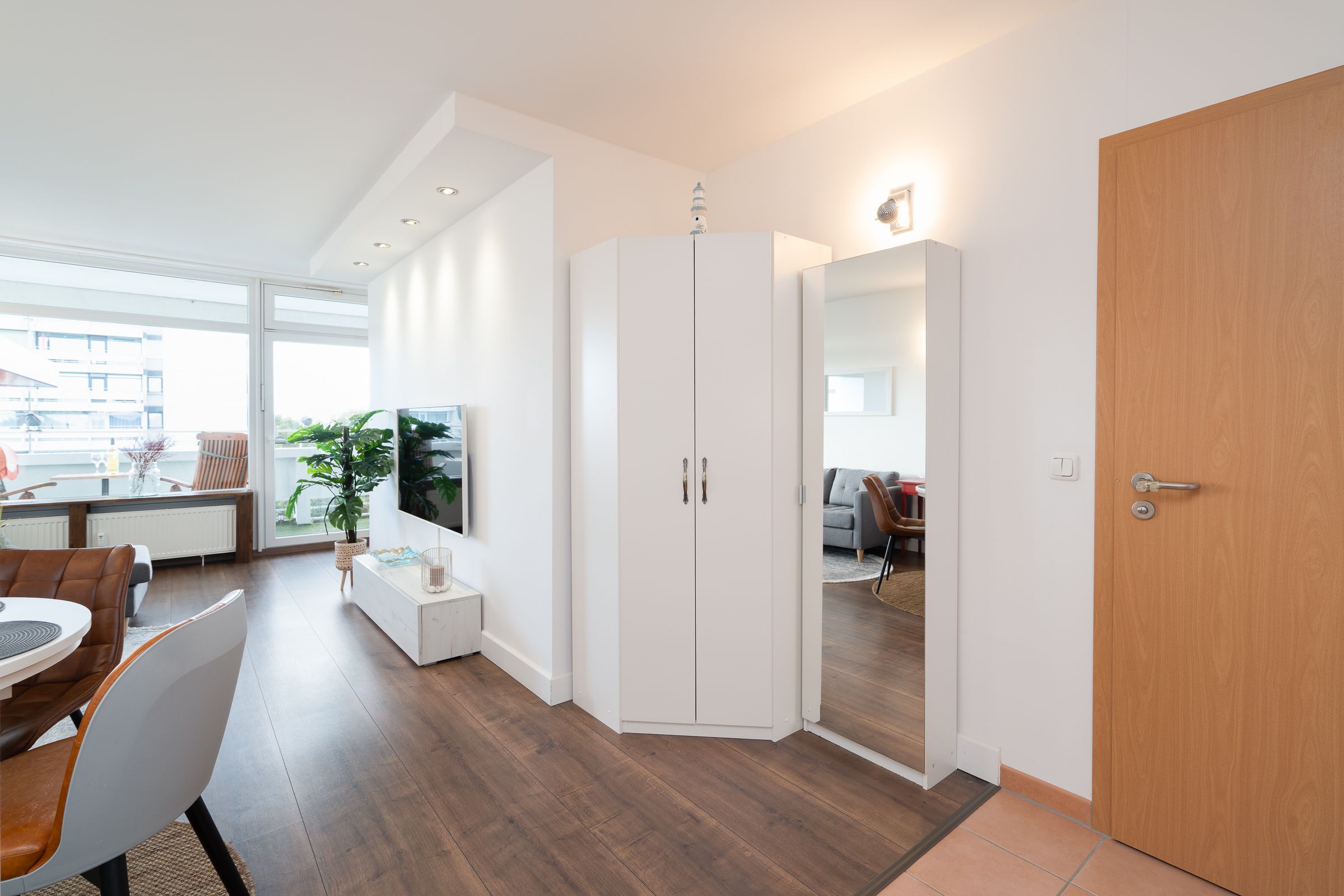 Das Apartment ist etwa 50 m² groß und ist für bis zu drei Personen geeignet. Der Wohnbereich ist sehr hell und wohnlich eingerichtet. Die offene Küche ist zum Wohnzimmer hin ausgerichtet und mit Backofen und Herd ausgestattet, sodass Sie sich in Ihrem Urlaub mühelos selbst versorgen können. Eine Spülmaschine ist in der kleinen Abstellkammer untergebracht. Ein Esstisch bietet ausreichend Platz für gemeinsame Mahlzeiten. Der angrenzende, überdachte Balkon lädt mit einem schönen Blick auf die Umgebung und bequemen Gartenmöbeln zum Verweilen ein – hier können Sie entspannen, lesen oder einfach die frische Ostseeluft genießen.