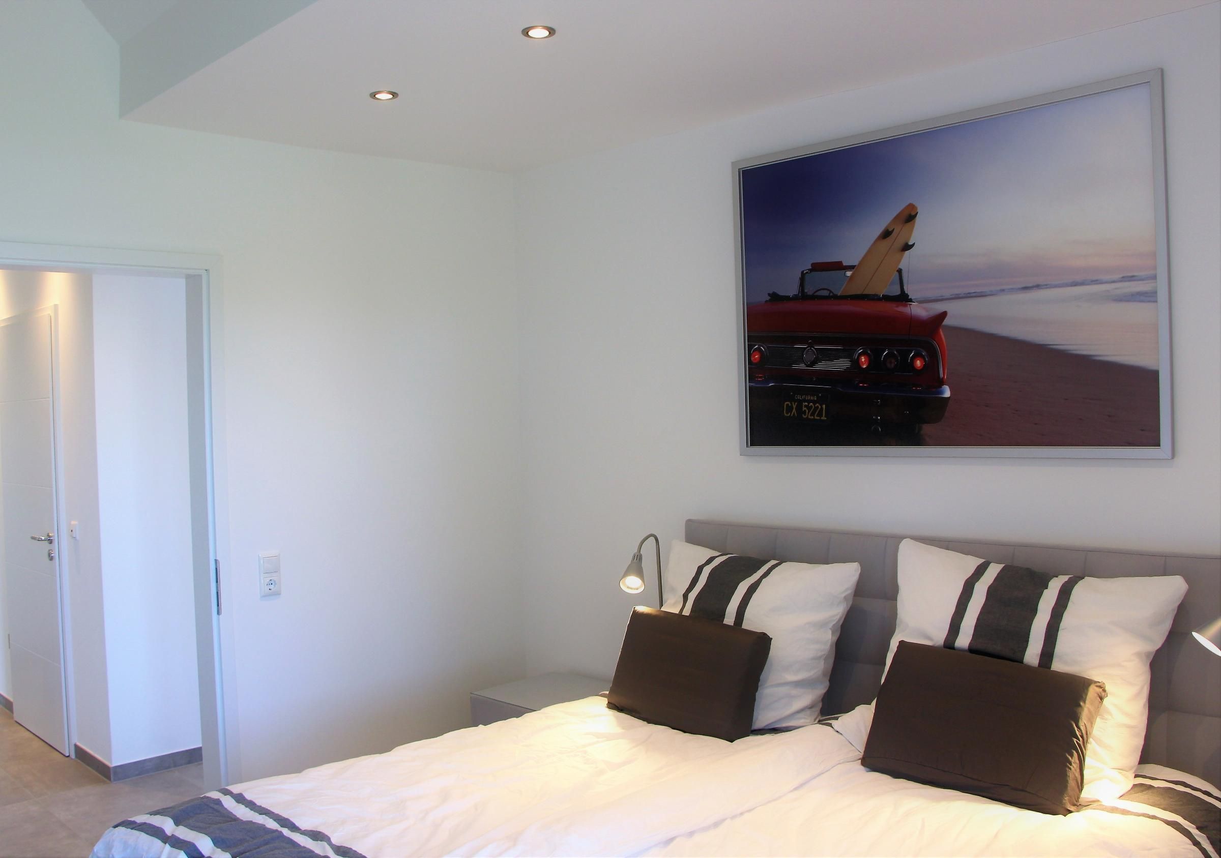 Zurück in den Flur geht es geradeaus in das zweite Schlafzimmer mit Doppel-Boxspringbett, großem Kleiderschrank und Flat-TV für beste Unterhaltung. Auch von diesem Schlafzimmer haben Sie selbstverständlich Meerblick! Nebenan befindet sich das zweite, komfortable Duschbad mit WC.