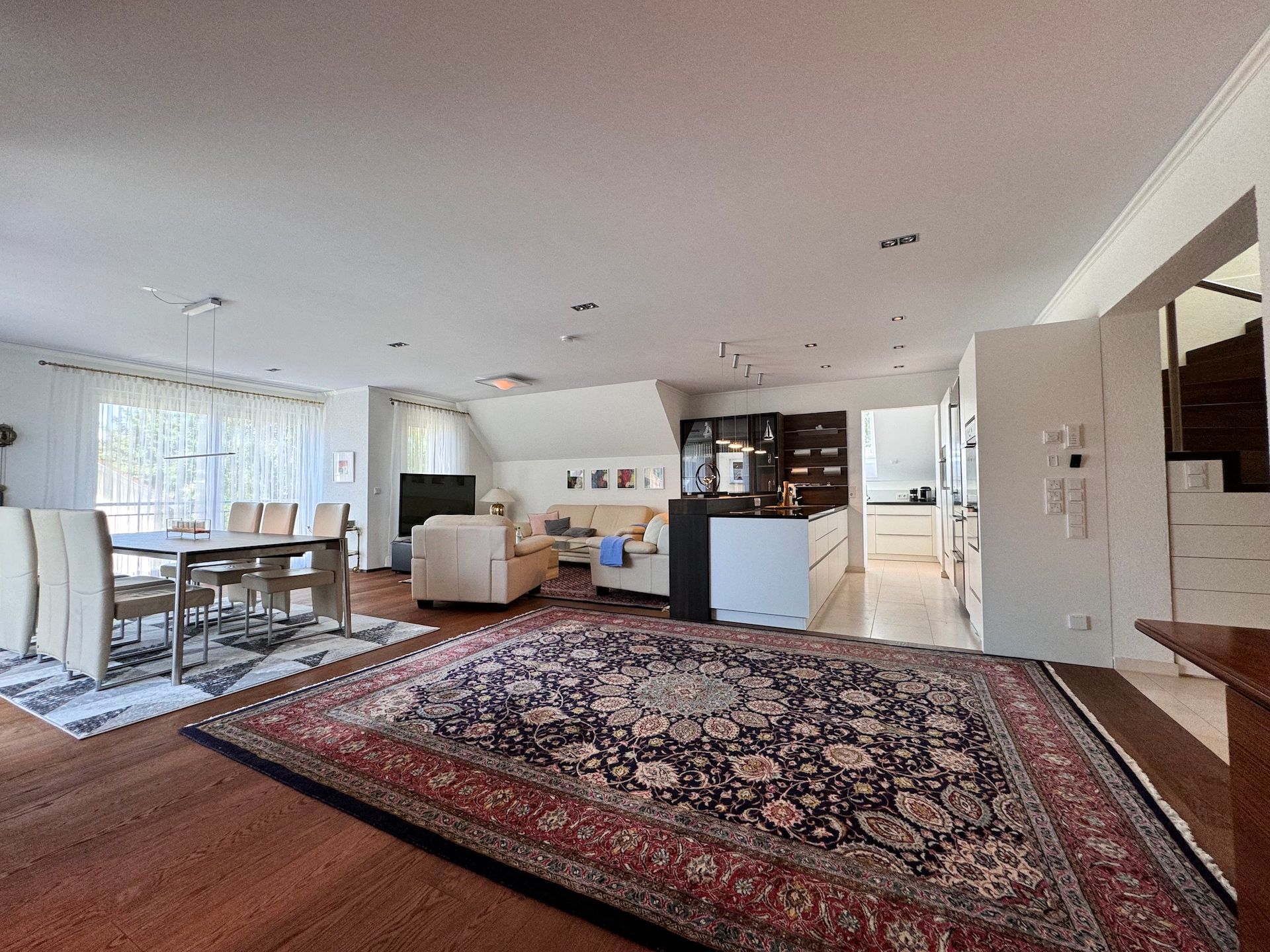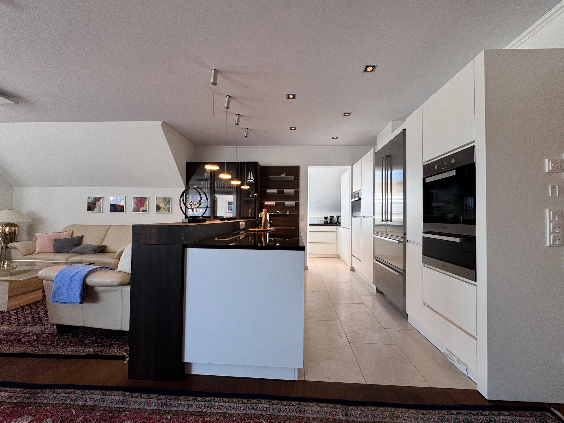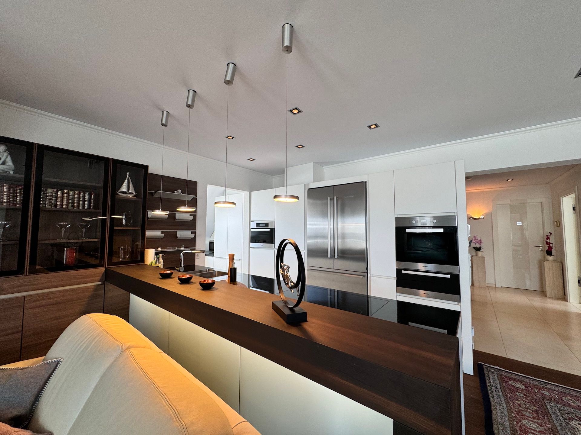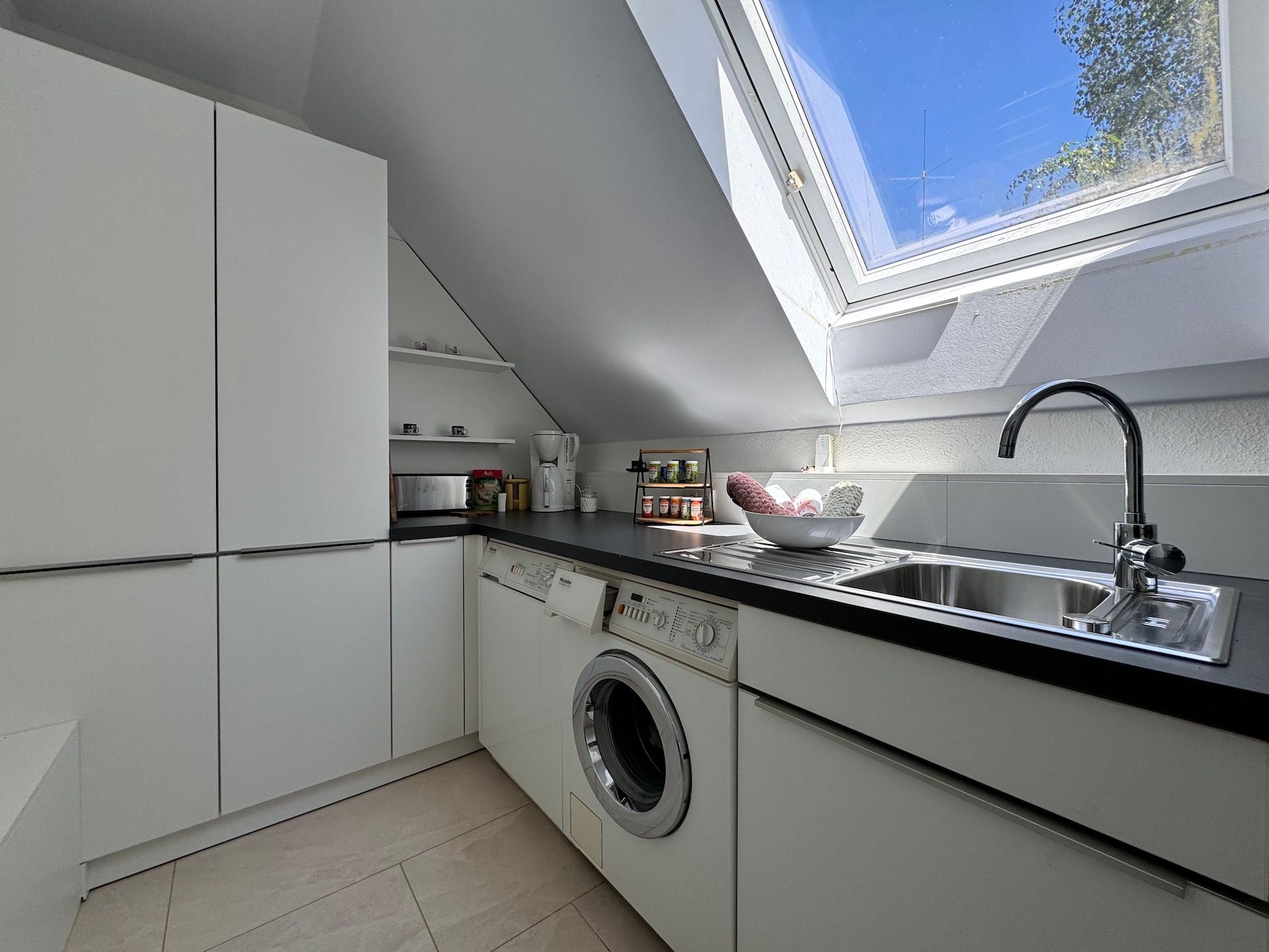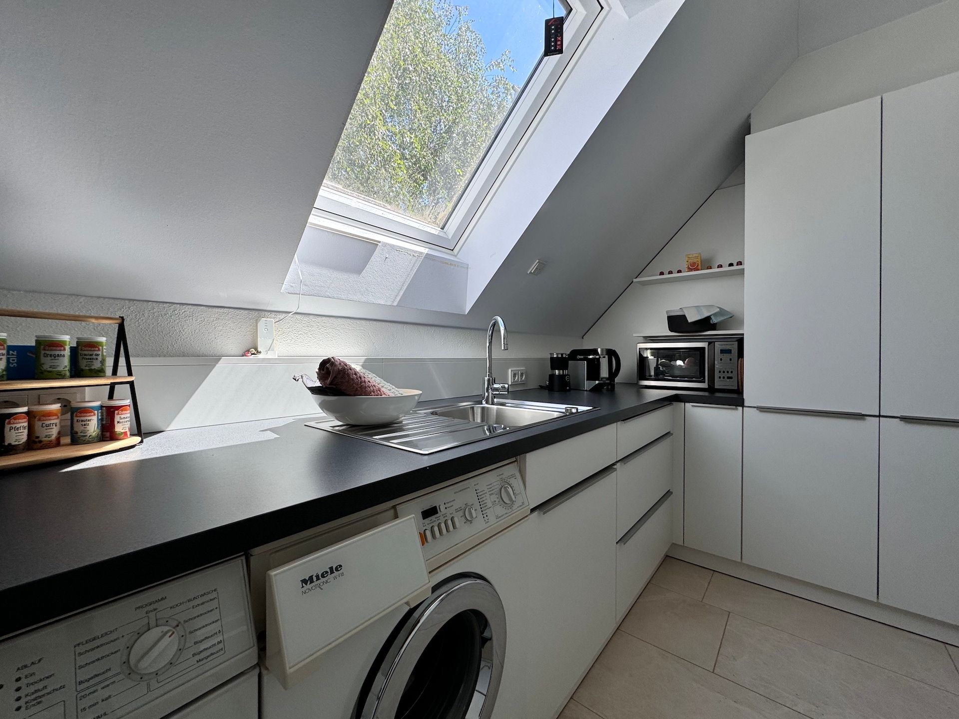 Die offene Küche ist mit modernen Geräten ausgestattet und lässt keine Wünsche offen. Hier finden Sie alles, was Sie für die Zubereitung Ihrer Lieblingsgerichte benötigen: von einem Induktionsherd und einer Spülmaschine bis hin zu einem Kaffeevollautomaten und einer Mikrowelle. Genießen Sie Ihre Mahlzeiten auf dem überdachten Balkon oder auf der großzügigen Terrasse, wo Gartenmöbel und Grill für gesellige Abende im Freien zur Verfügung stehen.