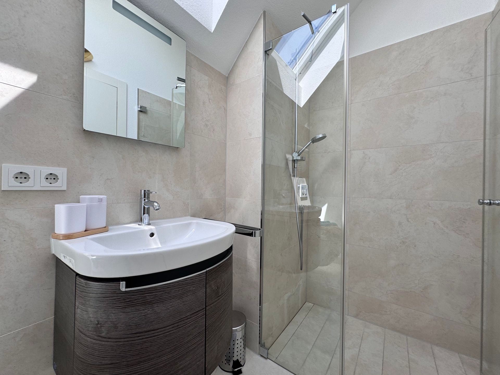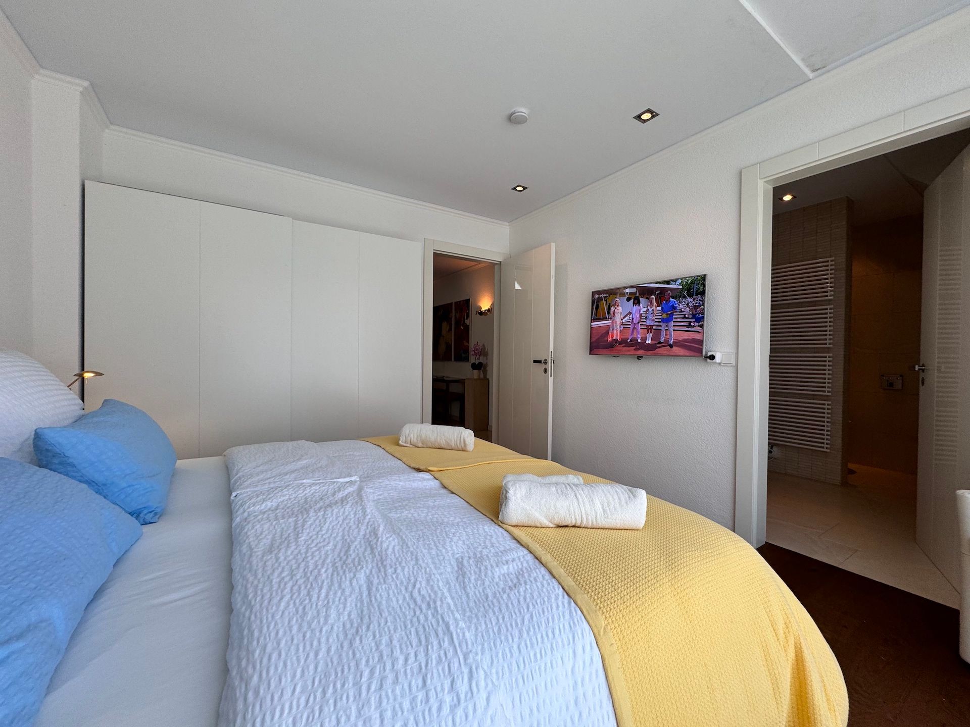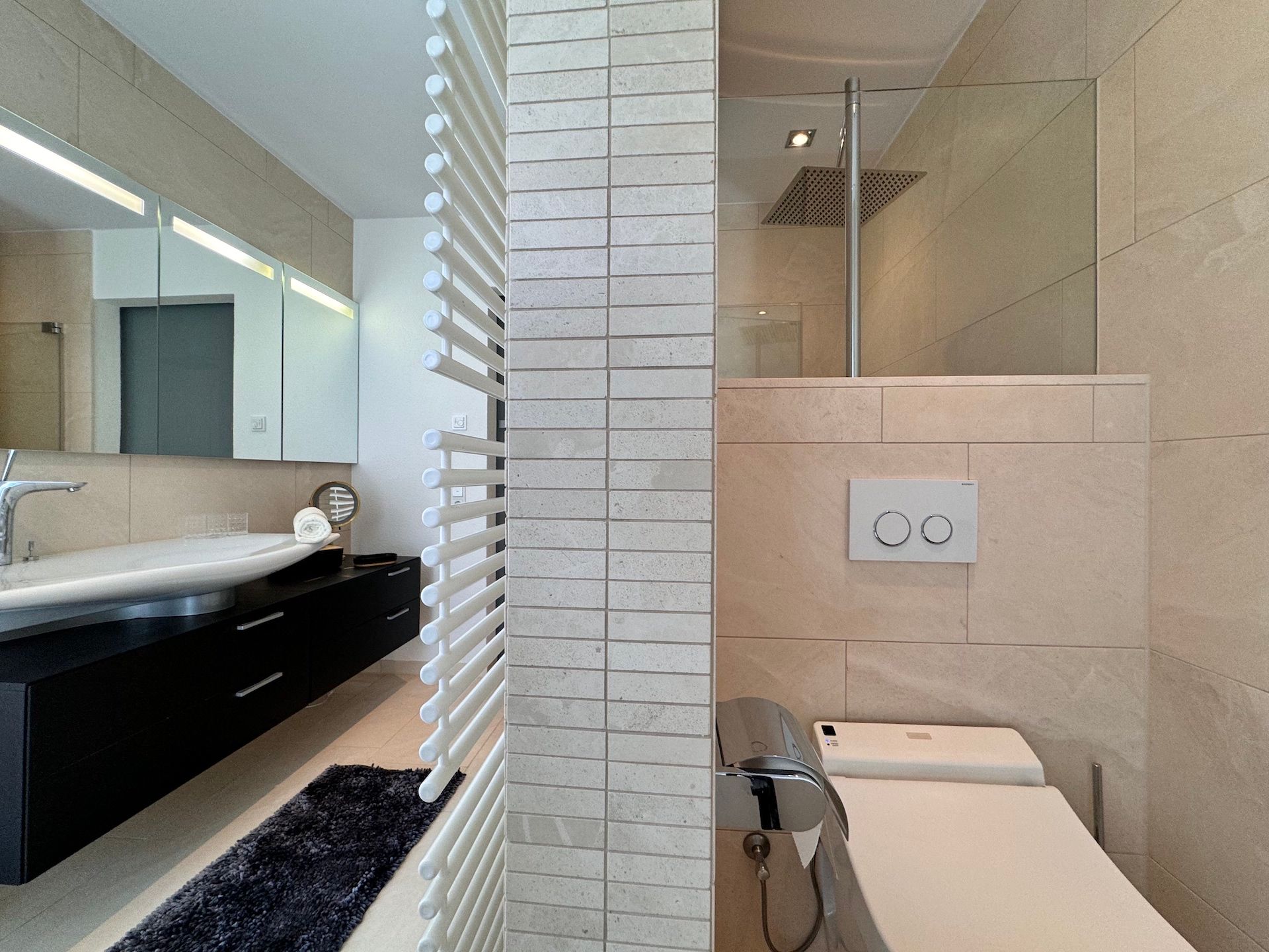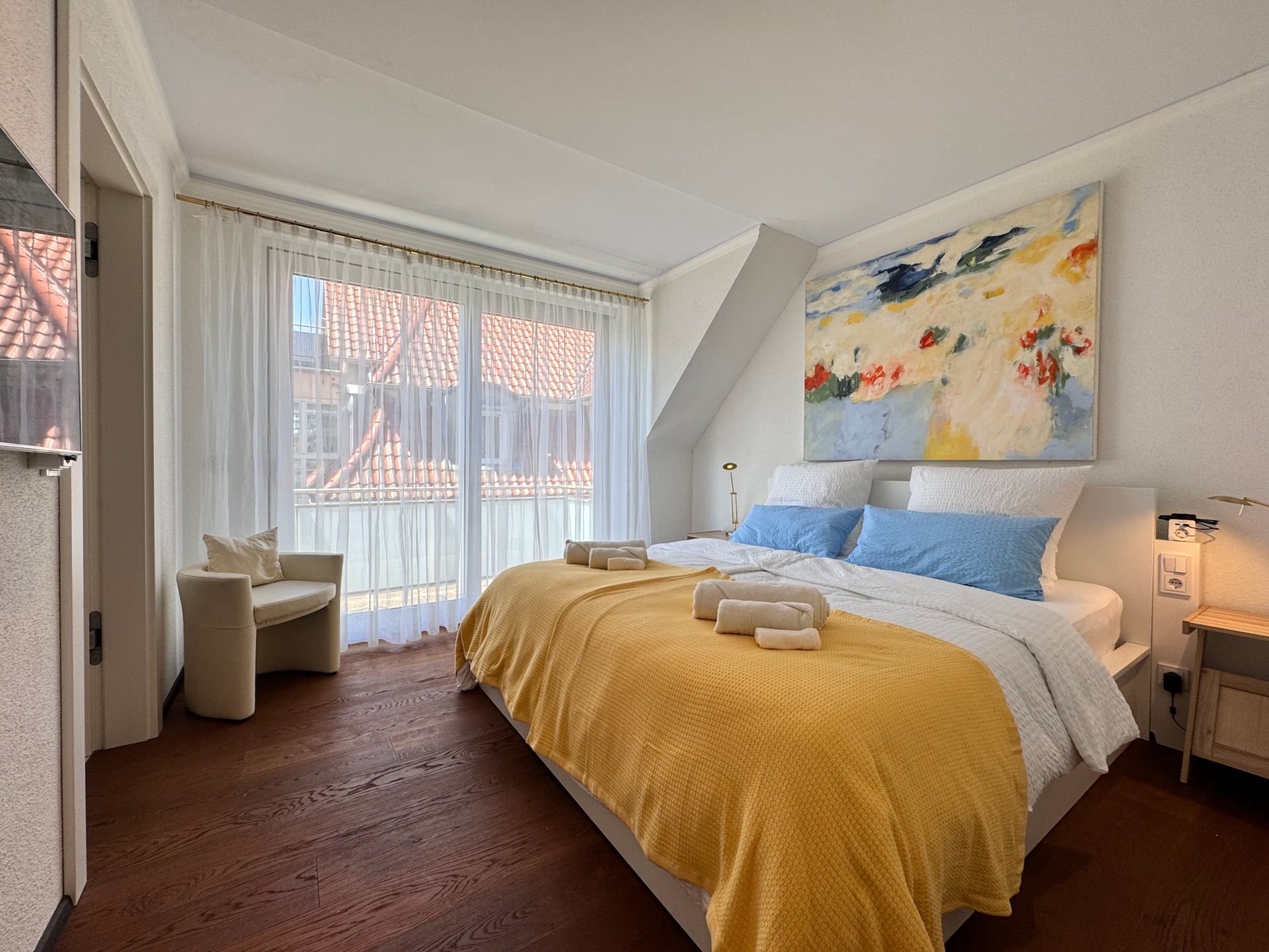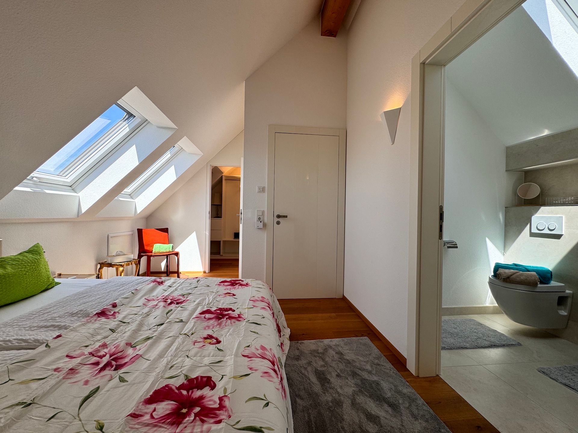 Die Schlafzimmer der Unterkunft sind ruhige Rückzugsorte, die ebenfalls mit Parkettboden ausgestattet sind und ausreichend Stauraum bieten. Zwei der Badezimmer sind mit bodengleichen Duschen und einem Badewannenbereich versehen, während das dritte Badezimmer zusätzlichen Komfort für Ihre Gäste bereithält. Jeder Raum ist mit einem Haartrockner, einem Waschbecken und Kosmetikspiegel ausgestattet, um Ihren Aufenthalt so angenehm wie möglich zu gestalten.