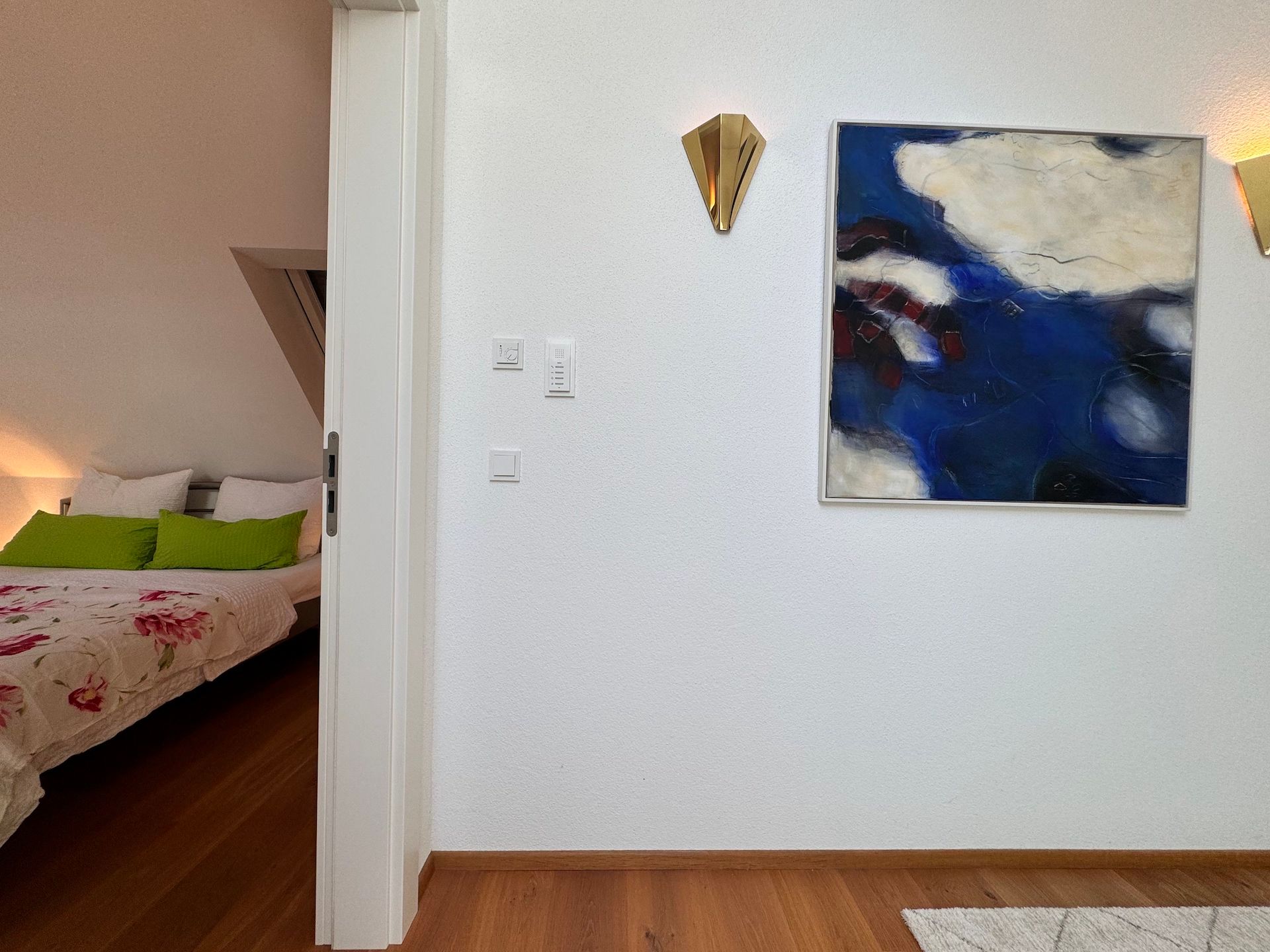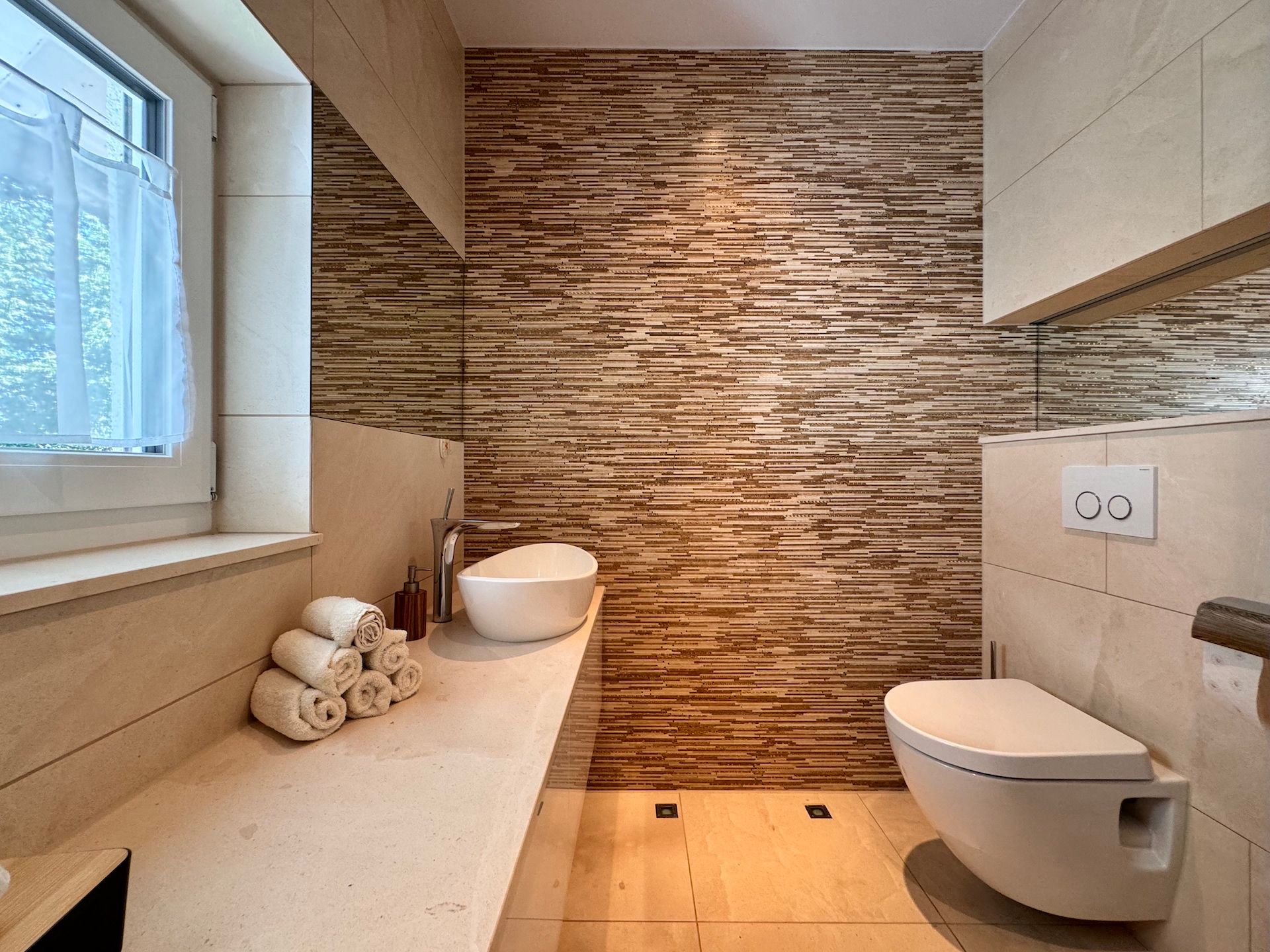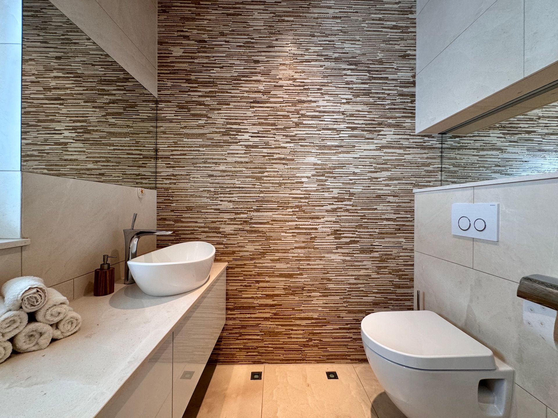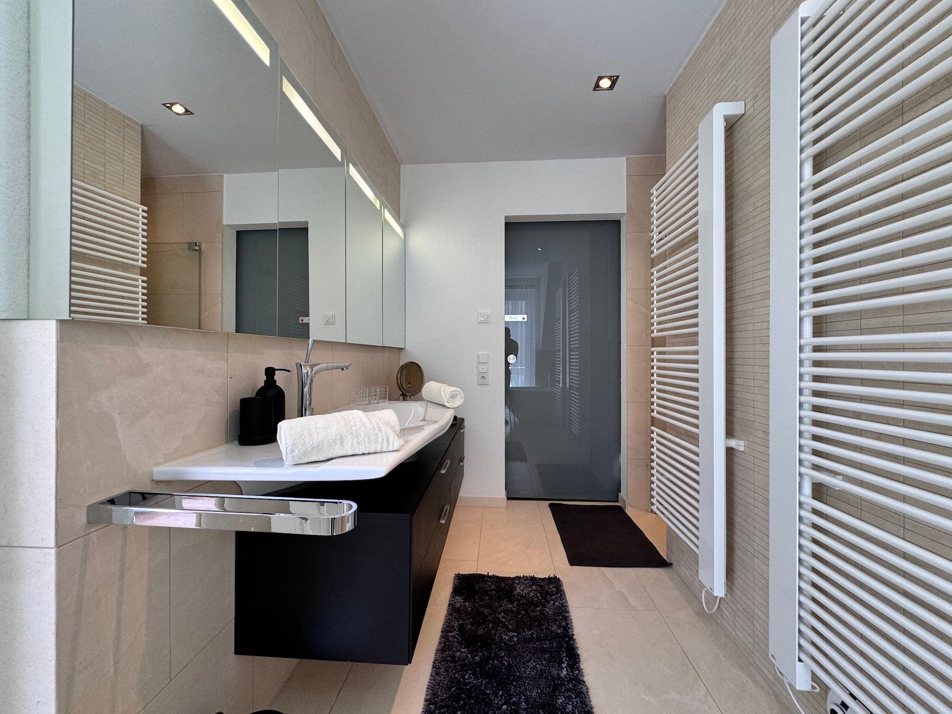 Die Schlafzimmer der Unterkunft sind ruhige Rückzugsorte, die ebenfalls mit Parkettboden ausgestattet sind und ausreichend Stauraum bieten. Zwei der Badezimmer sind mit bodengleichen Duschen und einem Badewannenbereich versehen, während das dritte Badezimmer zusätzlichen Komfort für Ihre Gäste bereithält. Jeder Raum ist mit einem Haartrockner, einem Waschbecken und Kosmetikspiegel ausgestattet, um Ihren Aufenthalt so angenehm wie möglich zu gestalten.