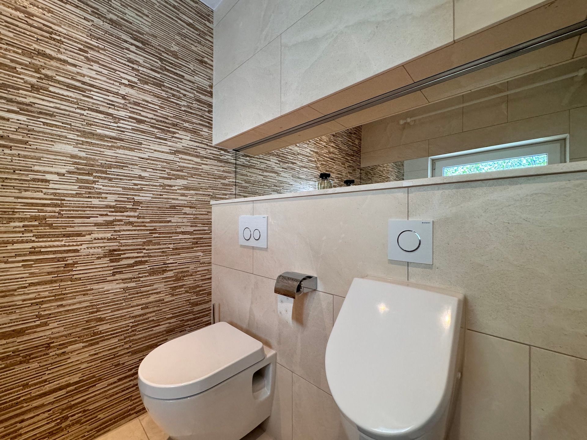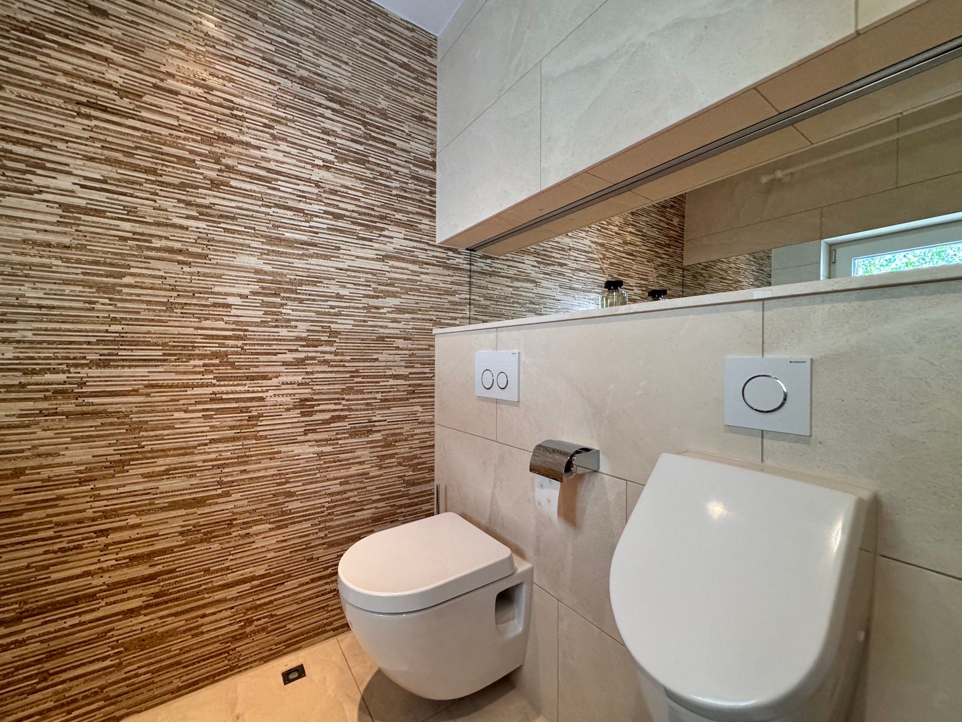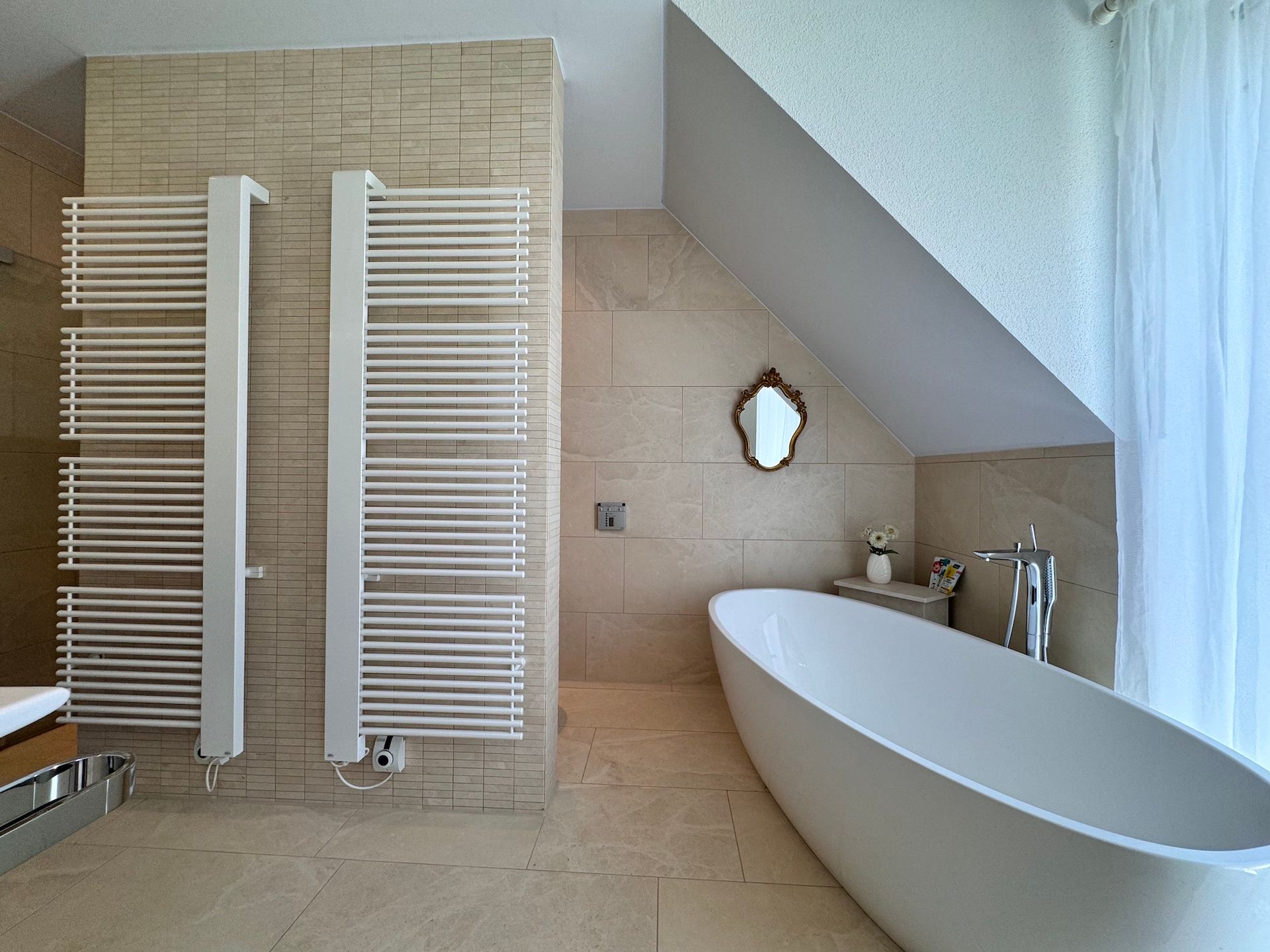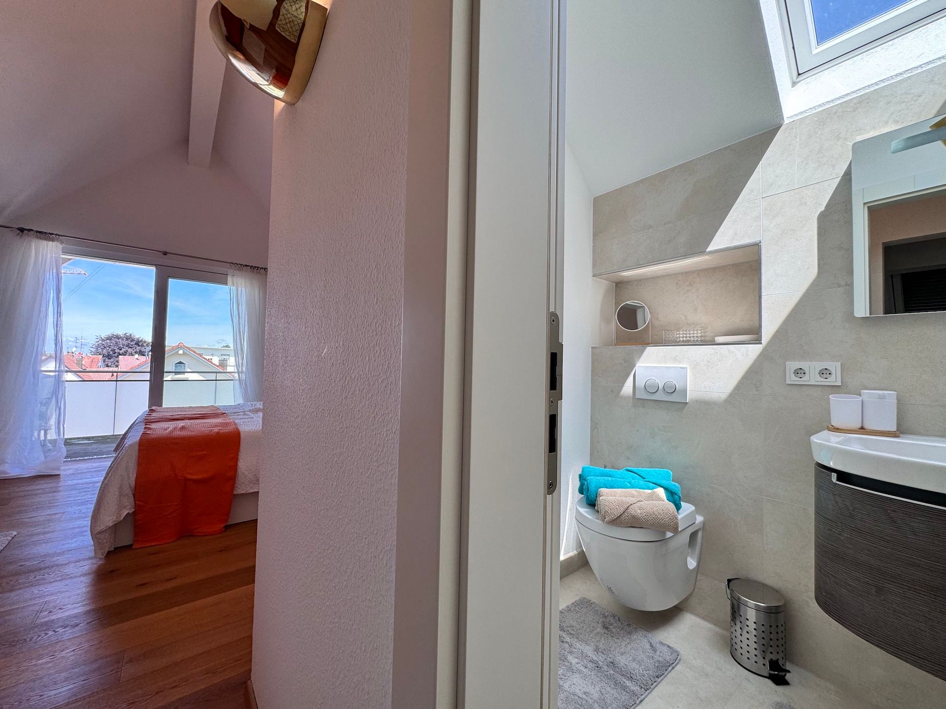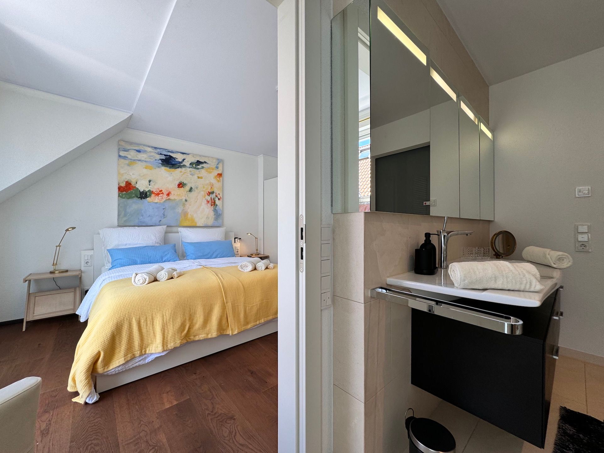 Die Schlafzimmer der Unterkunft sind ruhige Rückzugsorte, die ebenfalls mit Parkettboden ausgestattet sind und ausreichend Stauraum bieten. Zwei der Badezimmer sind mit bodengleichen Duschen und einem Badewannenbereich versehen, während das dritte Badezimmer zusätzlichen Komfort für Ihre Gäste bereithält. Jeder Raum ist mit einem Haartrockner, einem Waschbecken und Kosmetikspiegel ausgestattet, um Ihren Aufenthalt so angenehm wie möglich zu gestalten.
