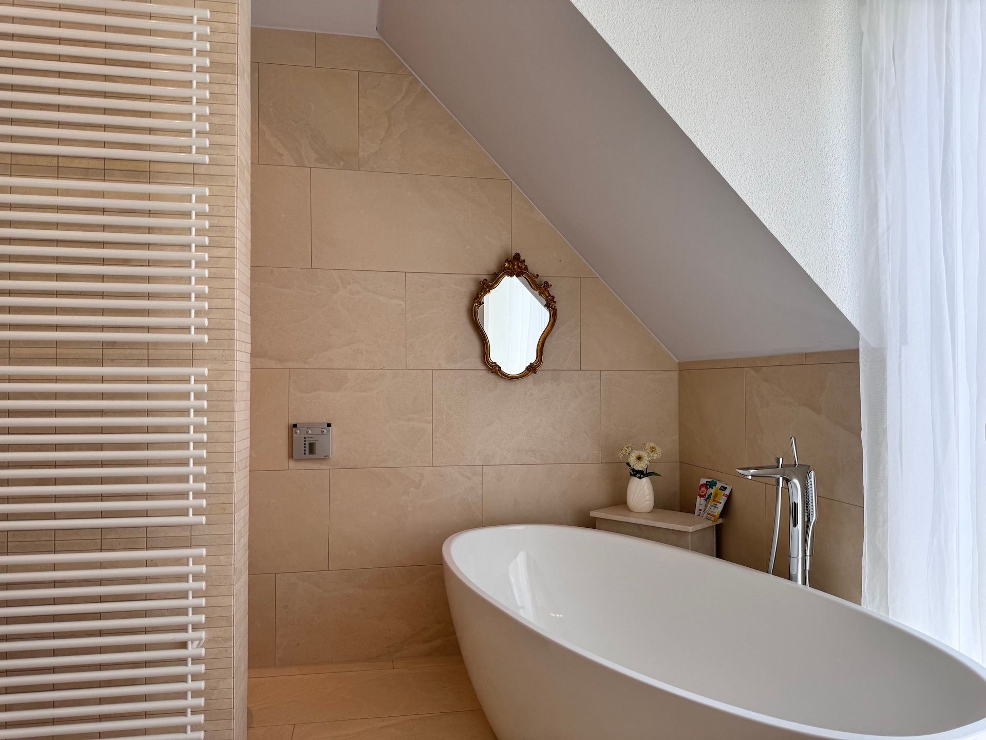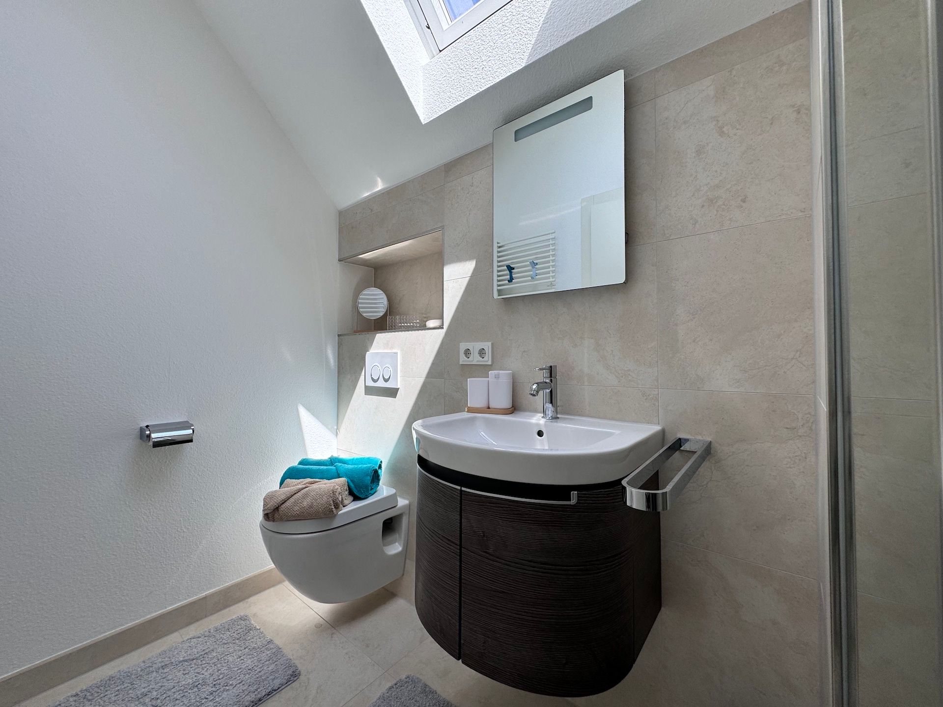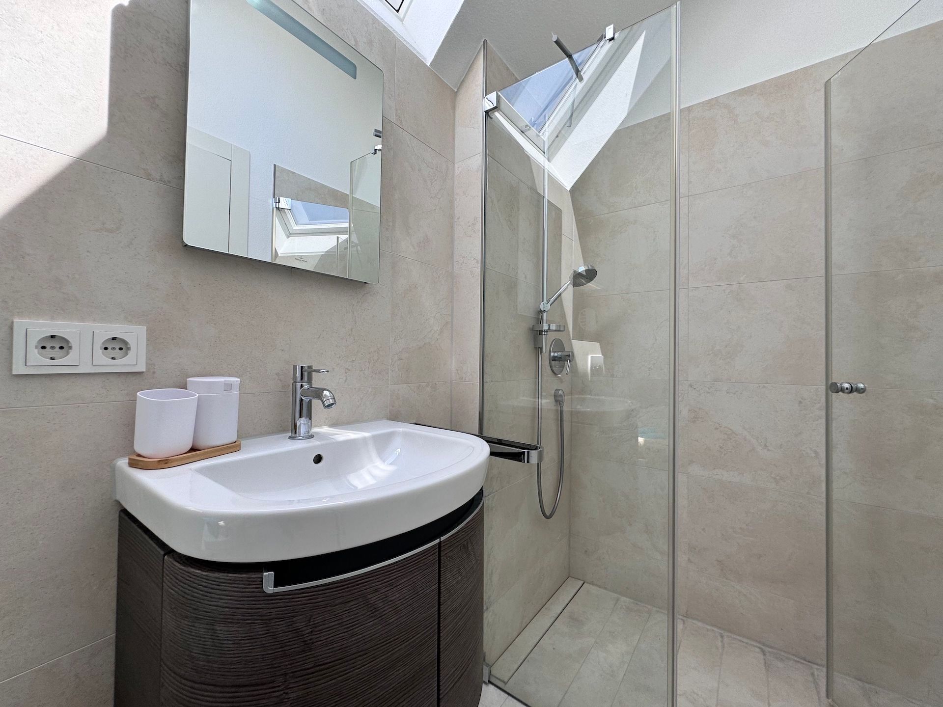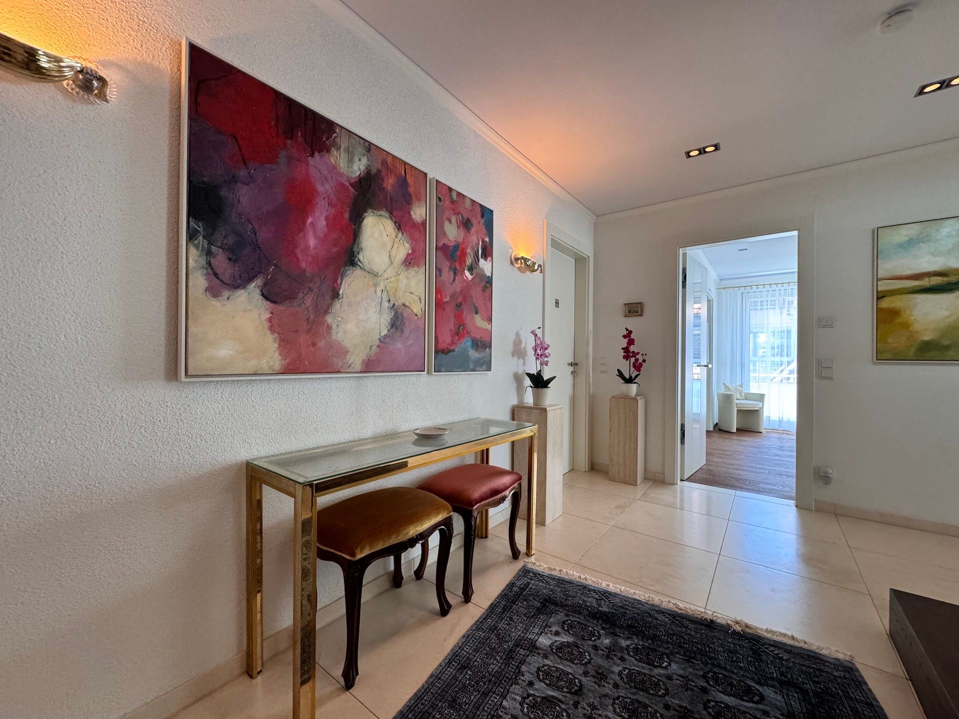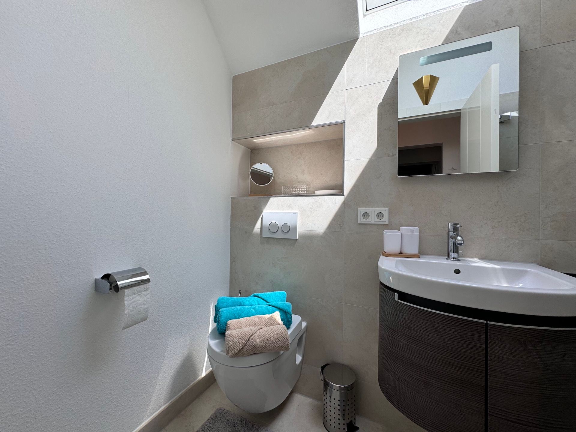 Die Schlafzimmer der Unterkunft sind ruhige Rückzugsorte, die ebenfalls mit Parkettboden ausgestattet sind und ausreichend Stauraum bieten. Zwei der Badezimmer sind mit bodengleichen Duschen und einem Badewannenbereich versehen, während das dritte Badezimmer zusätzlichen Komfort für Ihre Gäste bereithält. Jeder Raum ist mit einem Haartrockner, einem Waschbecken und Kosmetikspiegel ausgestattet, um Ihren Aufenthalt so angenehm wie möglich zu gestalten.