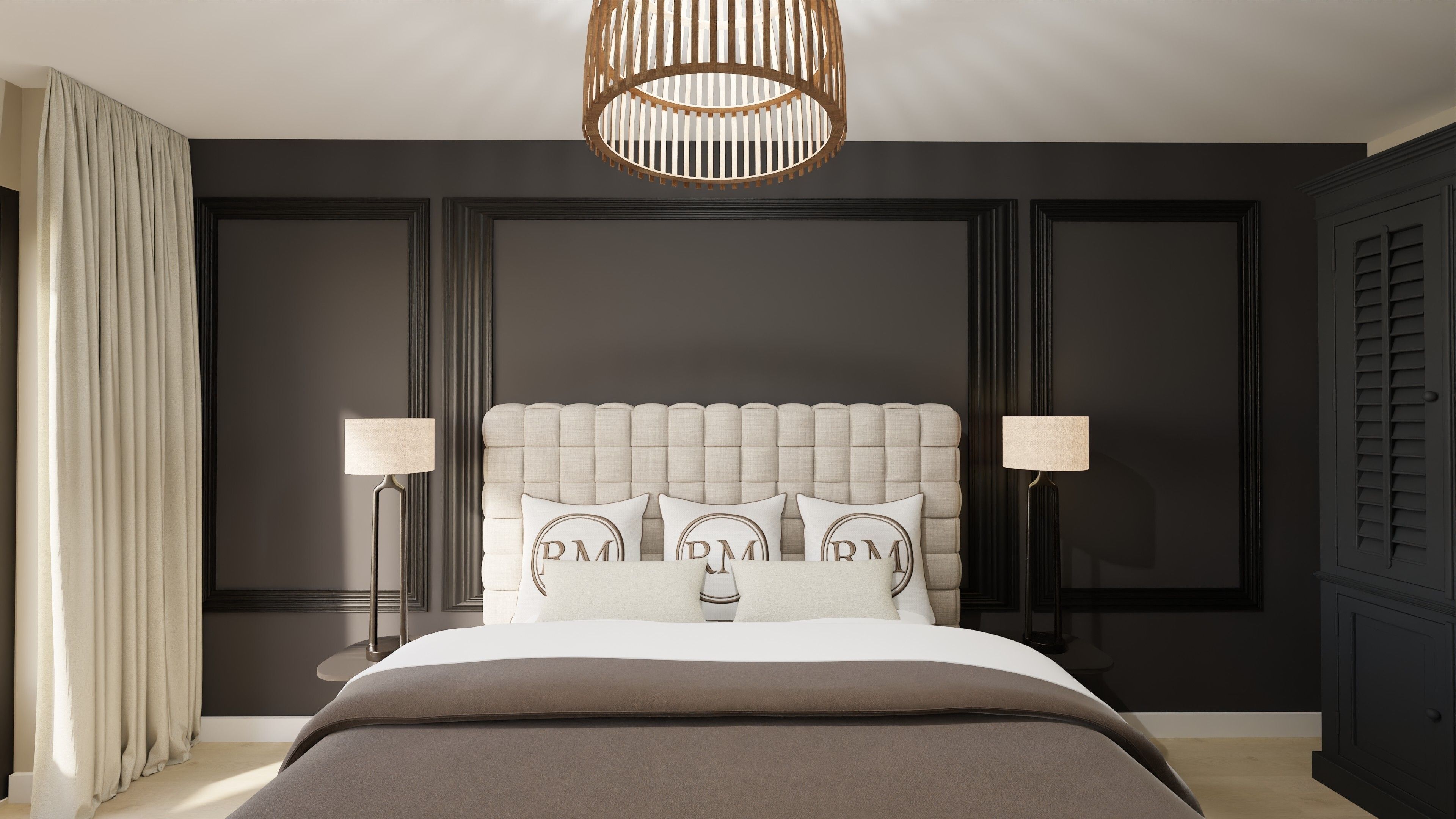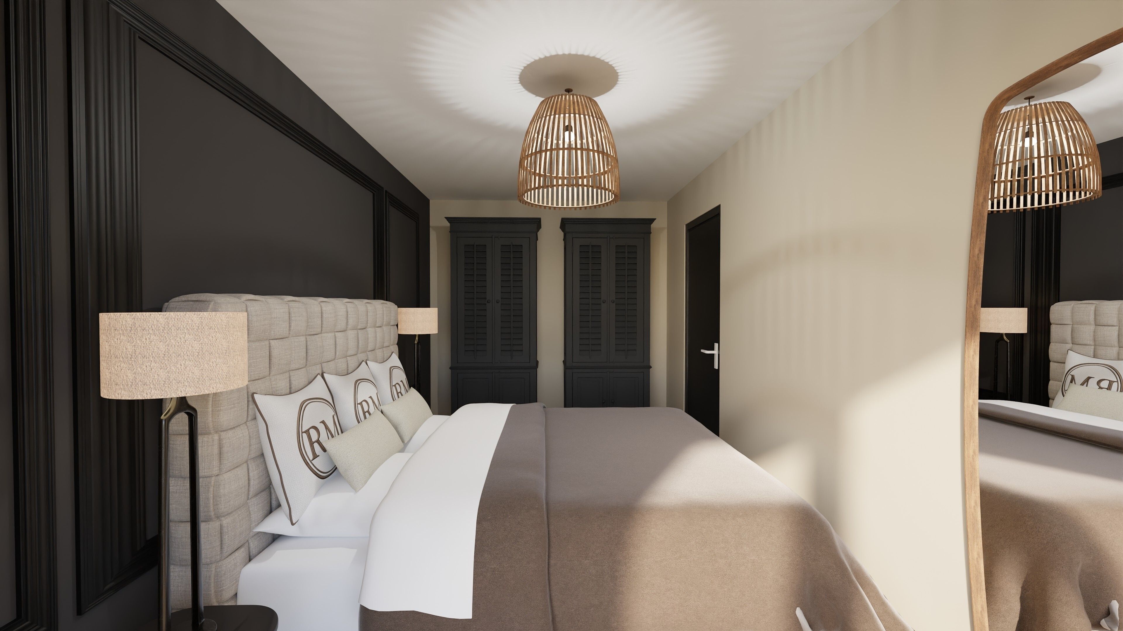 Das Schlafzimmer ist behaglich eingerichtet und mit Ganzkörperspiegel, Kommode und weiteren Stauraummöglichkeiten ausgestattet. Im Apartment stehen zwei moderne Bäder mit bodengleichen Duschen zur Verfügung, jeweils mit Waschbecken, Spiegel, Kosmetikspiegel und Haartrockner. Dies sorgt für höchsten Komfort und Flexibilität – auch bei gemeinsam reisenden Gästen.