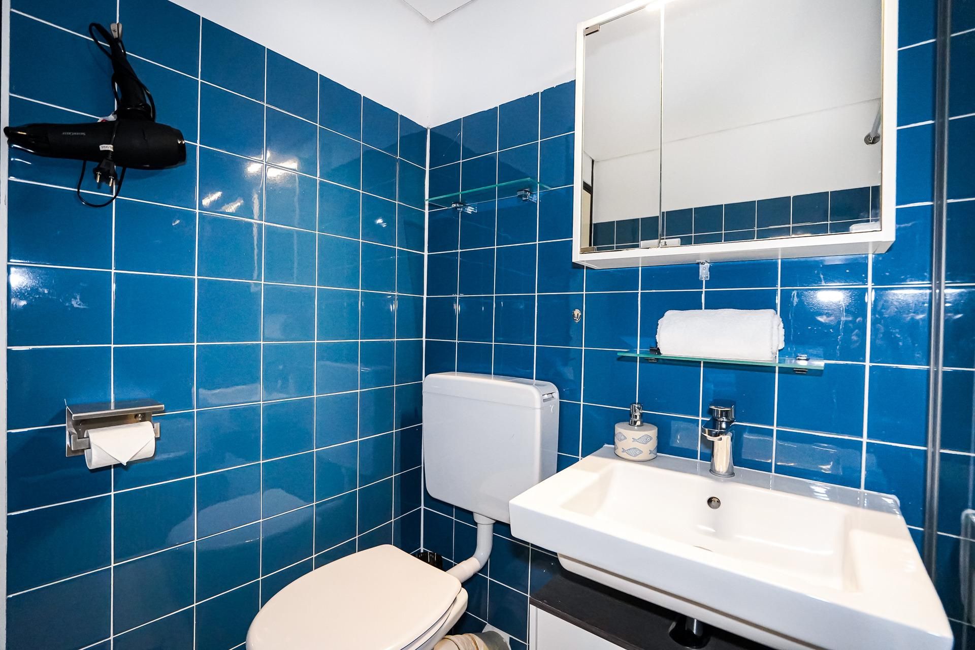Das himmelblaue Badezimmer ist mit einer Badewanne und Duschabtrennung ausgestattet und ist auch für die Kleinen gewappnet (Toilettensitz, kleiner Tritt, Kindersicherungen).