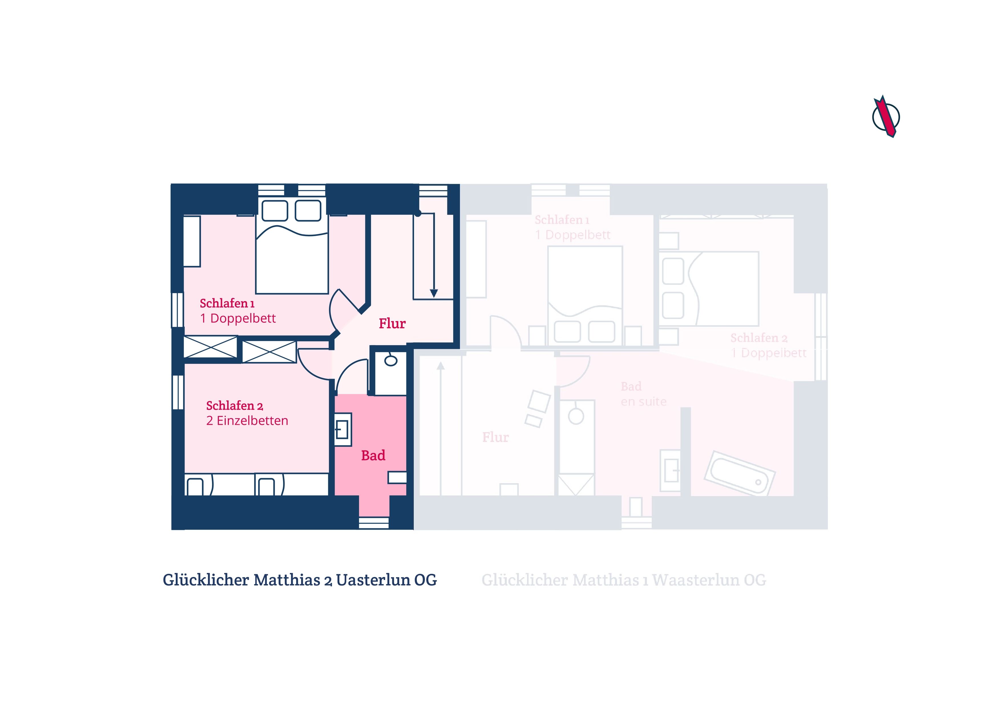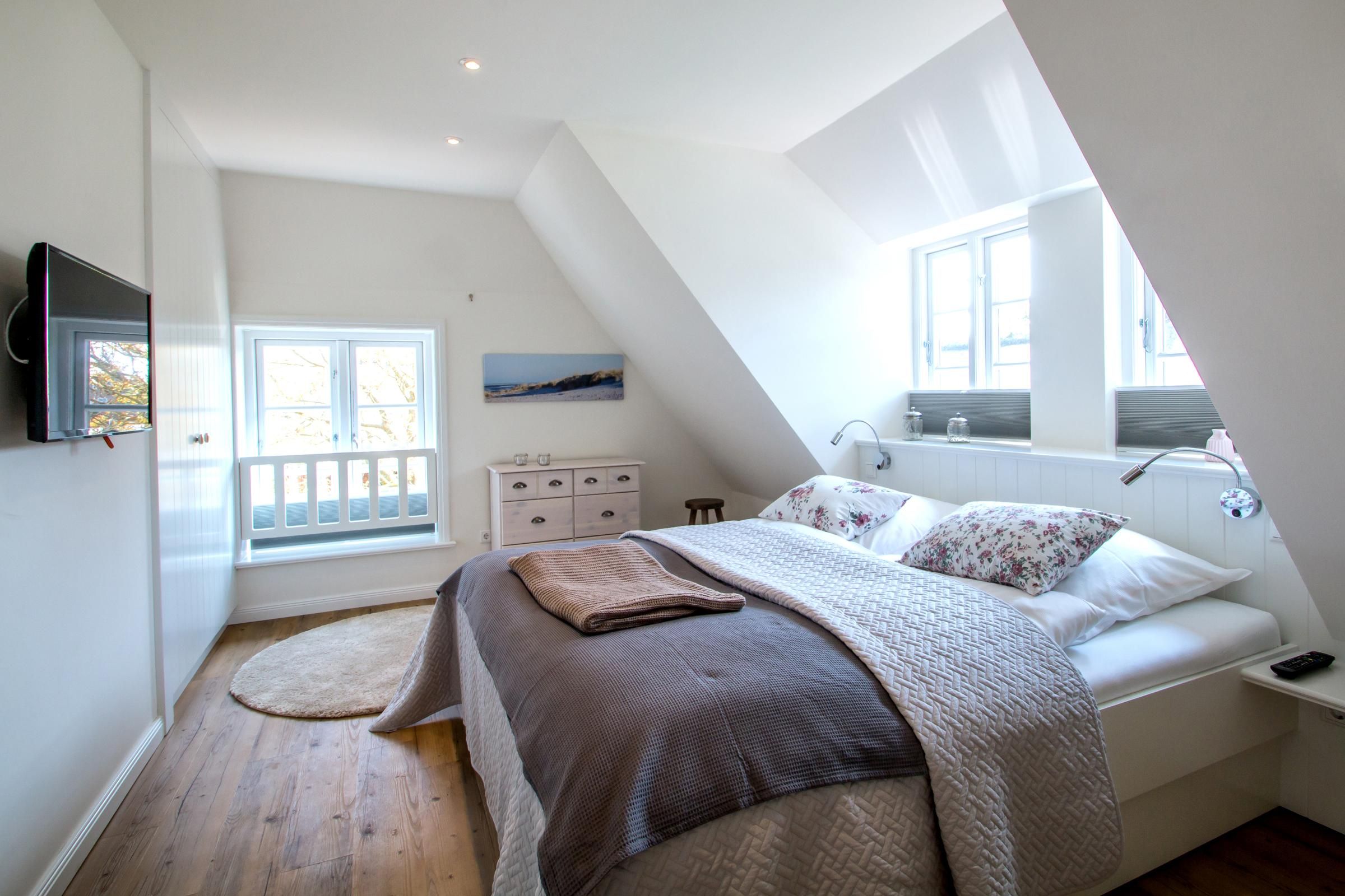Im Obergeschoss befinden sich die beiden Schlafzimmer sowie ein Bad mit bodengleicher Dusche. Im großen Schlafzimmer befindet sich ein Doppelbett, im kleineren Schlafzimmer befinden sich zwei Einzelbetten. Achtung, die von hiesigen Tischlern gefertigten Einzelbetten weisen eine Länge von 1,90 m auf.