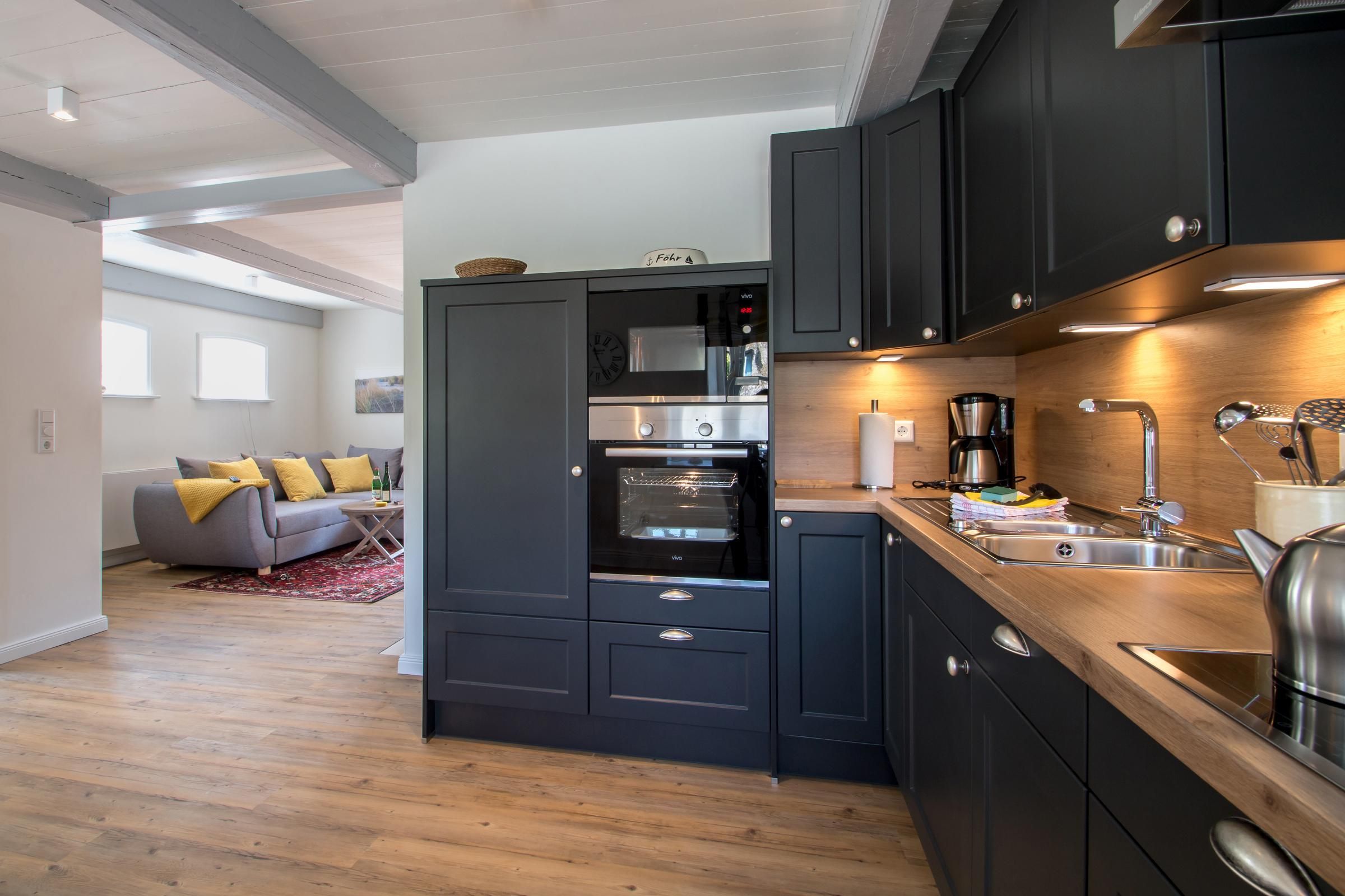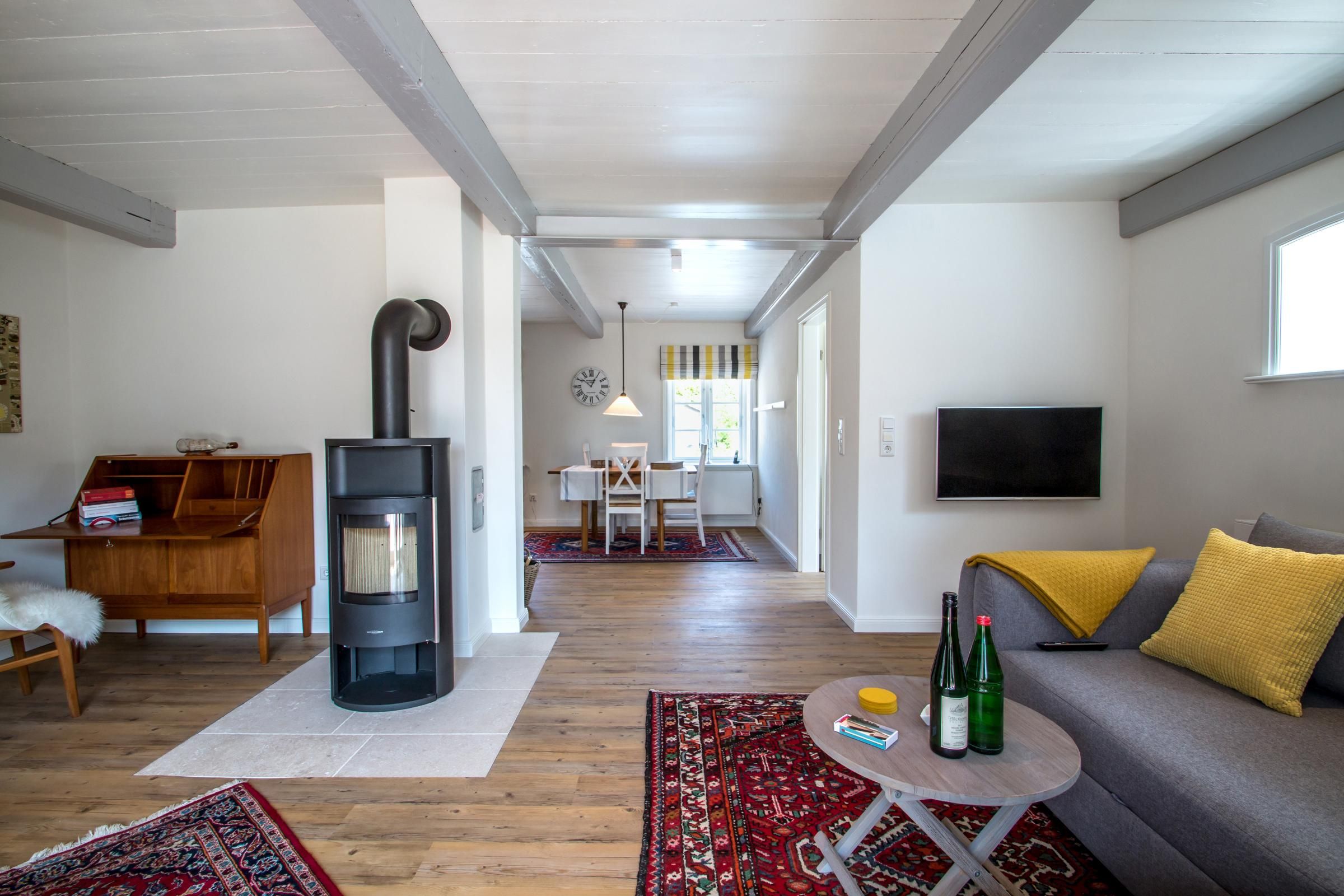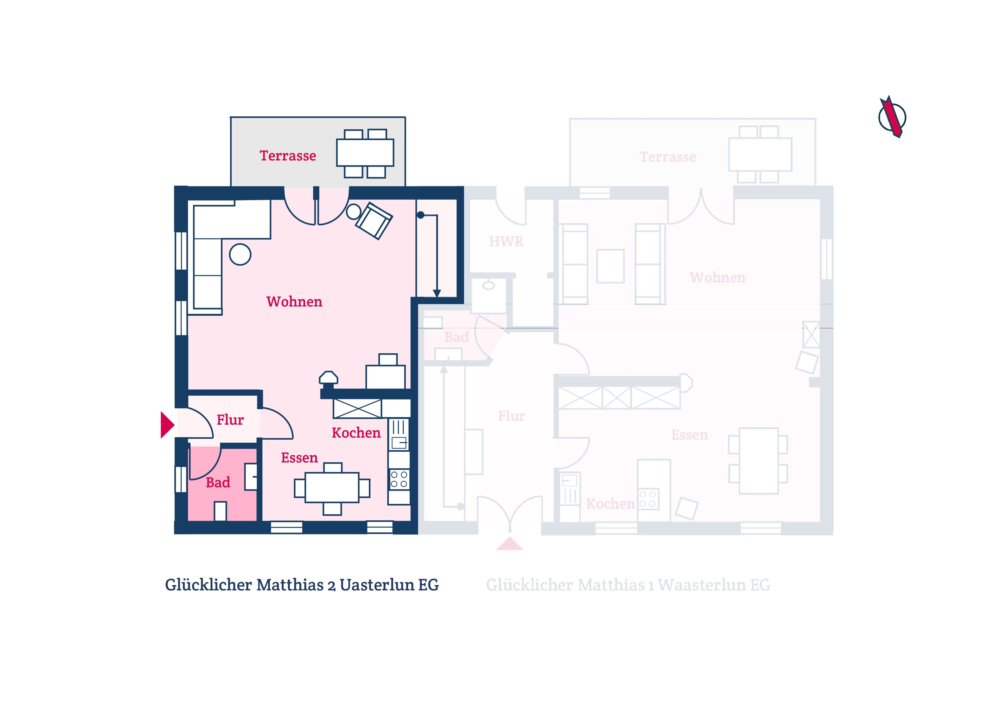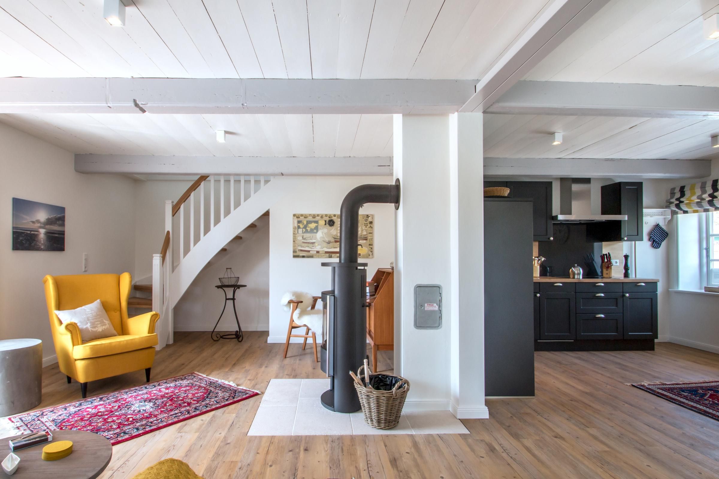 Im Erdgeschoss der Wohnung Uasterlun (zu deutsch Osterland) befindet sich ein großzügiger Wohn-/Essbereich mit Ofen und angrenzender Küche. Ein Gäste-WC finden Sie hier ebenfalls vor.