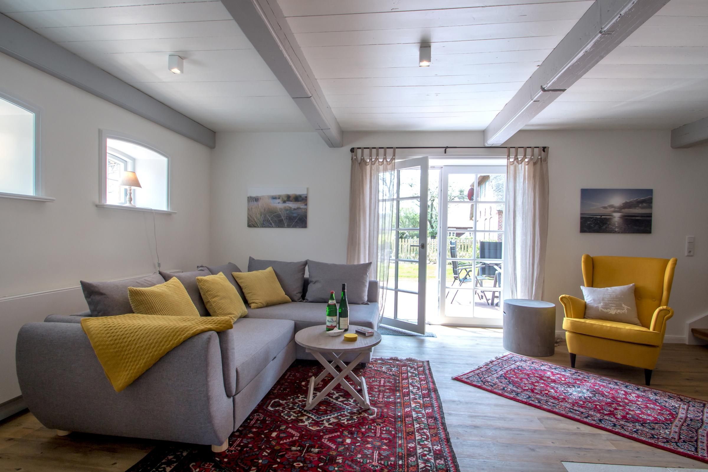 Unser Reethus verfügt über zwei Wohnungen mit separaten Eingängen. Jede Wohnung verfügt über einen Gartenanteil inklusive einer Terrasse und einem Strandkorb.