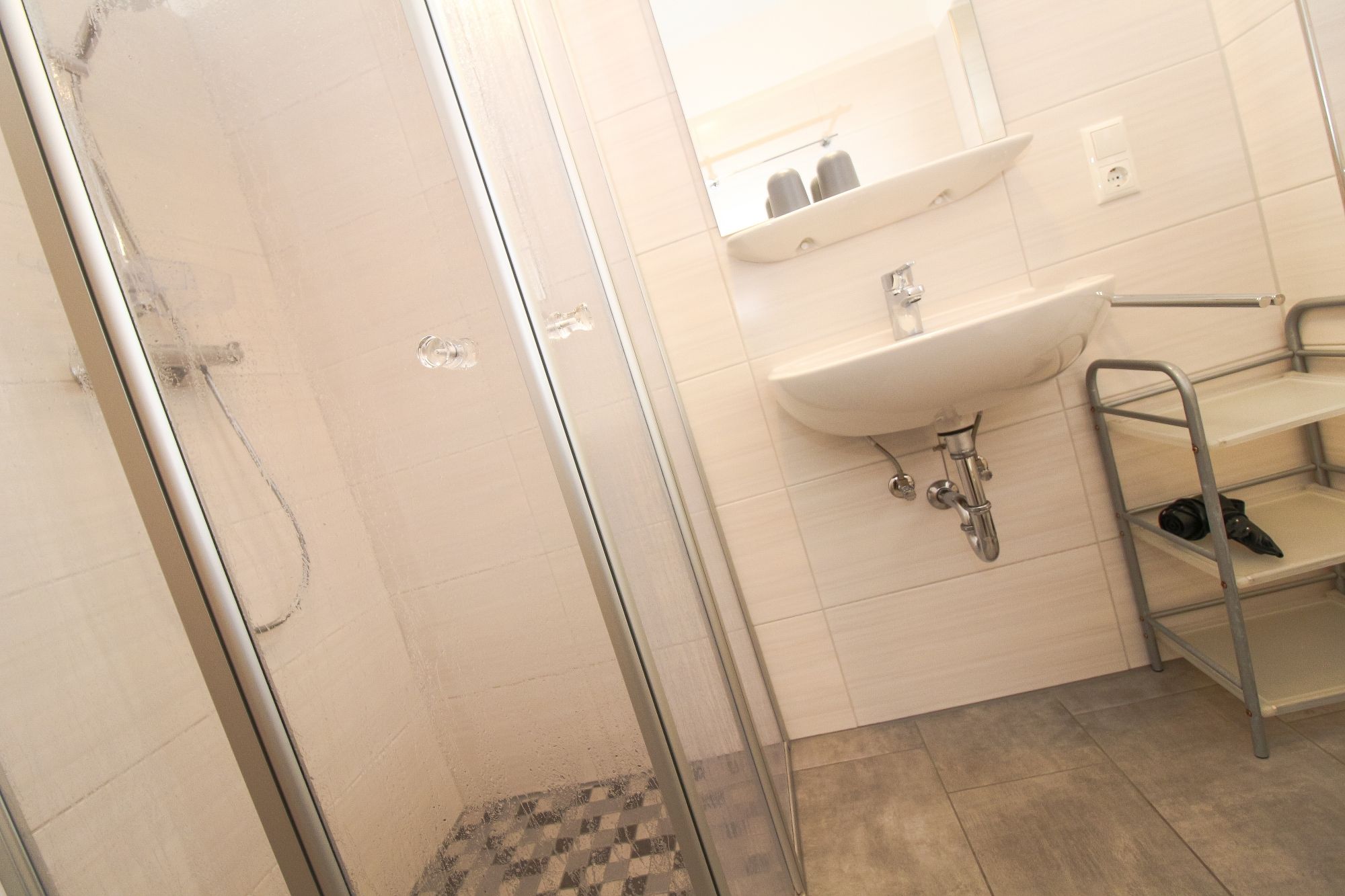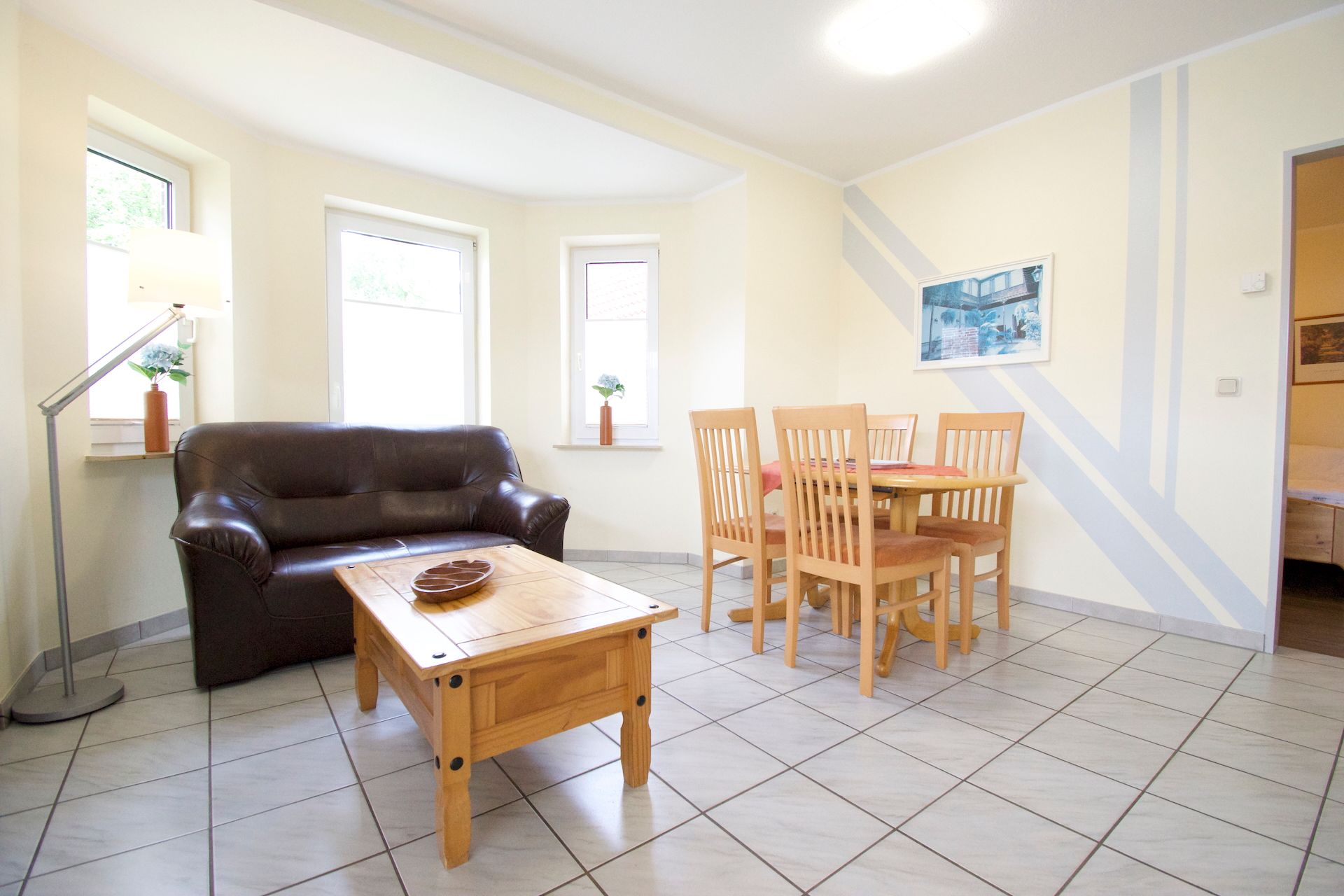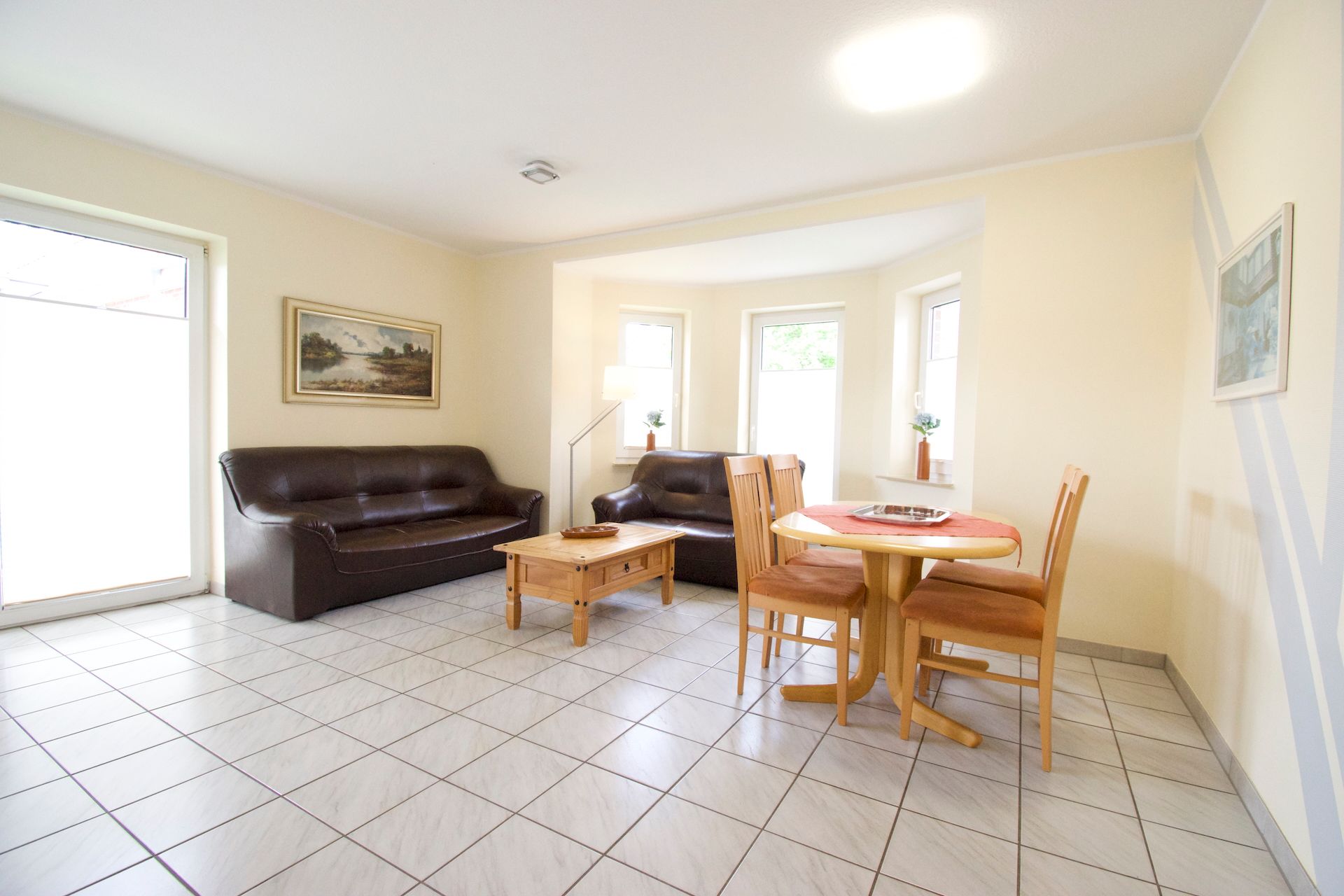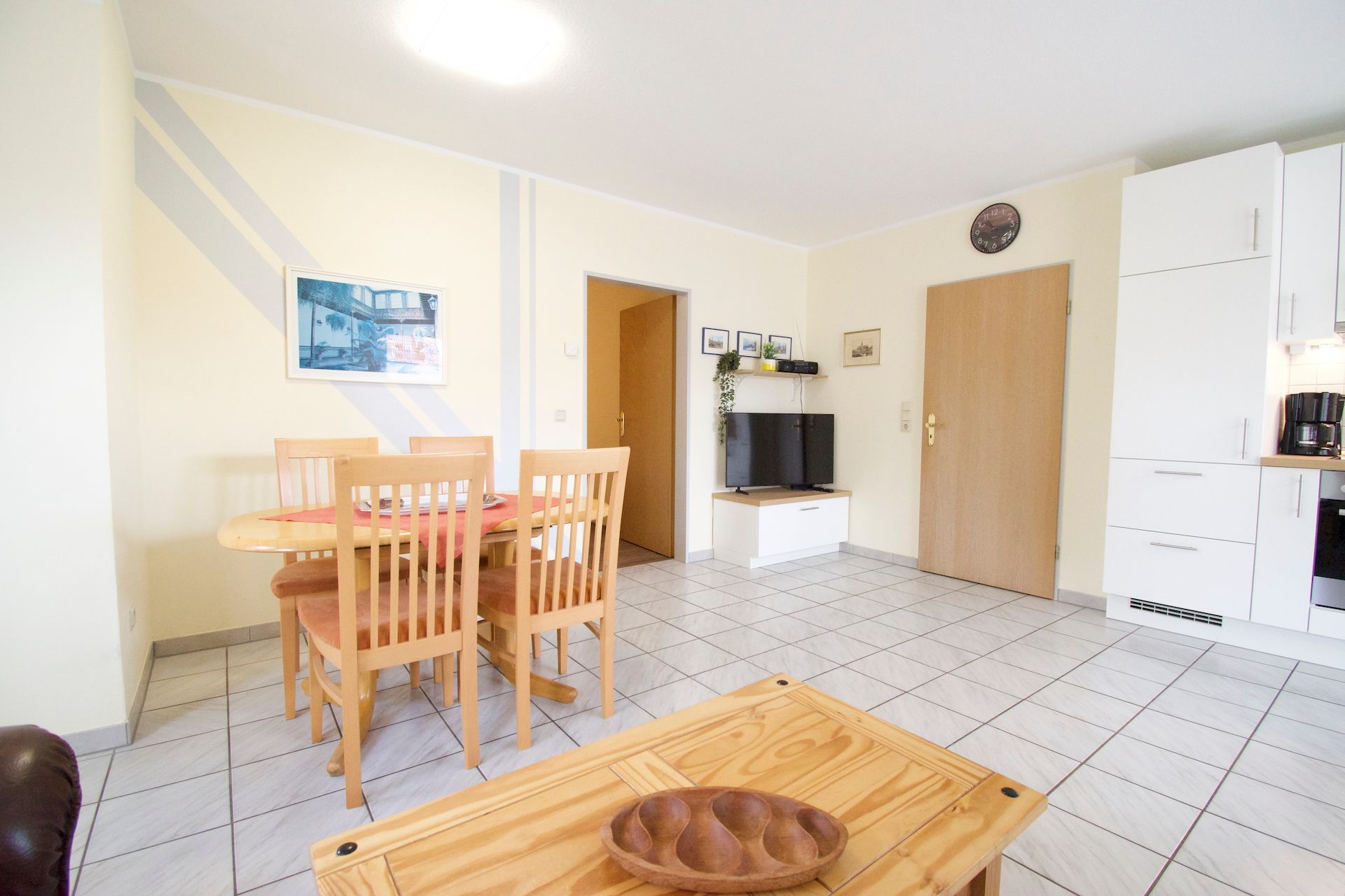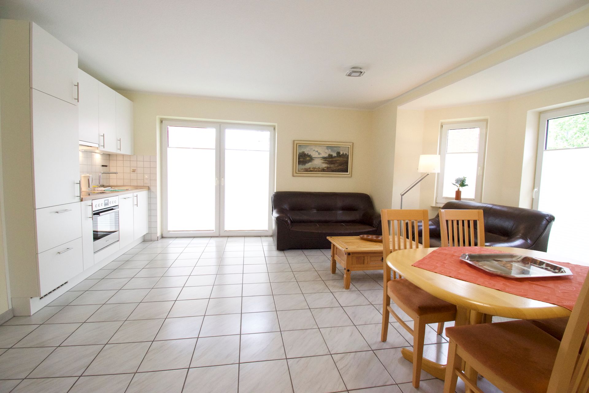 Sie wohnen in einer 55 m² großen, 3-Zimmer-Wohnung, mit 2 getrennten Schlafzimmern im Erdgeschoss. Küche und Bad verfügen jeweils über Tageslicht. Die gemütliche Wohn-Küche hat eine Küchenzeile mit großem Kühlschrank, Cerankochfeld, Backofen und Mikrowelle, und ist voll eingerichtet.