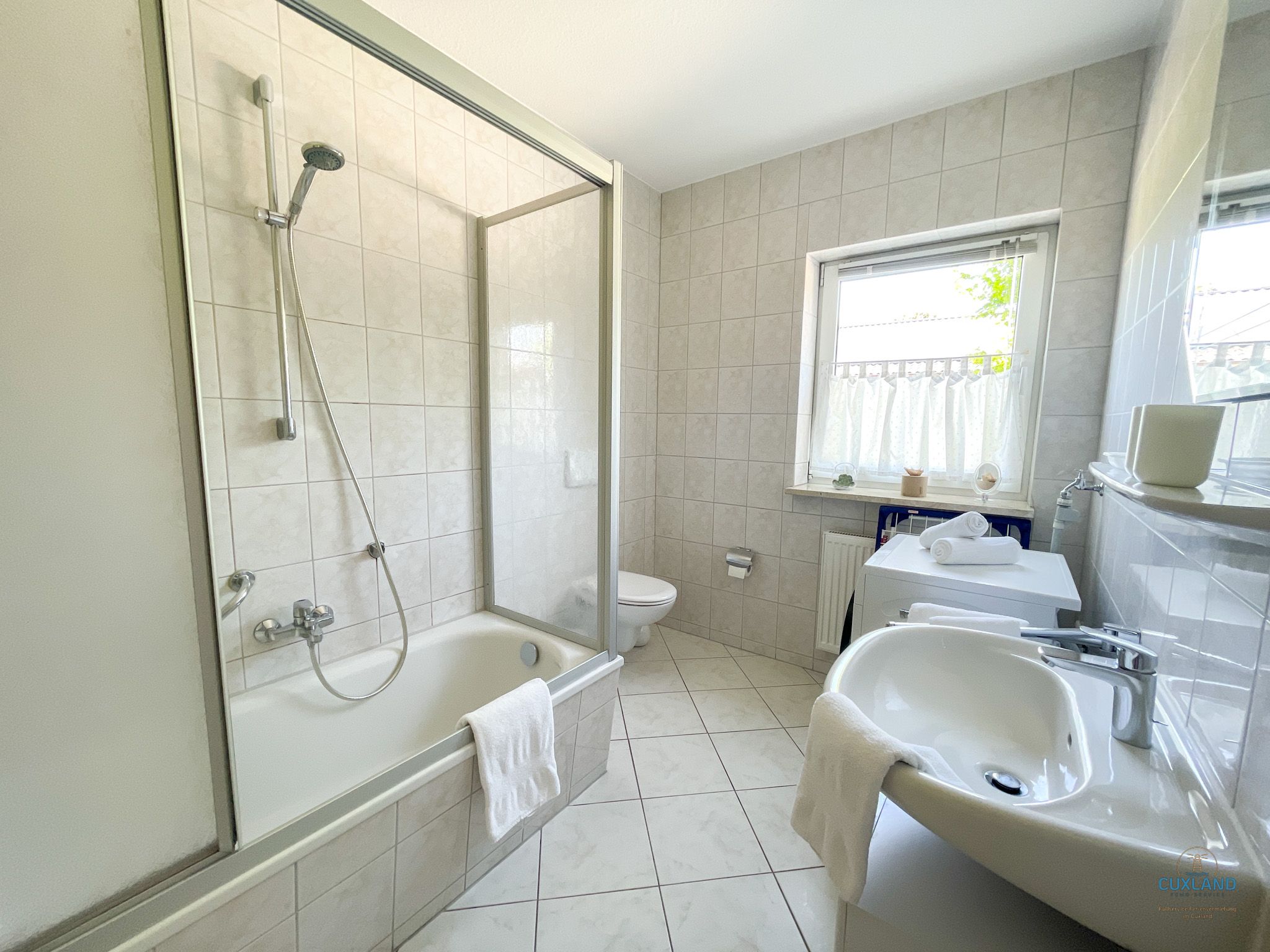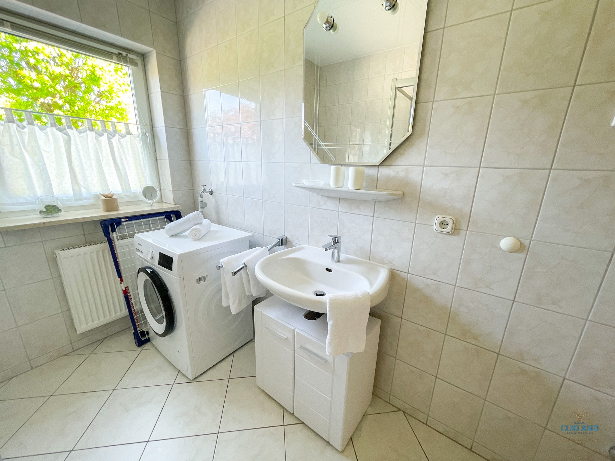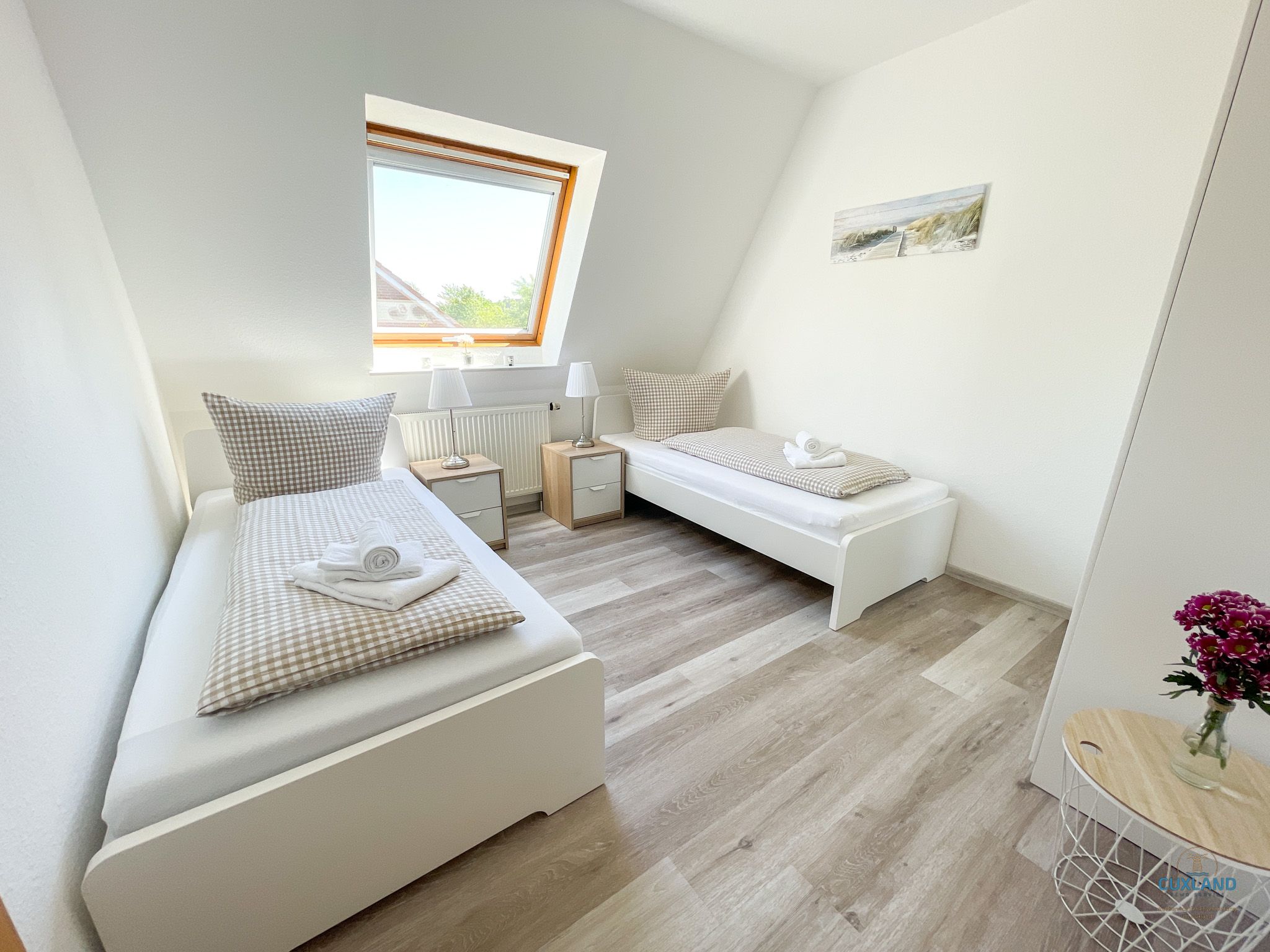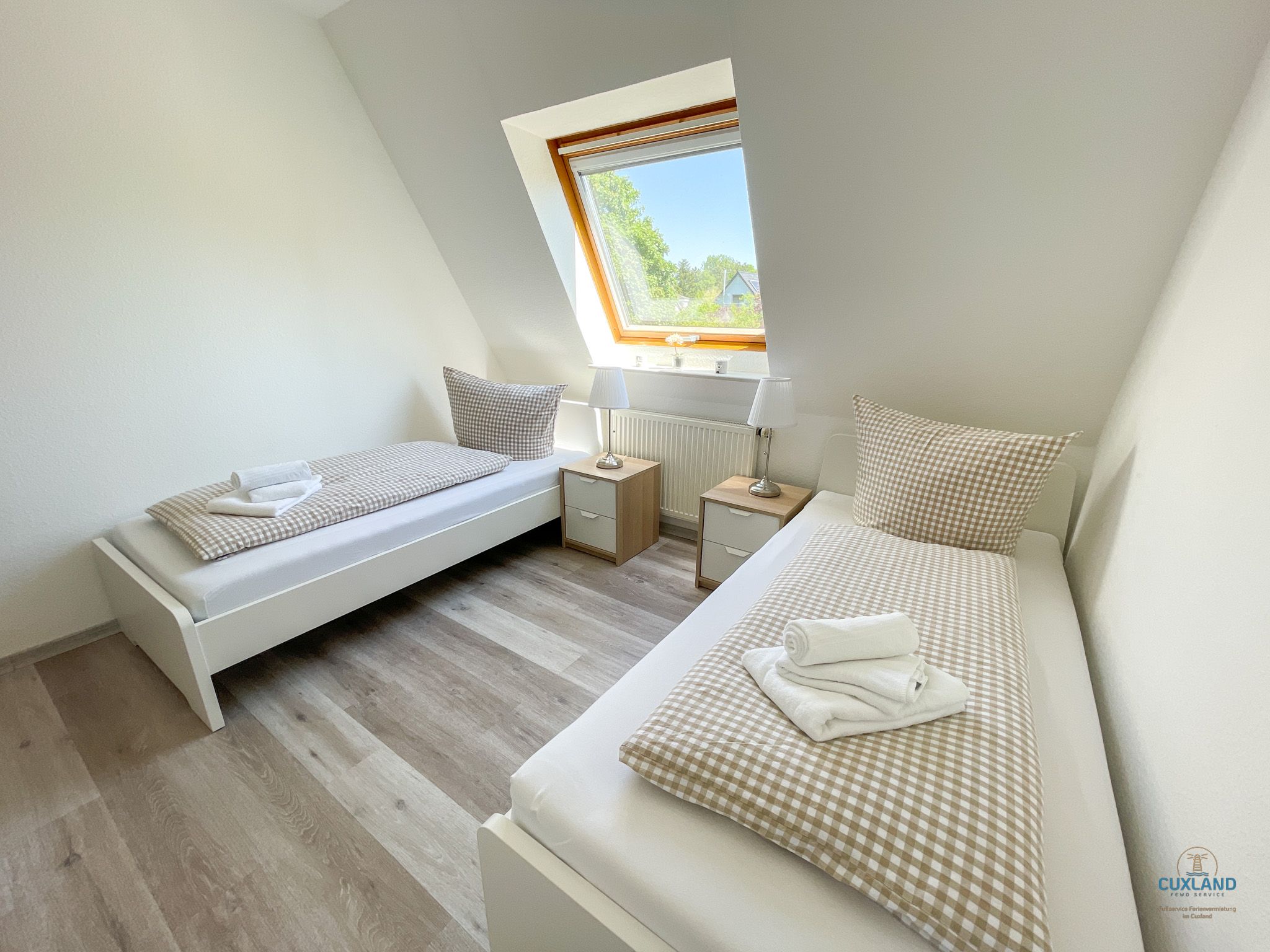 Einzelbetten. Das Duschbad ist mit einer Waschmaschine ausgestattet, welche