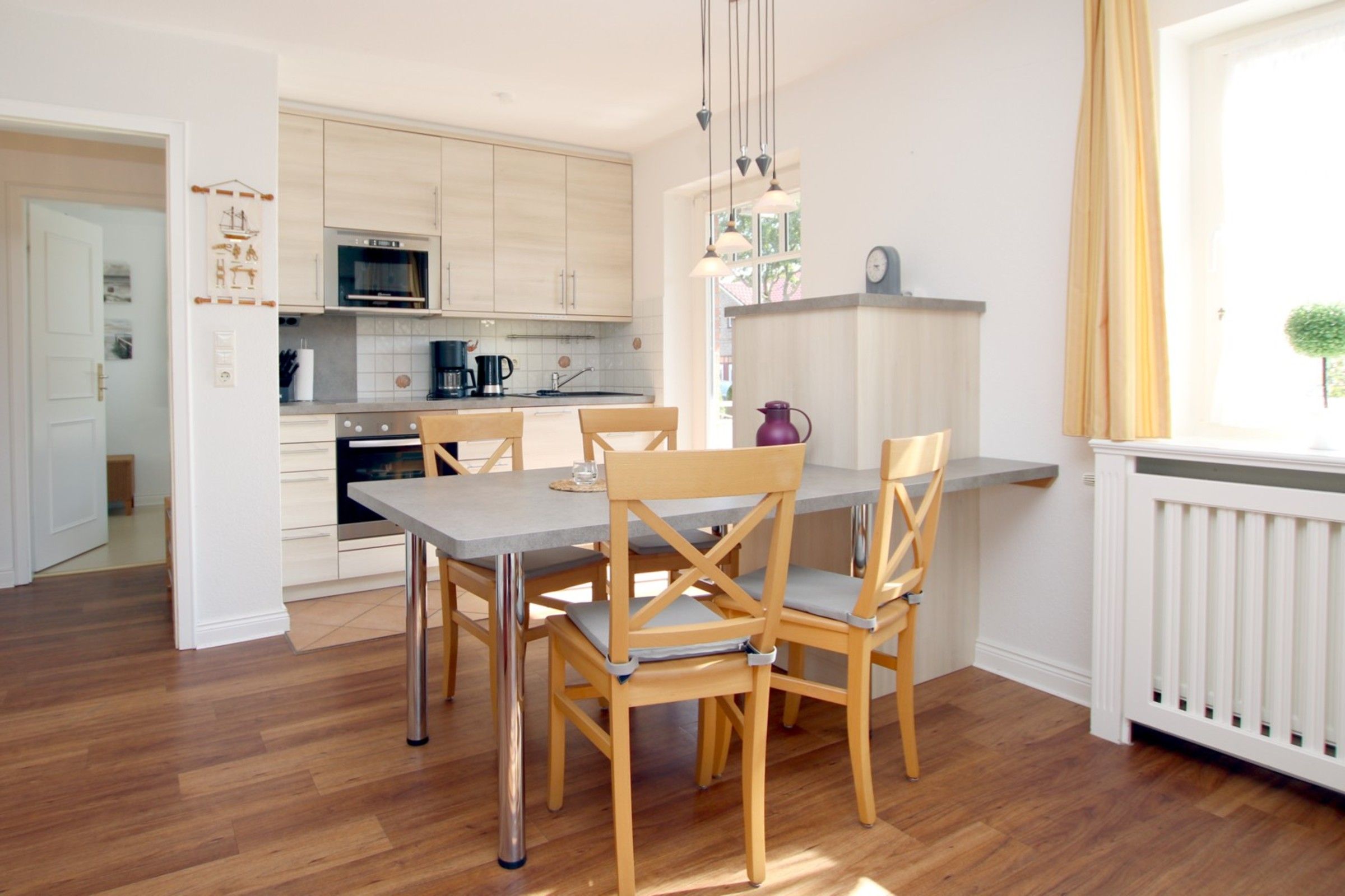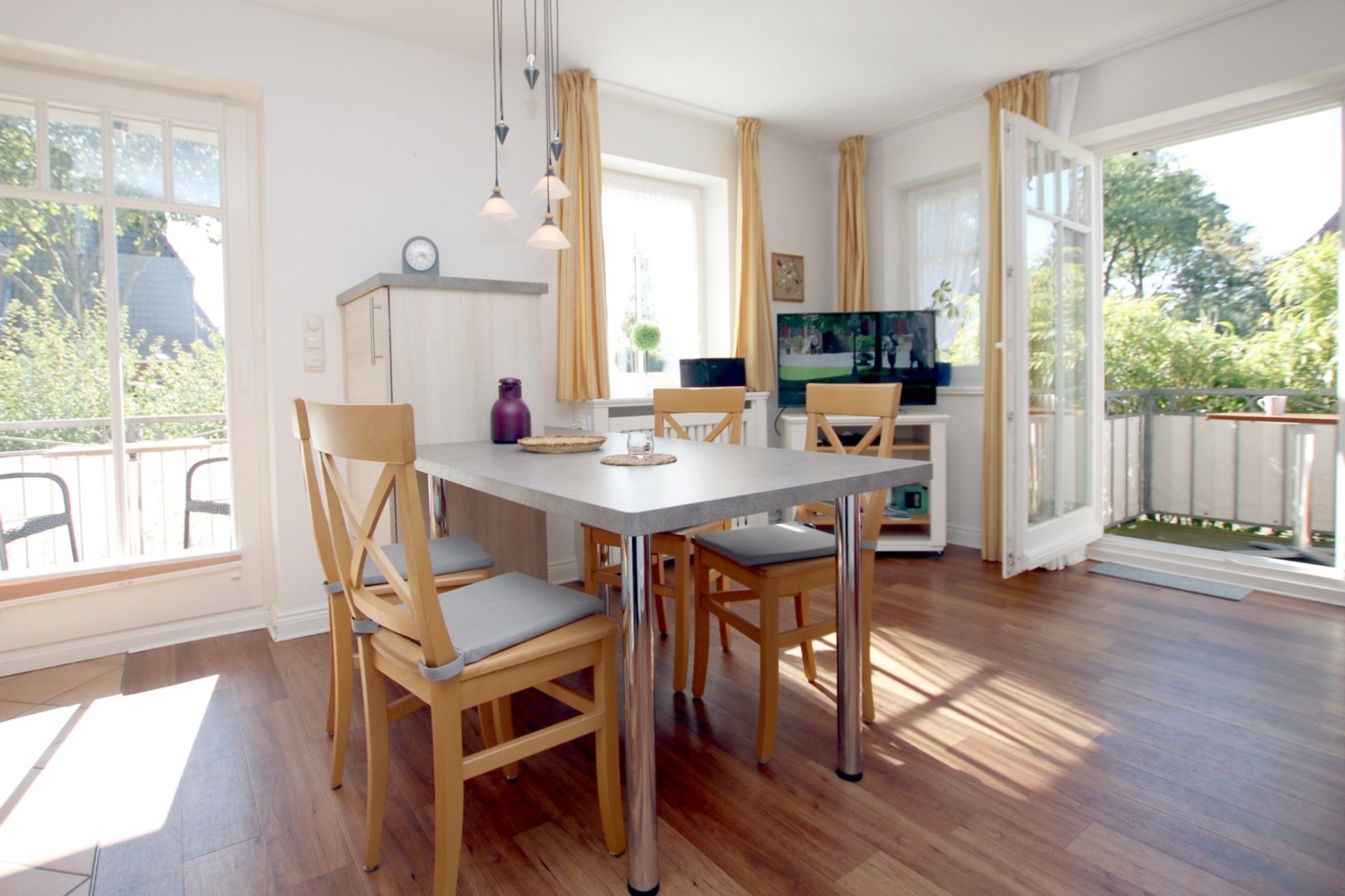 Die lichtdurchflutete Wohnung Nr. 2 im Hochparterre des ruhig gelegenen Hauses bietet 2 Erwachsenen ausreichend Platz für einen wunderschönen Urlaub. Das hell gestrichene Schlafzimmer ist mit Korkboden ausgelegt, verfügt über einen geräumigen Einbauschrank, TV und ein Doppelbett. Das Wohnzimmer, das mit Amtico ausgelegt ist, hat eine Schlafcouch mit vollwertiger Matratze. Zur Couch gibt es 2 passende Hocker. Die Küchenzeile ist mit Backofen und Mikrowelle sehr gut eingerichtet. Dazu gibt es einen großzügigen Essplatz für 4 Personen. Im Souterrain befindet sich das Badezimmer mit Dusche, WC und geräumigen Waschtisch. Außerdem ist das Bad mit einer Fußbodenerwärmung ausgestattet. Durch das Öffnen der Wohnzimmertüre kann der Treppenabgang abgesperrt werden. Der Südbalkon hält einen Tisch und Stühle, der Westbalkon einen Strandkorb für sie zur Erholung bereit. Zur medialen Unterhaltung steht Ihnen je ein Fernsehgerät im Wohnzimmer und im Schlafzimmer zur Verfügung. Ihren Laptop oder Smartphone können Sie gerne mit unserem kostenlosen WLAN verbinden. Zum Zentrum sind es nur wenige Gehminuten, zum Strand ca. 400 m und der Supermarkt liegt nur 200 m entfernt. Im Gemeinschaftskeller können Sie eine Münzwaschmaschine und ein Münztrockner benutzen