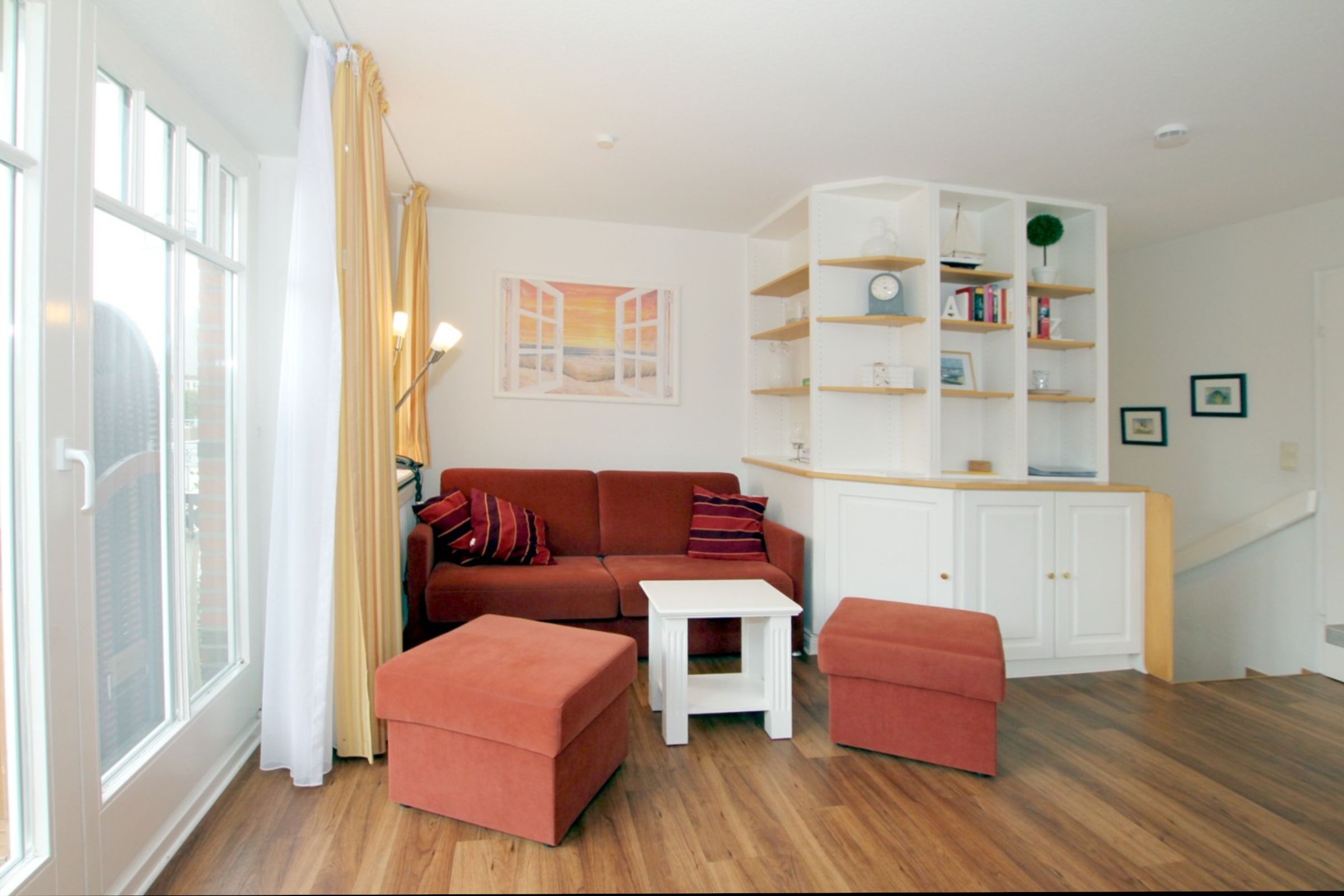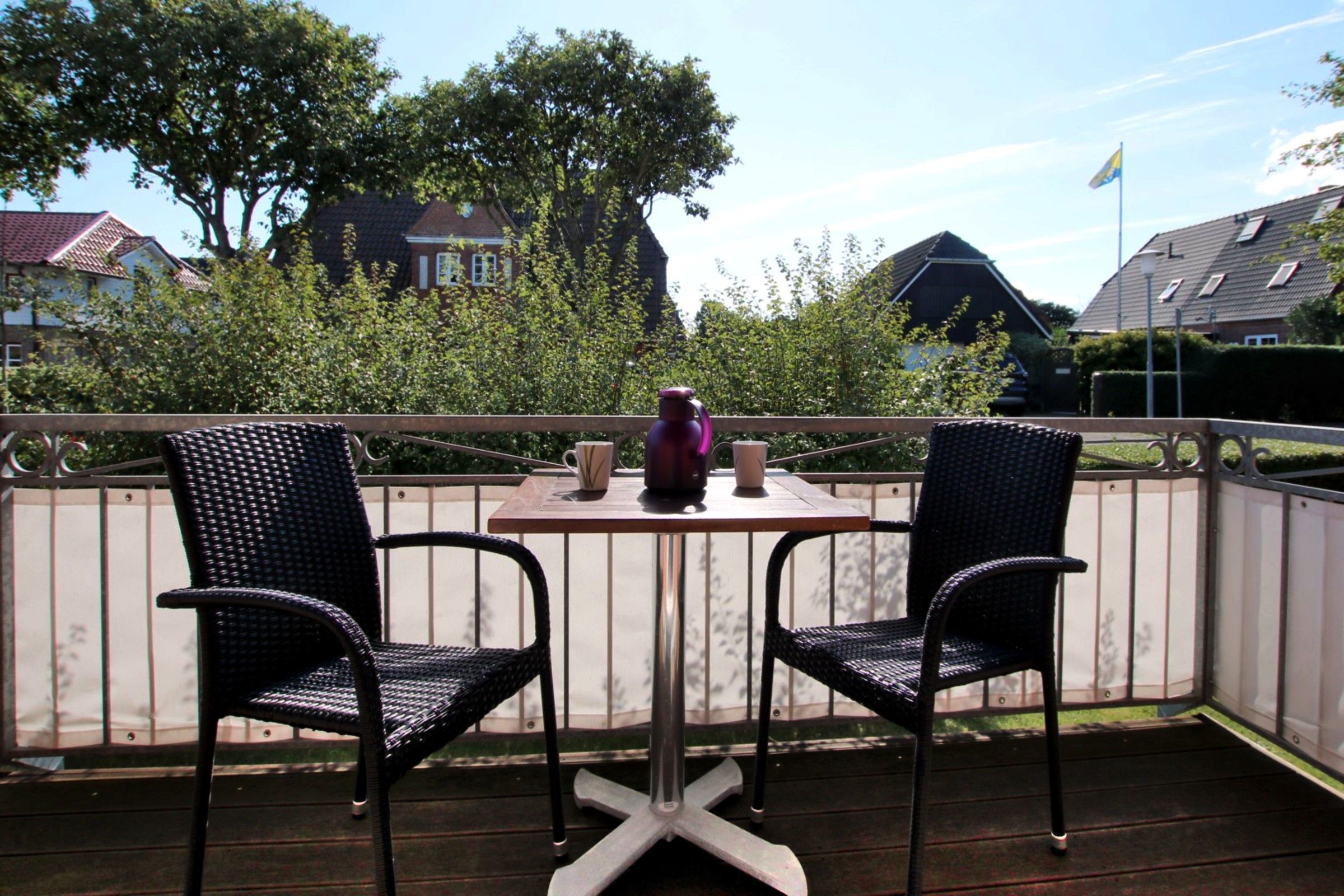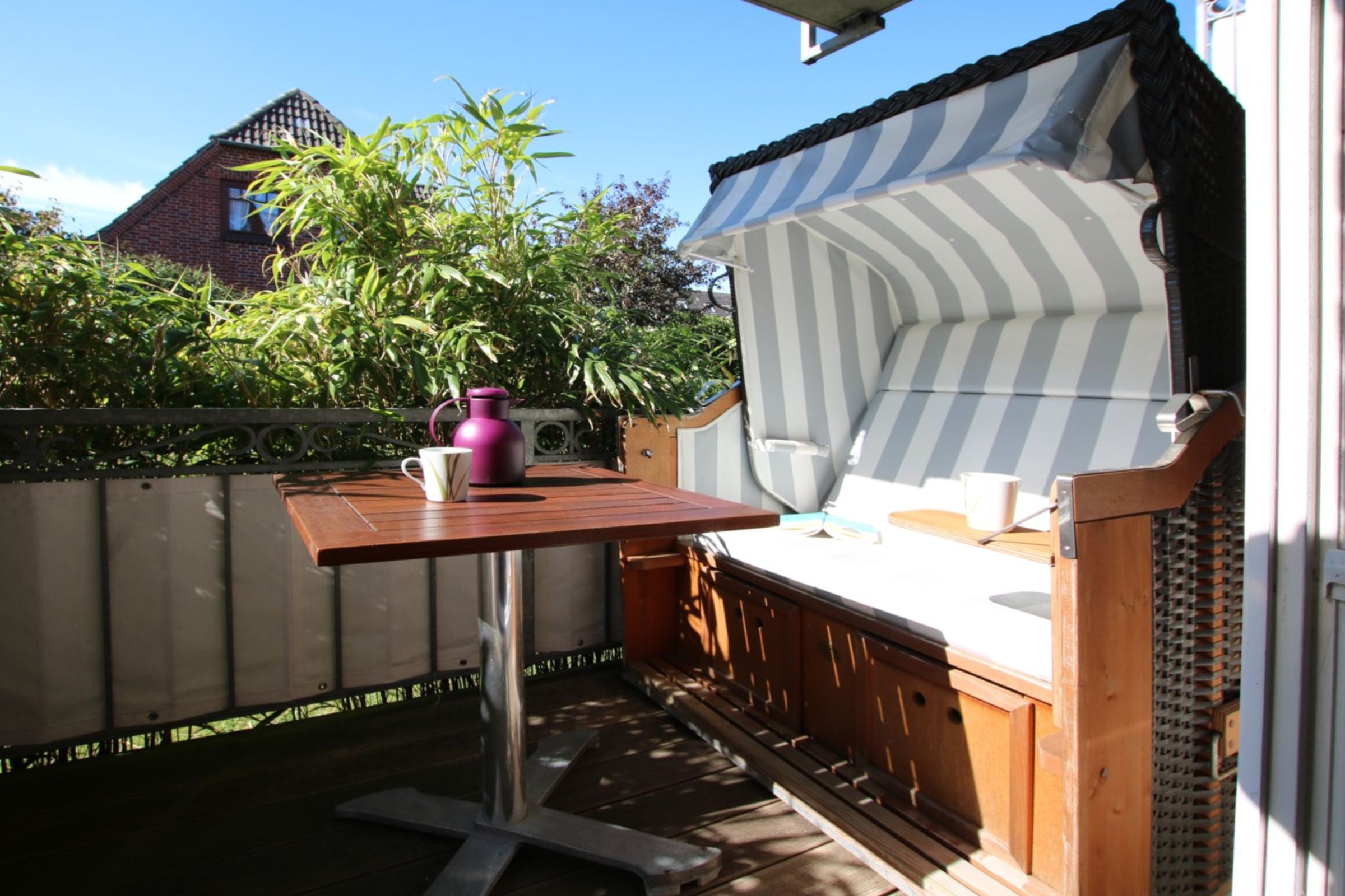 Ferienwohnung in Wyk auf Föhr, Rungholtstraße 6, Wohnung Nr.2, Nichtraucherwohnung, ca. 40 qm im Hochparterre mit 1 Westbalkon (mit Strandkorb) und 1 Südbalkon (2 Gartenstühle mit Tisch).