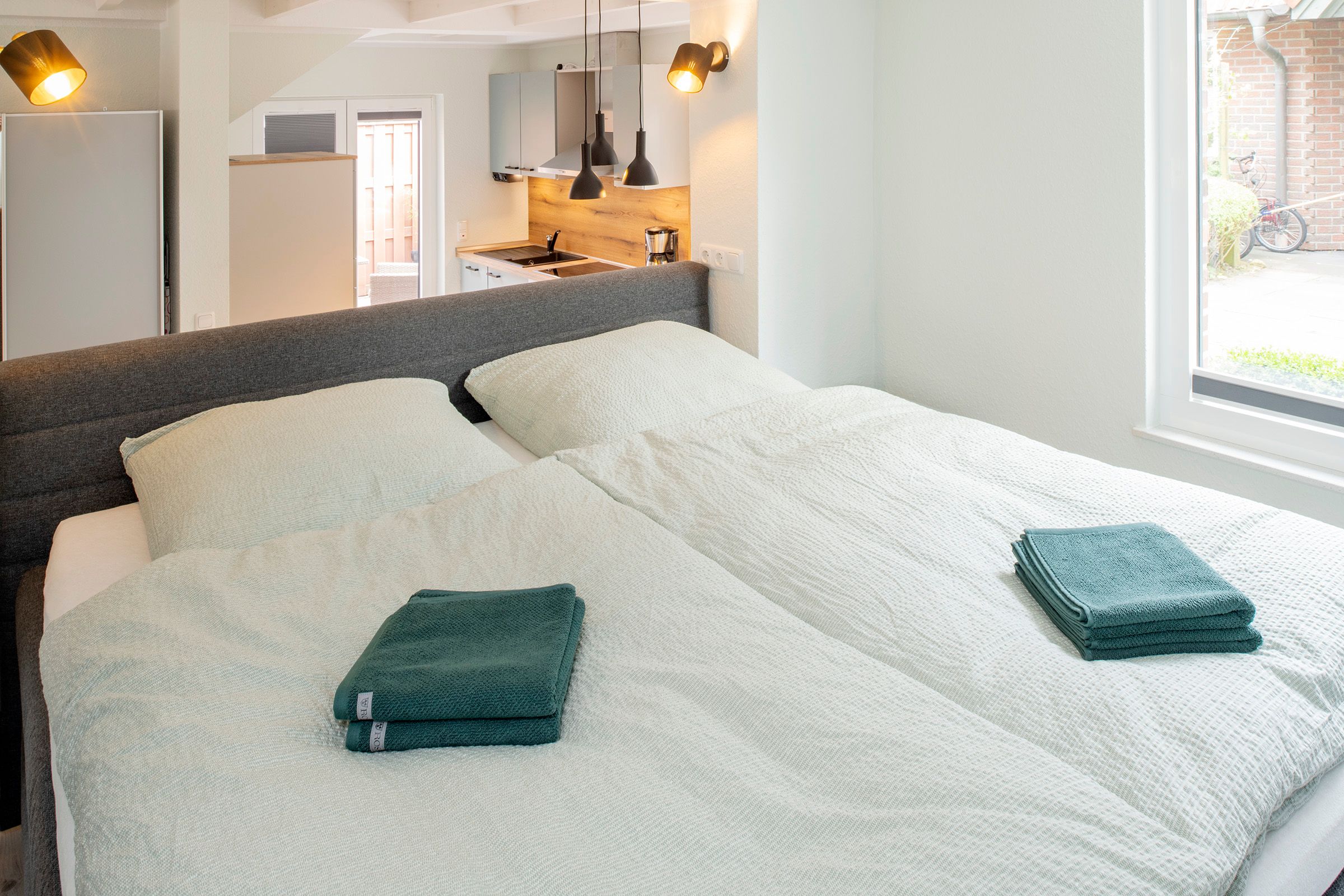 Das Studio „Salzwiese“ befindet sich im Erdgeschoss. Es ist optimal für 1-2 Personen ausgerichtet. Auf Anfrage kann eine weitere Person auf dem Sofa mit Bettfunktion übernachten. Das ca. 46qm große Studio ist eine moderne Ein-Raum-Wohnung und verfügt über ein Wohn-Schlaf-Esszimmer mit moderner Einbauküche und separatem Bad. Vom Wohn- und Essraum erreichen Sie über drei Stufen den höher gelegenen Schlafbereich mit hochwertigem Boxspringbett, sowie das Bad mit Fußbodenheizung, Dusche, WC, Waschbecken, Kosmetikspiegel und Föhn. Dieser Bereich hat eine geringere Deckenhöhe (ca. 2 m).