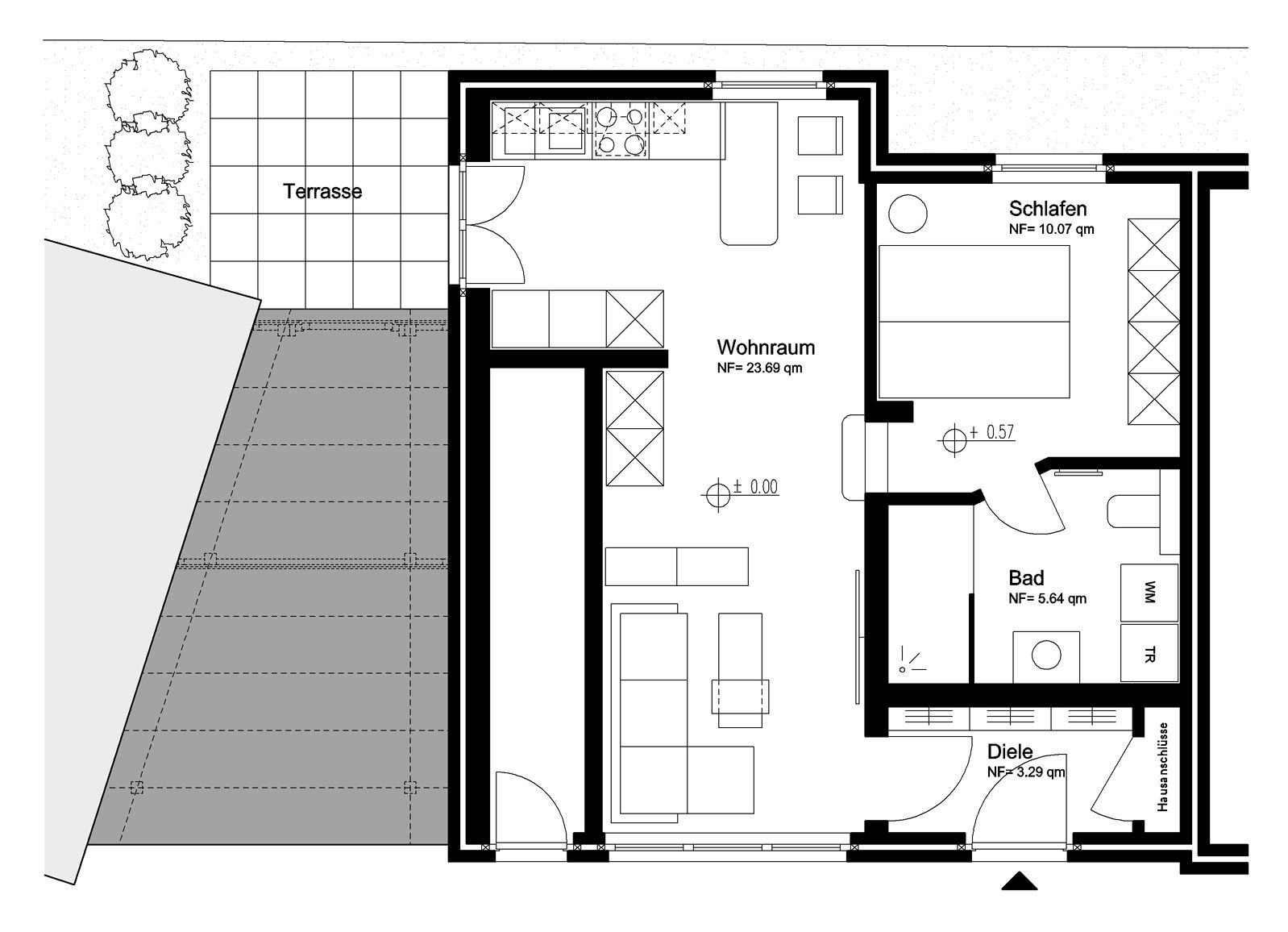 Diese Wohnung verfügt über eine Terrasse mit Sitzgruppe.