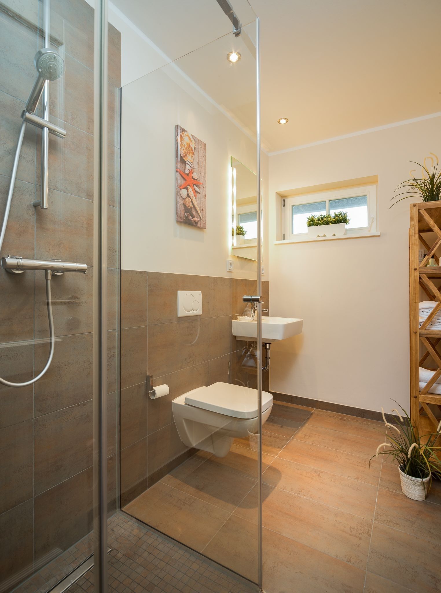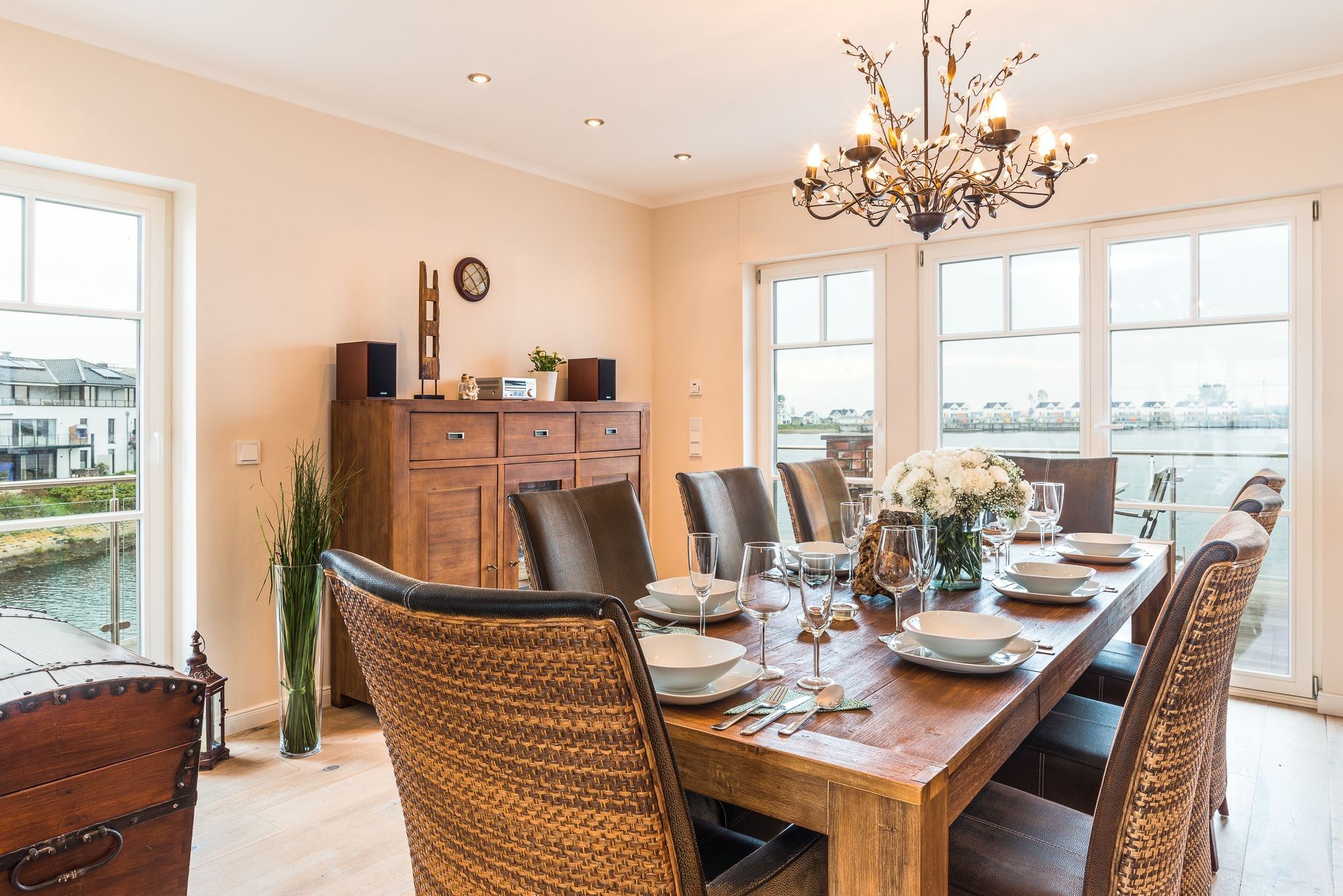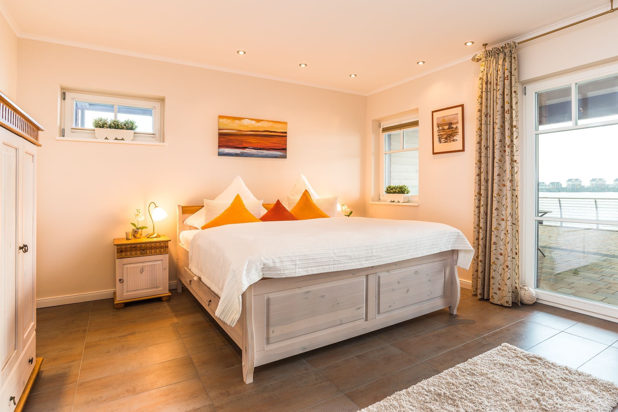 Im Erdgeschoss befindet sich der großzügige Eingangsbereich mit Garderobe sowie ein großes Schlafzimmer mit eigenem Badezimmer. Das Schlafzimmer verfügt über große Panoramafenster mit Zugang zur überdachten Terrasse zur Hafenseite und direktem Zugang zum Wasser mit Bootsanleger.