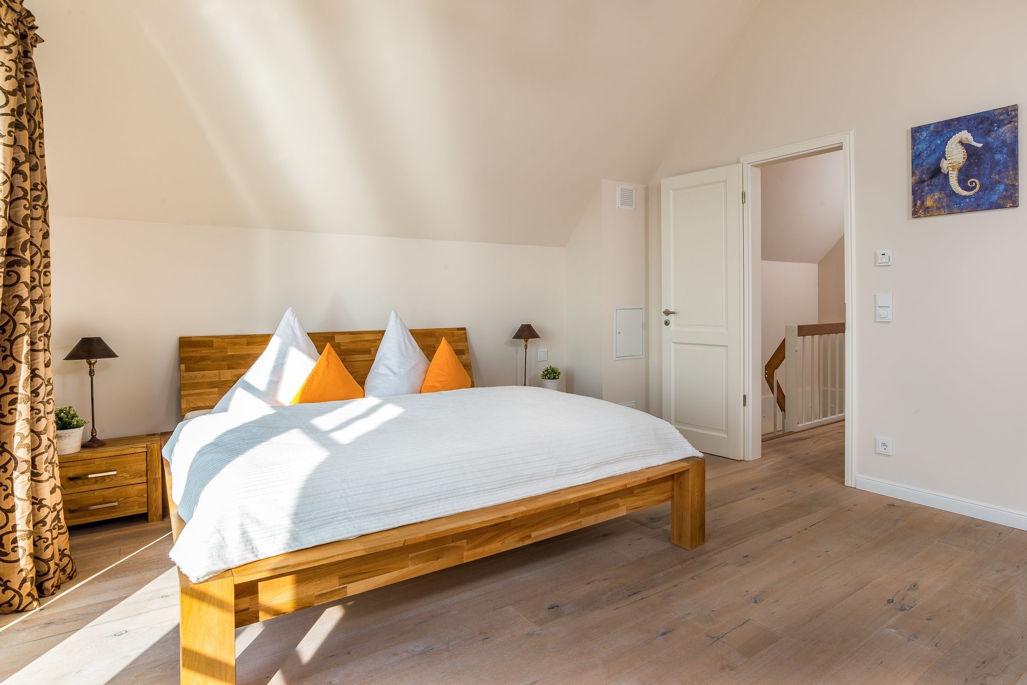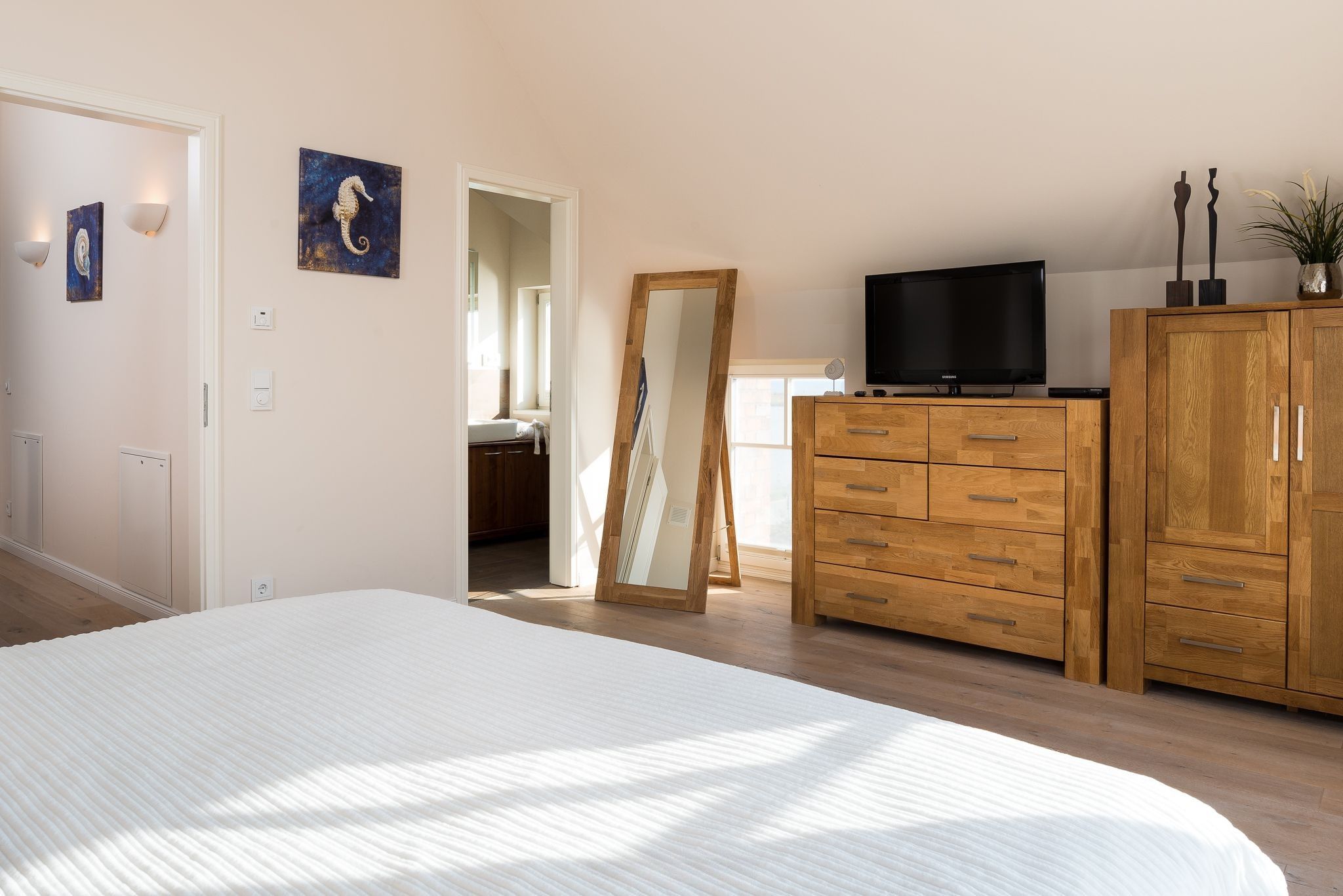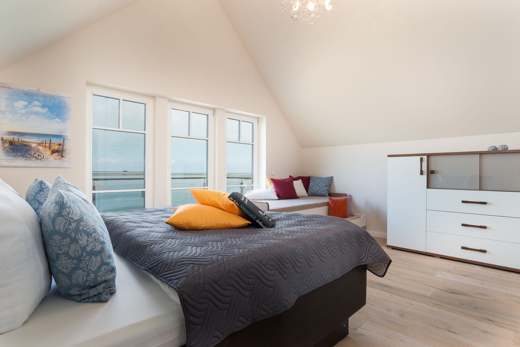 Im Dachgeschoss mit insgesamt 53 qm sind zwei weitere Schlafzimmer, wovon das eine ein zusätzliches ausziehbares Einzelbett vorhält. Kleiderschränke oder Kommoden sind in allen Schlafzimmern vorhanden. Das Schlafzimmer zur Hafenseite verfügt zudem über einen weiteren Fernseher.