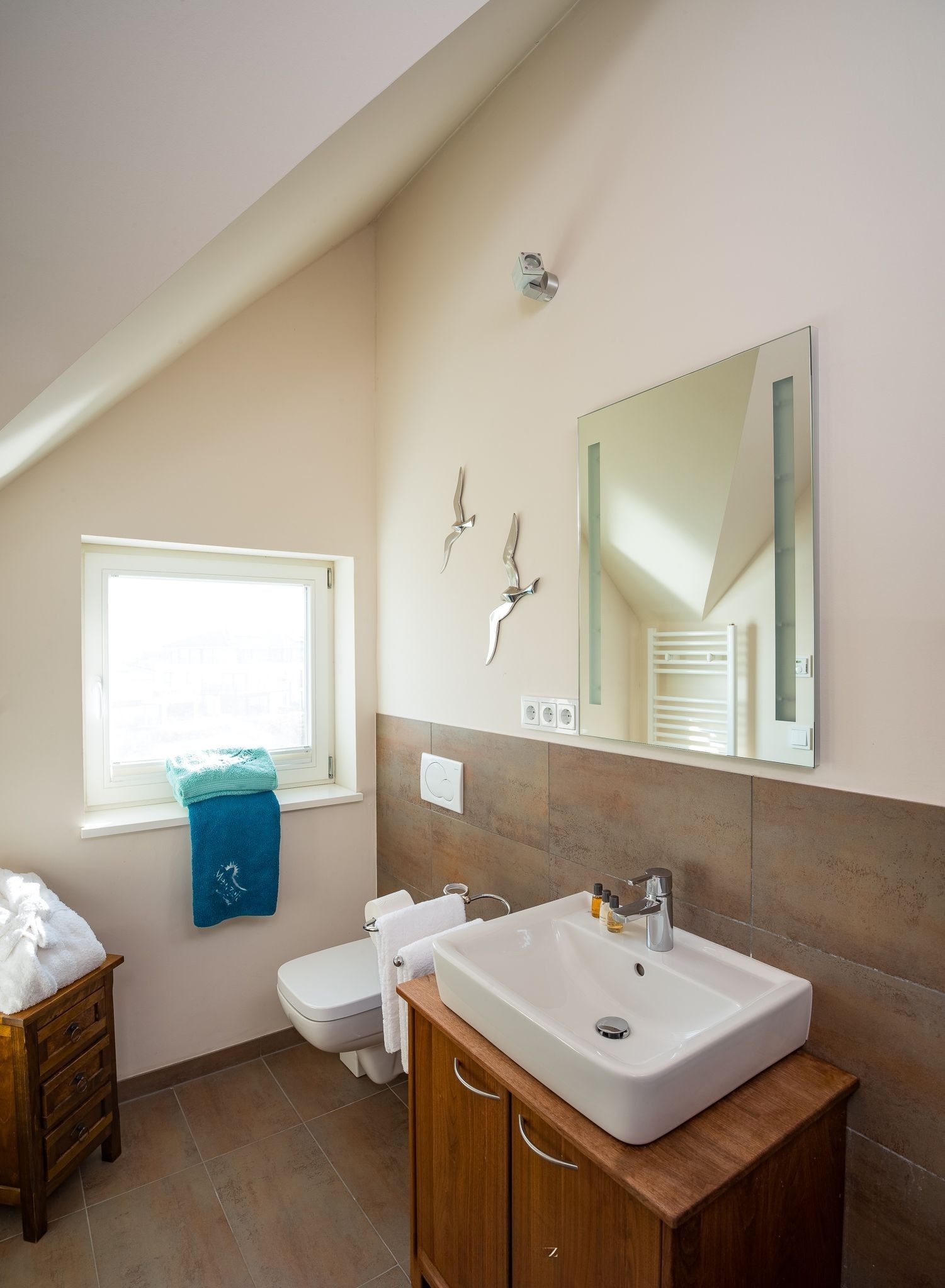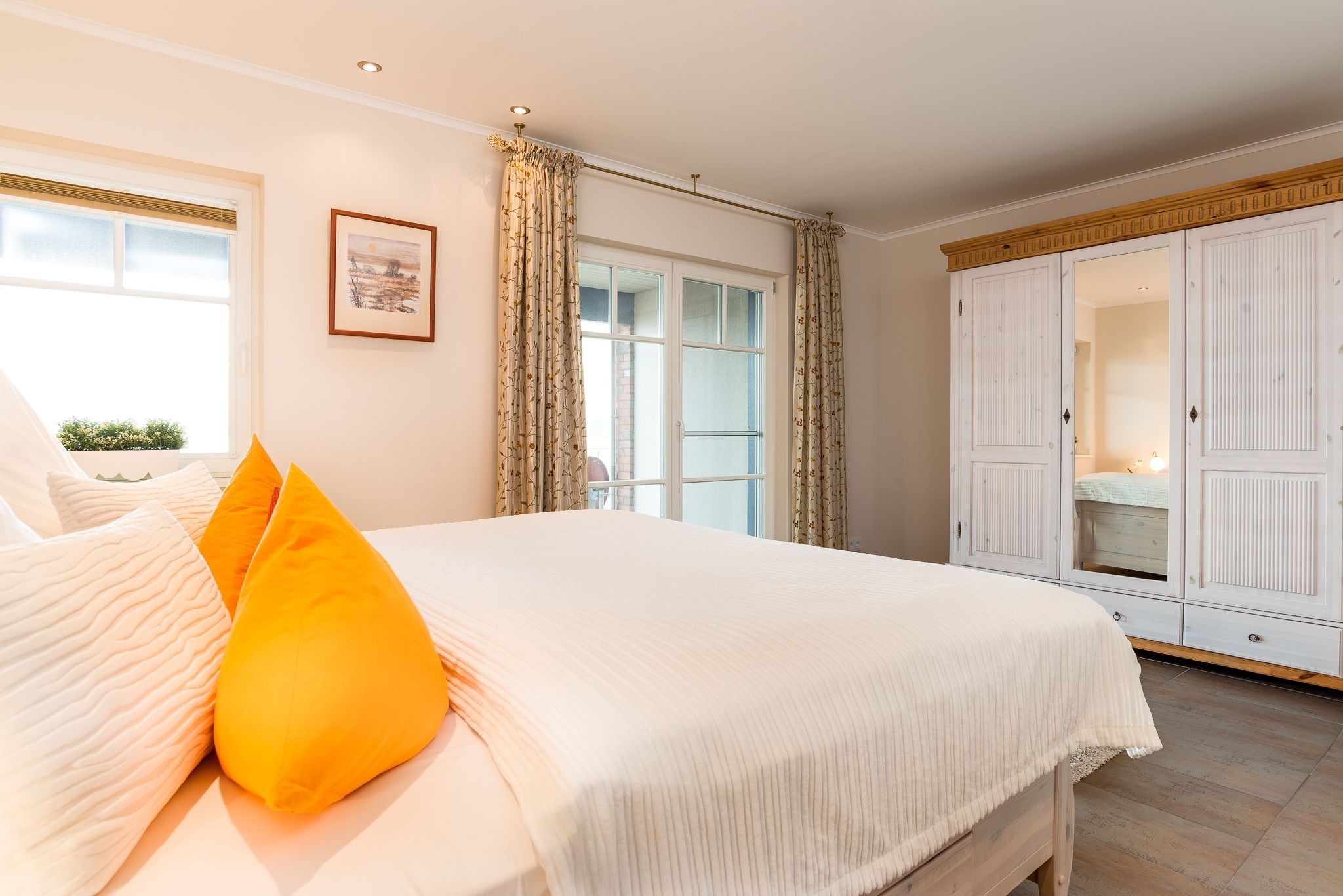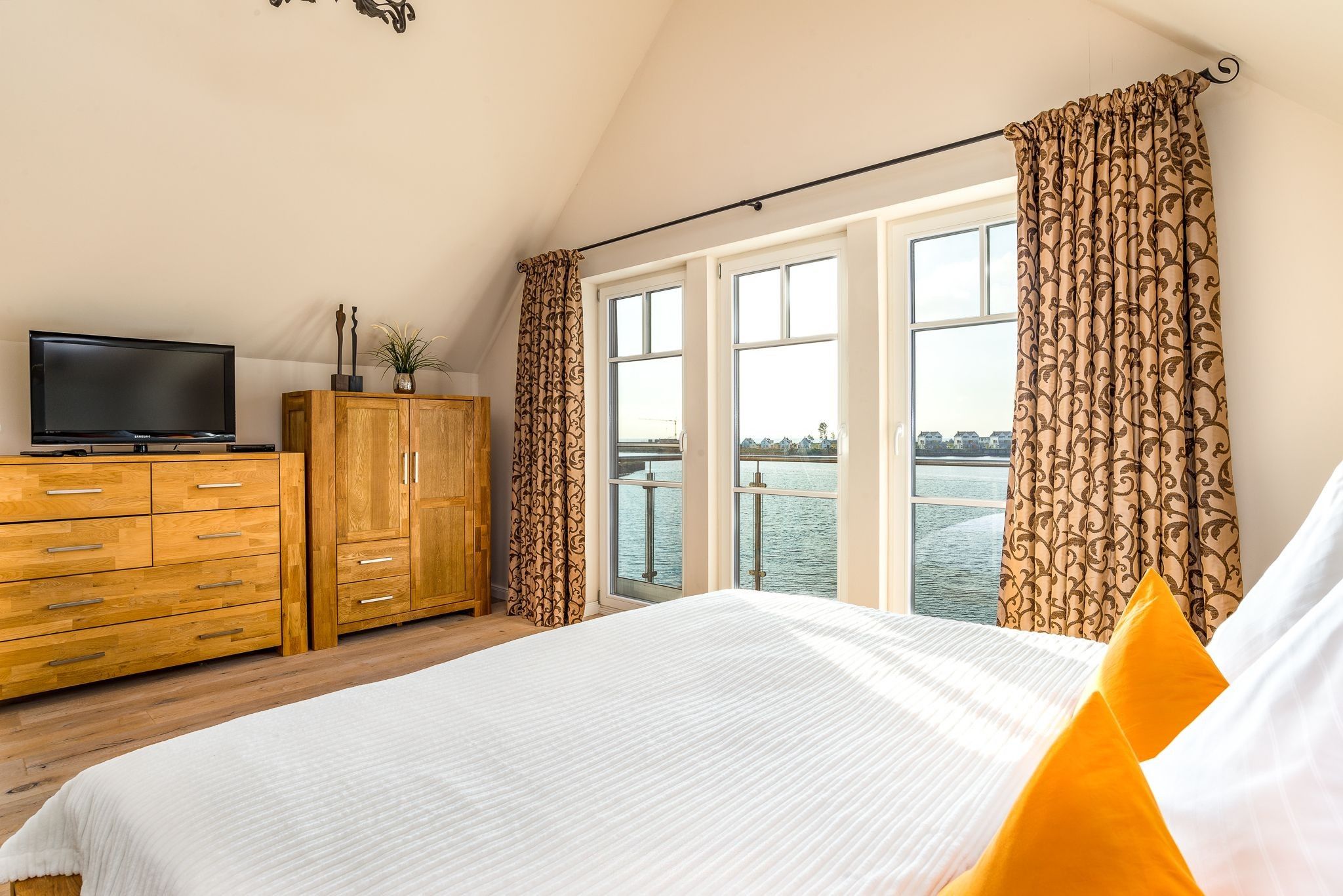 Im Dachgeschoss mit insgesamt 53 qm sind zwei weitere Schlafzimmer, wovon das eine ein zusätzliches ausziehbares Einzelbett vorhält. Kleiderschränke oder Kommoden sind in allen Schlafzimmern vorhanden. Das Schlafzimmer zur Hafenseite verfügt zudem über einen weiteren Fernseher.