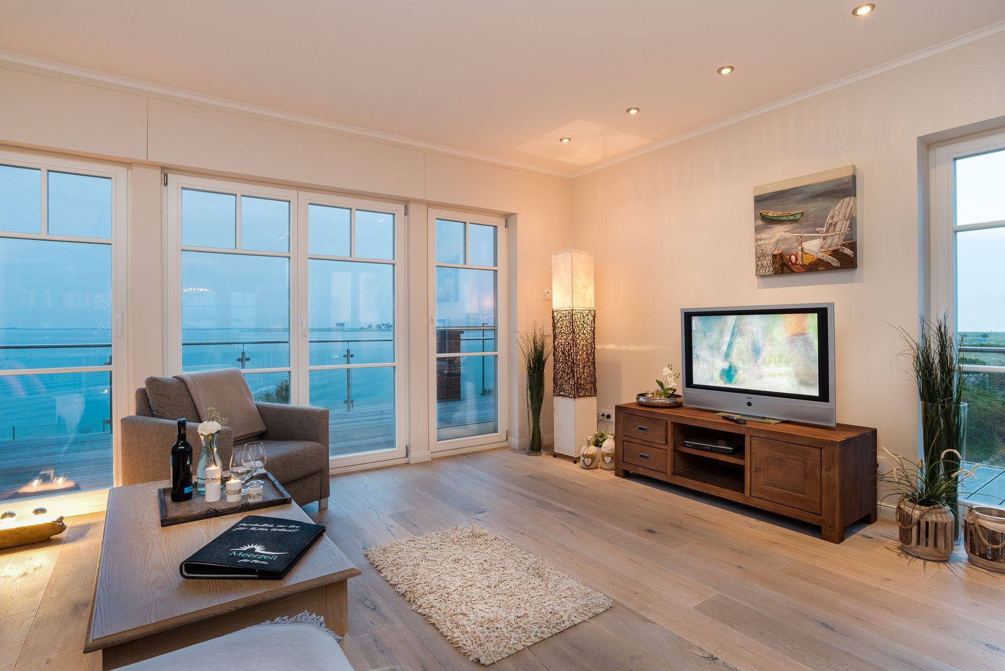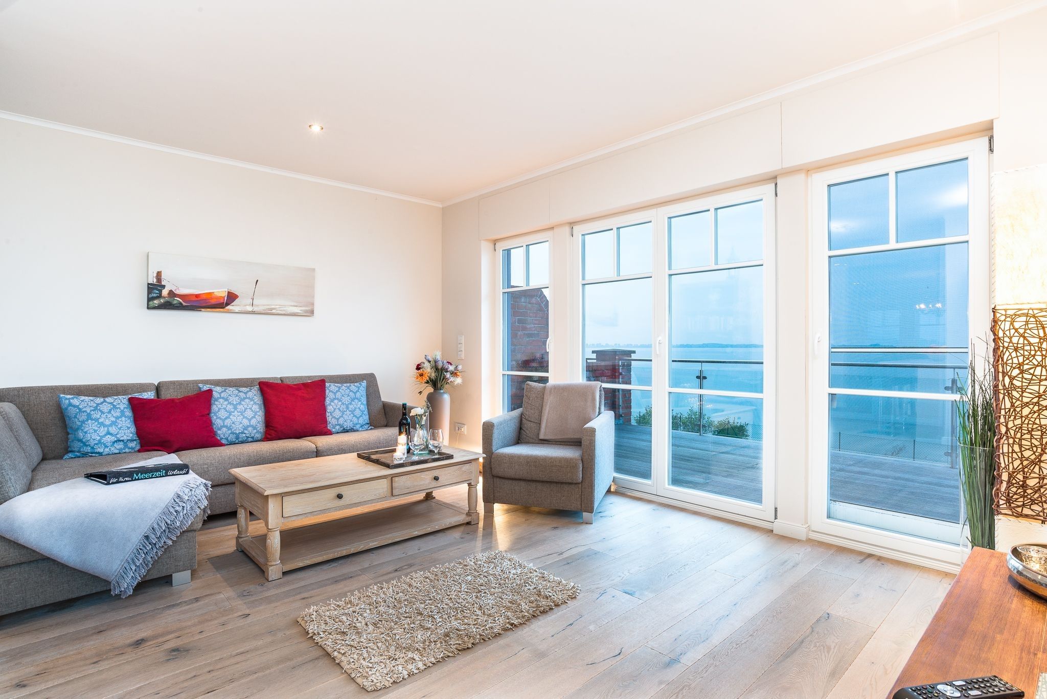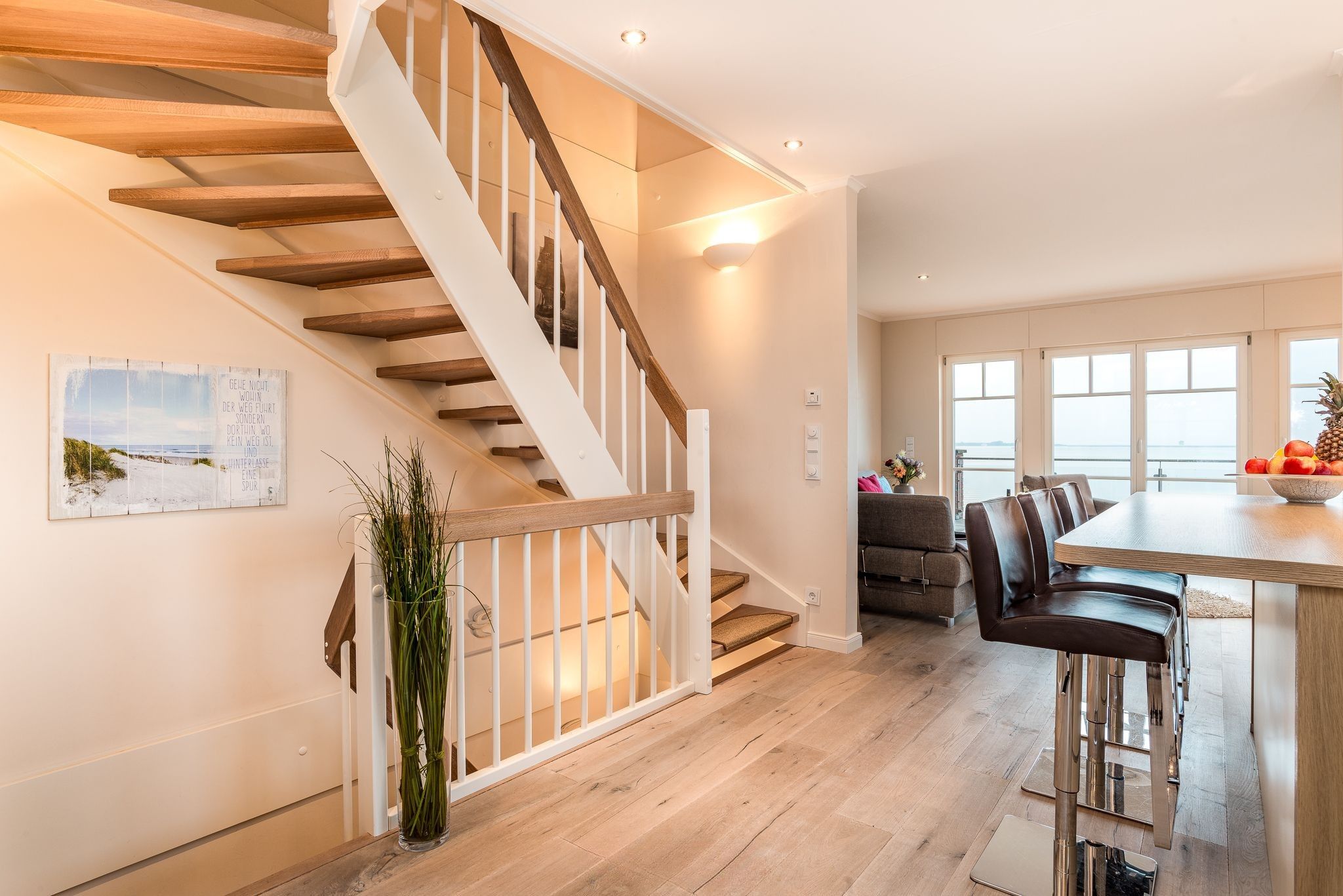 Die mittlere Ebene des Hauses mit umlaufender Terrasse dient dem Genuss und Familienleben. Ein großer Wohnbereich mit bequemer Schlafcouch und Zugang zur Terrasse ist ebenso vorhanden, wie die mittig gelegene große Küche mit gehobener Ausstattung und Barhockern. Auf der Südseite befindet sich der gemütliche Essbereich mit Kaminofen und Zugang zur Südterrasse. Durch die Panoramaverglasung ist aus jedem Fenster der Blick auf das Wasser garantiert.