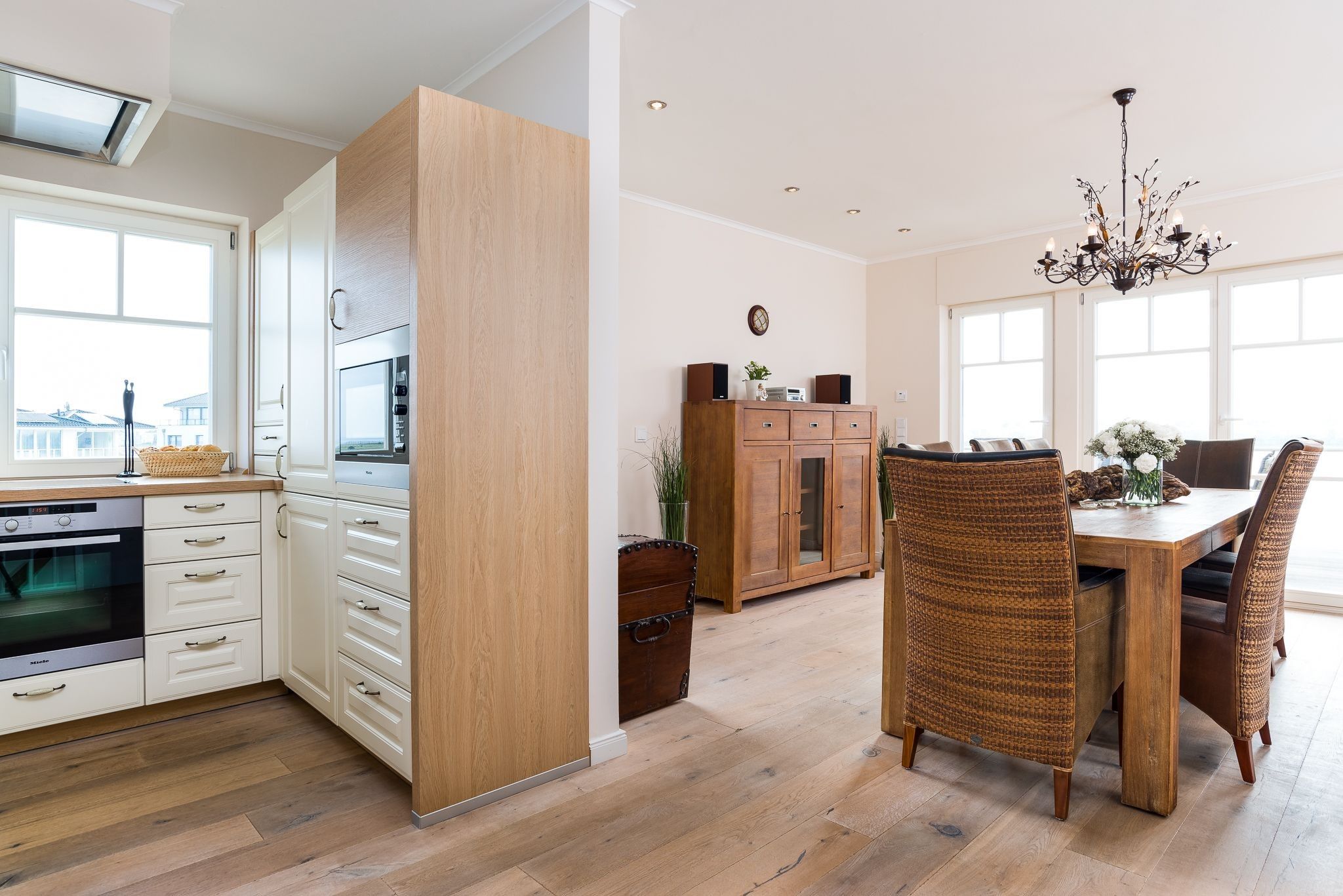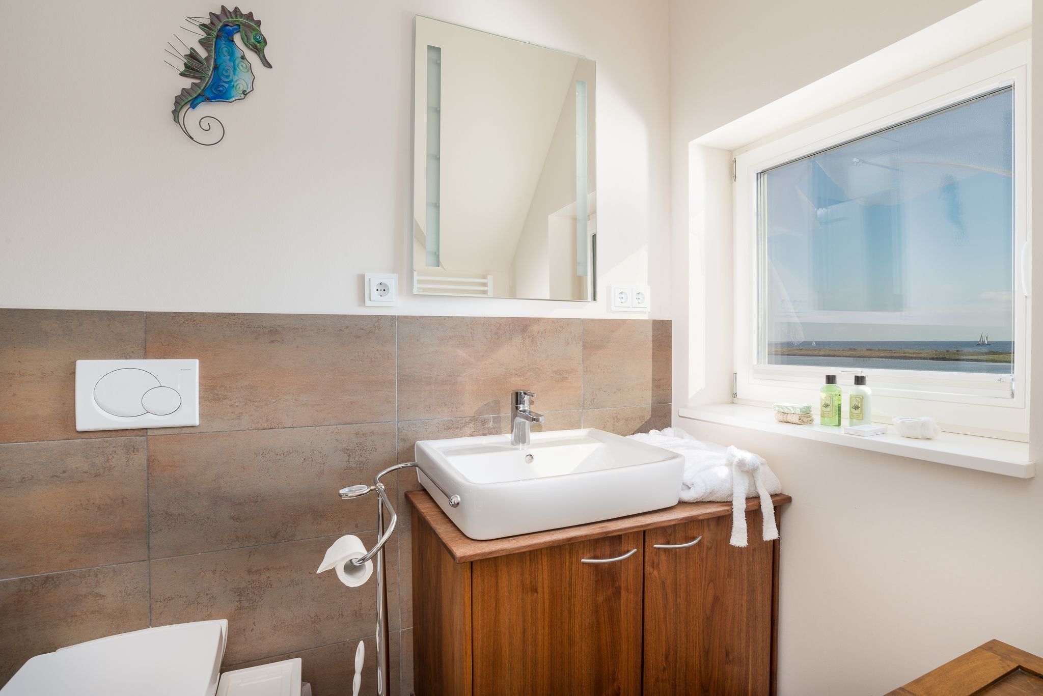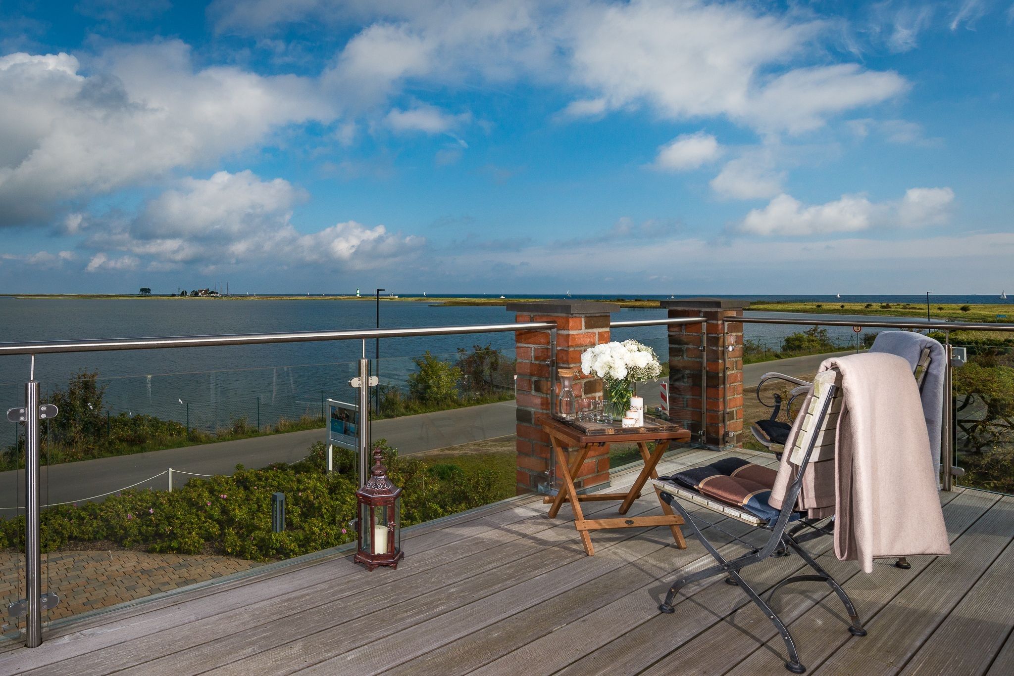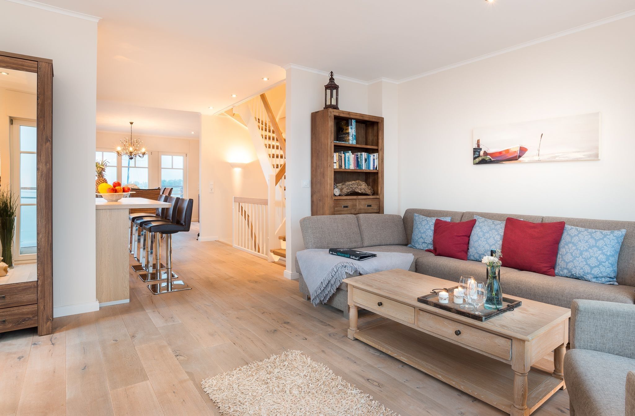Die mittlere Ebene des Hauses mit umlaufender Terrasse dient dem Genuss und Familienleben. Ein großer Wohnbereich mit bequemer Schlafcouch und Zugang zur Terrasse ist ebenso vorhanden, wie die mittig gelegene große Küche mit gehobener Ausstattung und Barhockern. Auf der Südseite befindet sich der gemütliche Essbereich mit Kaminofen und Zugang zur Südterrasse. Durch die Panoramaverglasung ist aus jedem Fenster der Blick auf das Wasser garantiert.