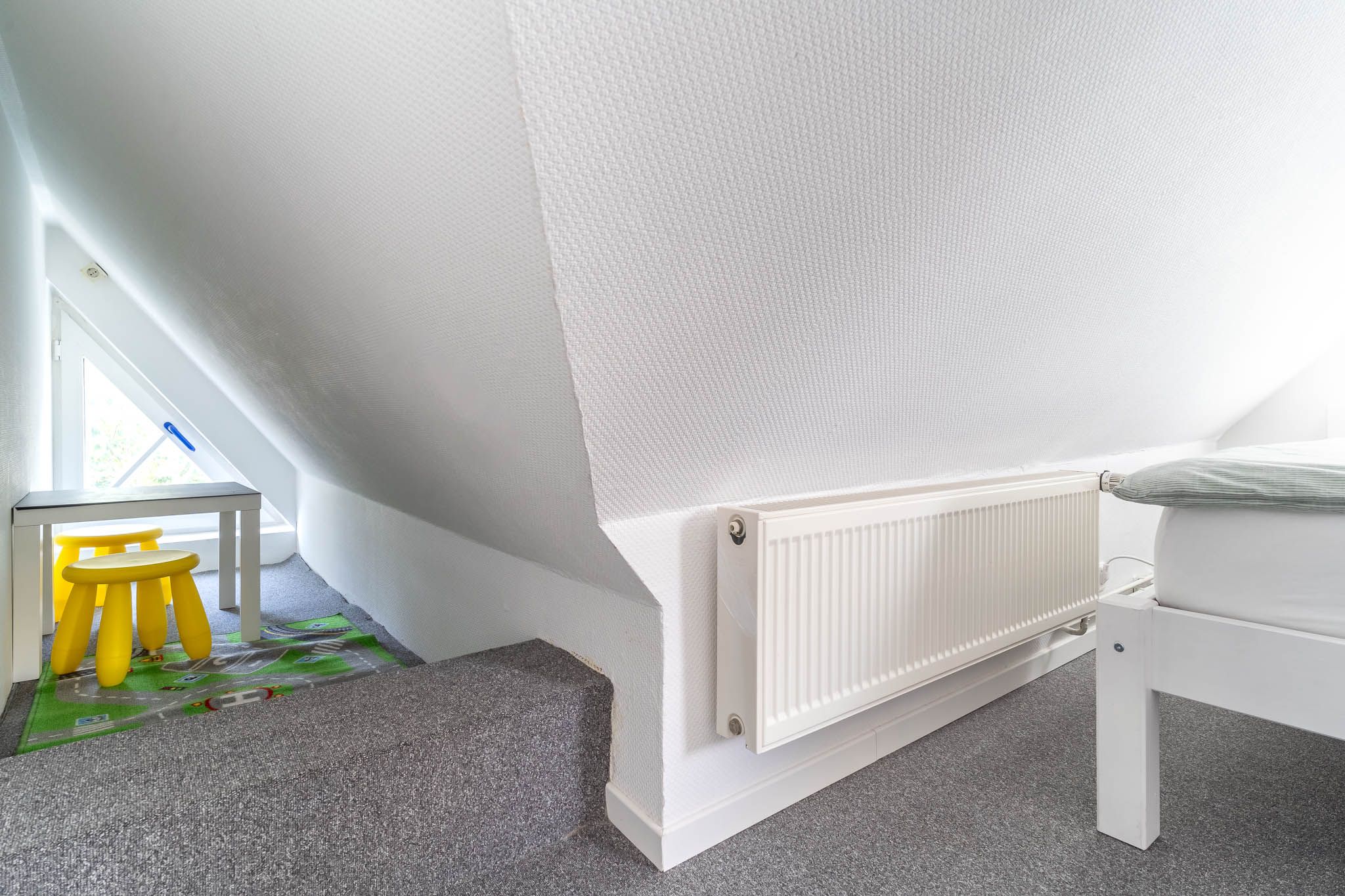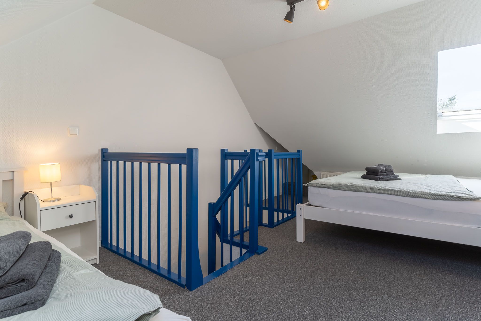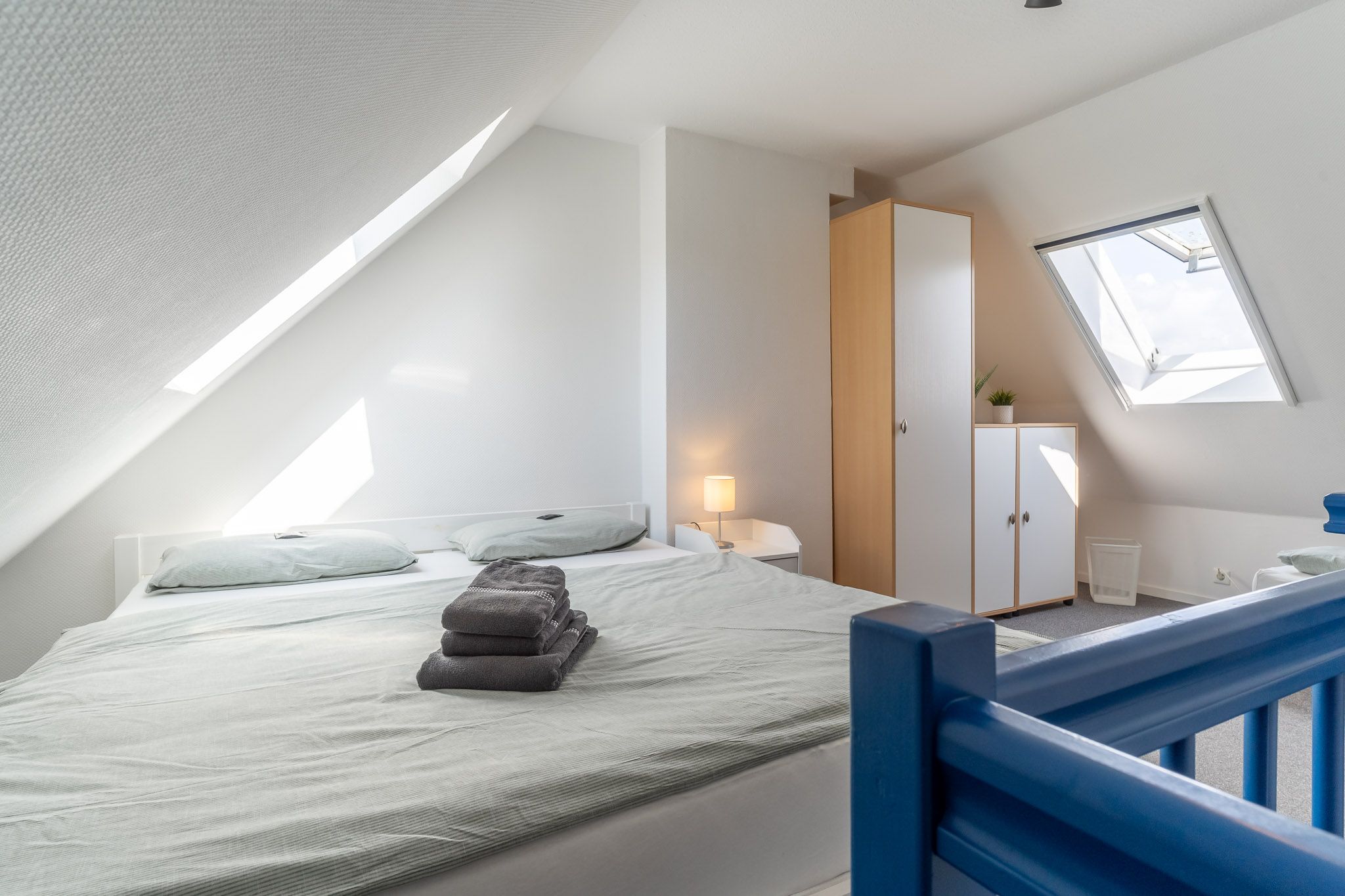 Eine Treppe im Wohnzimmer führt Sie zur offenen Schlafempore. Hier erwarten Sie ein komfortables Doppelbett und ein zusätzliches Einzelbett, die für einen erholsamen Schlaf sorgen. Diese Aufteilung macht die Wohnung ideal für Familien oder Gruppen, die gemeinsam die Schönheit der Nordsee erleben möchten.