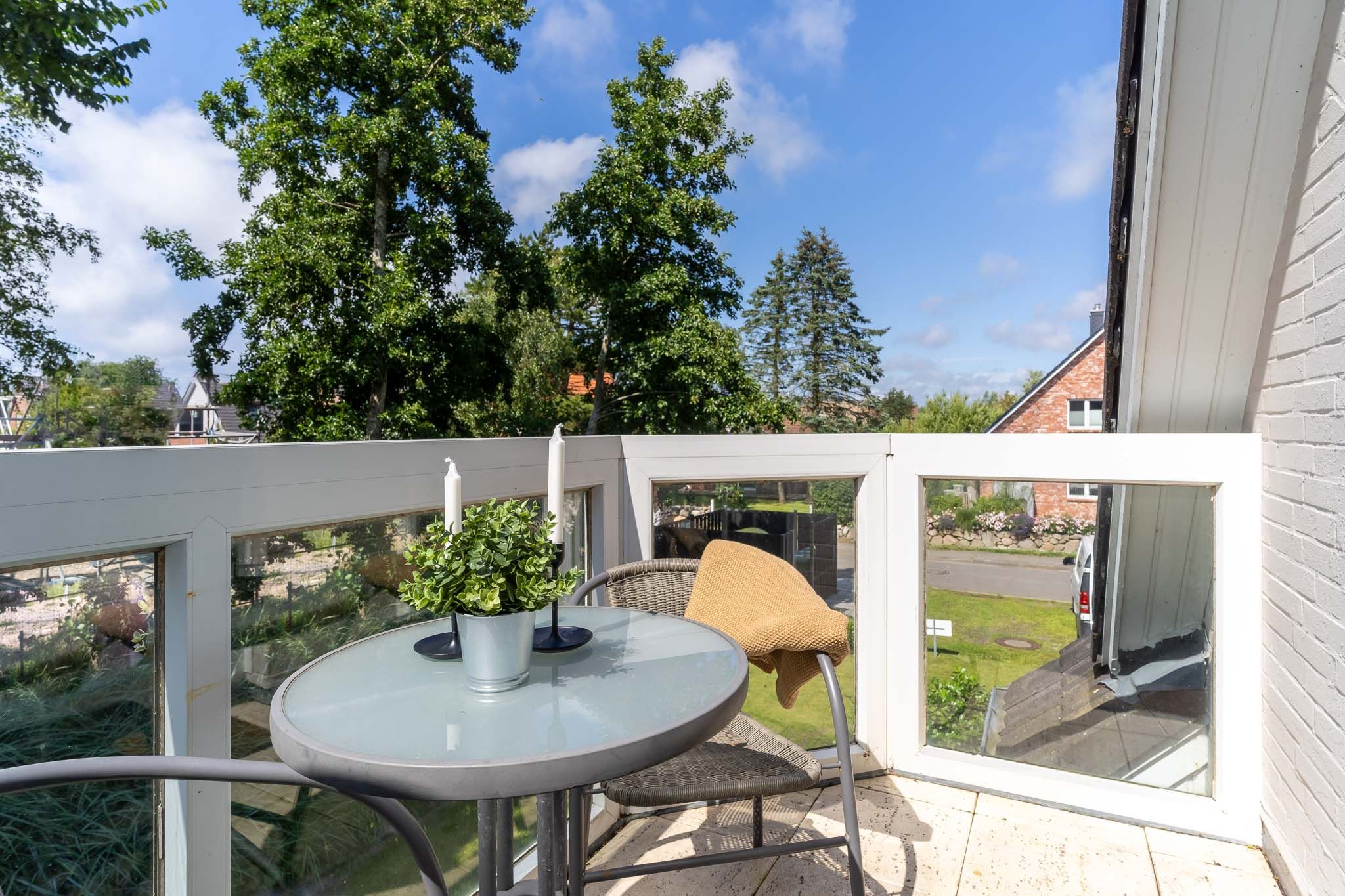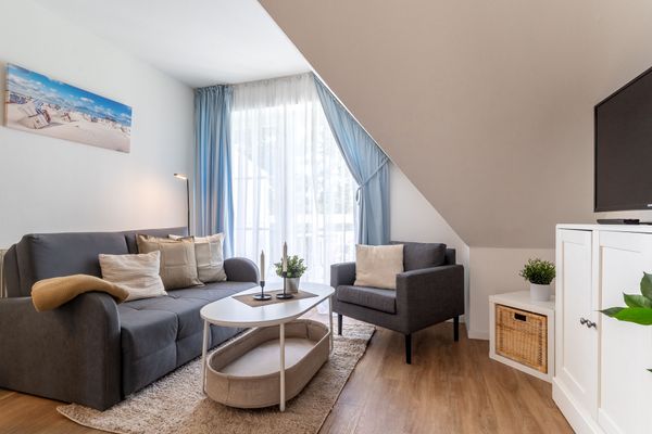 Der gemütliche Wohnbereich mit offener Küche befindet sich ebenfalls im ersten Stock. Hier finden Sie alles, was Sie für eine entspannte Selbstversorgung benötigen. Die Küchenzeile ist mit einer Spülmaschine, einem Backofen und allen wichtigen Küchenutensilien ausgestattet. Vom Wohnbereich aus gelangen Sie direkt auf den Balkon, wo Sie die frische Nordseeluft und den Blick ins Grüne genießen können.