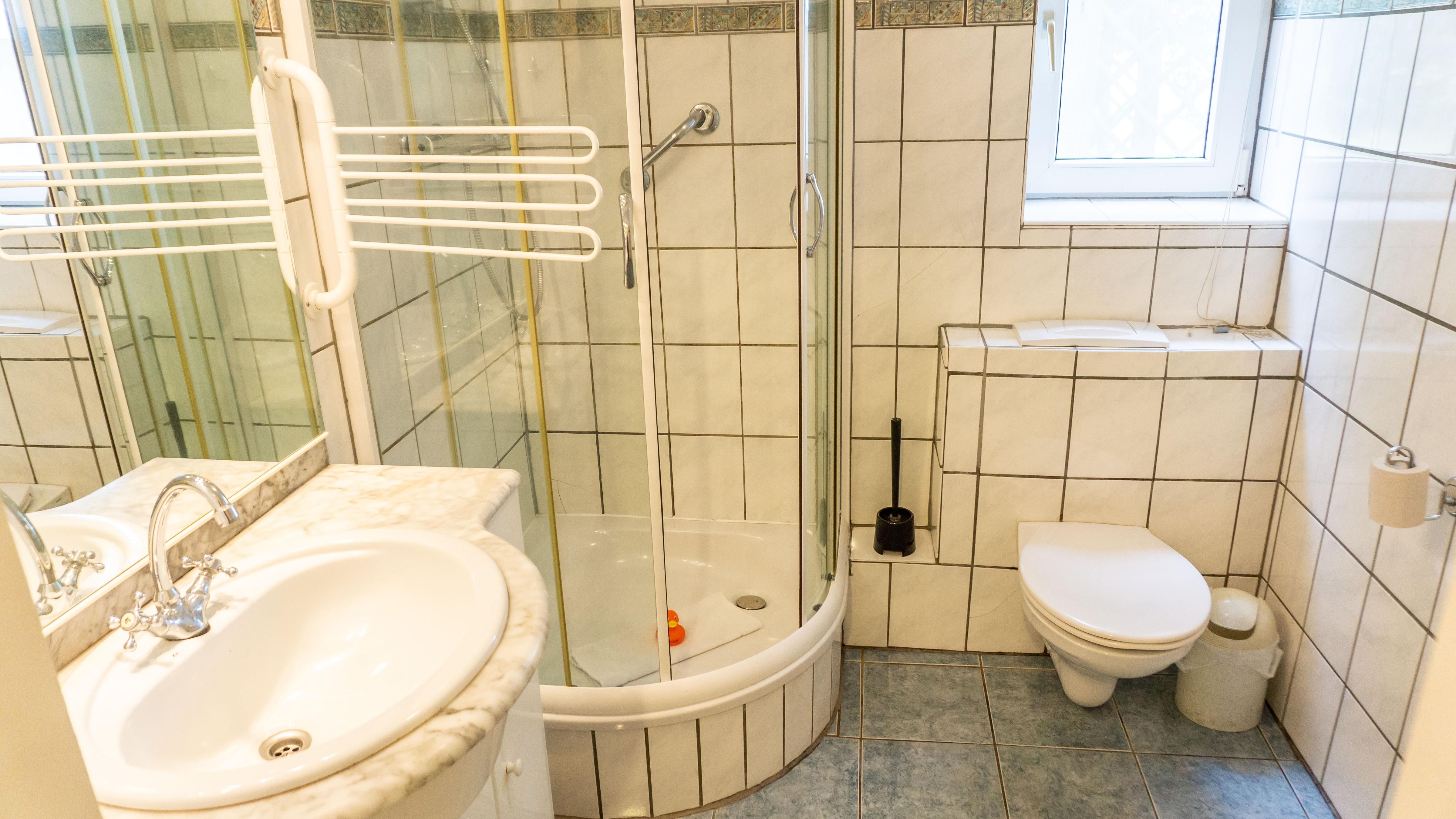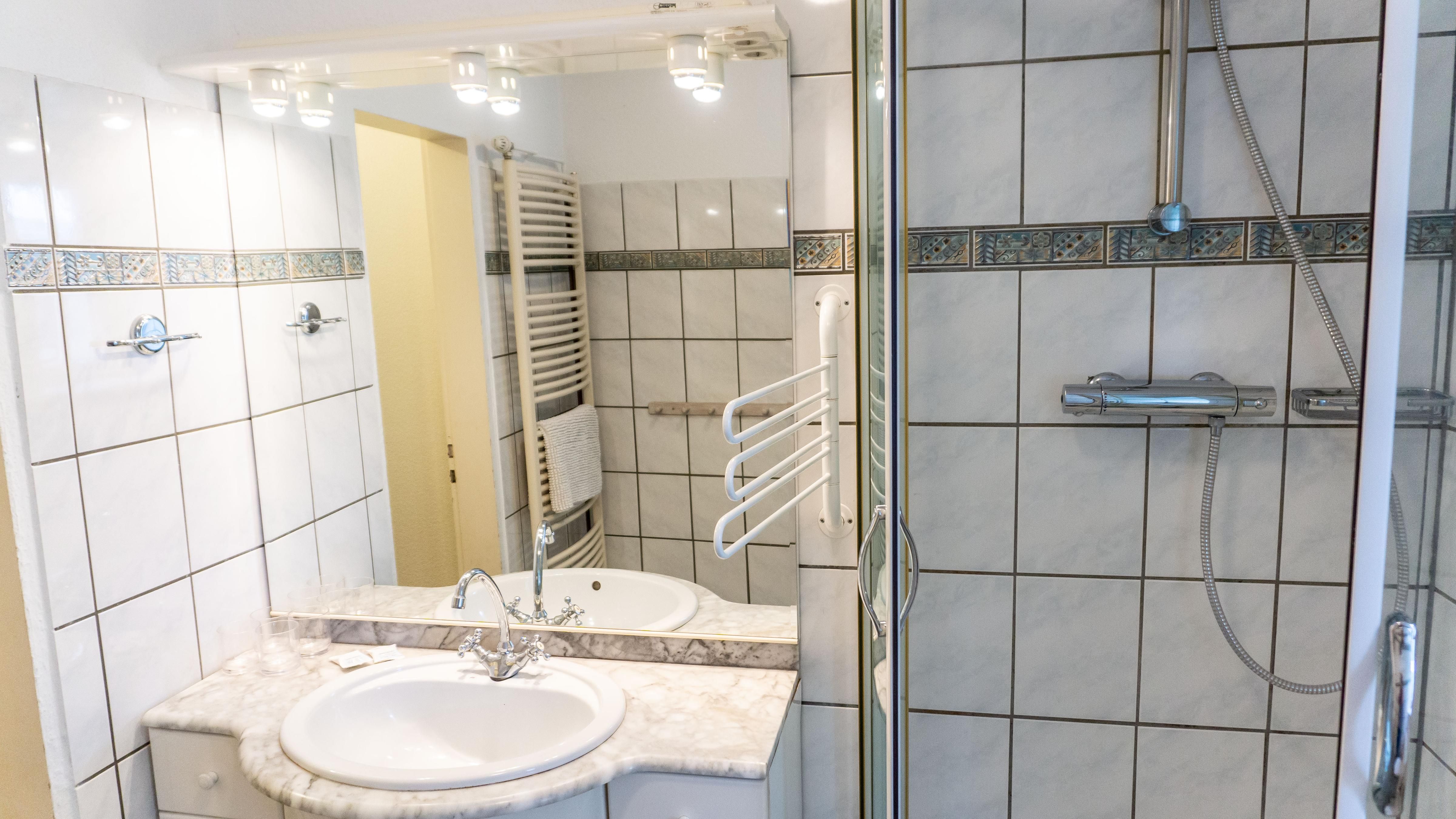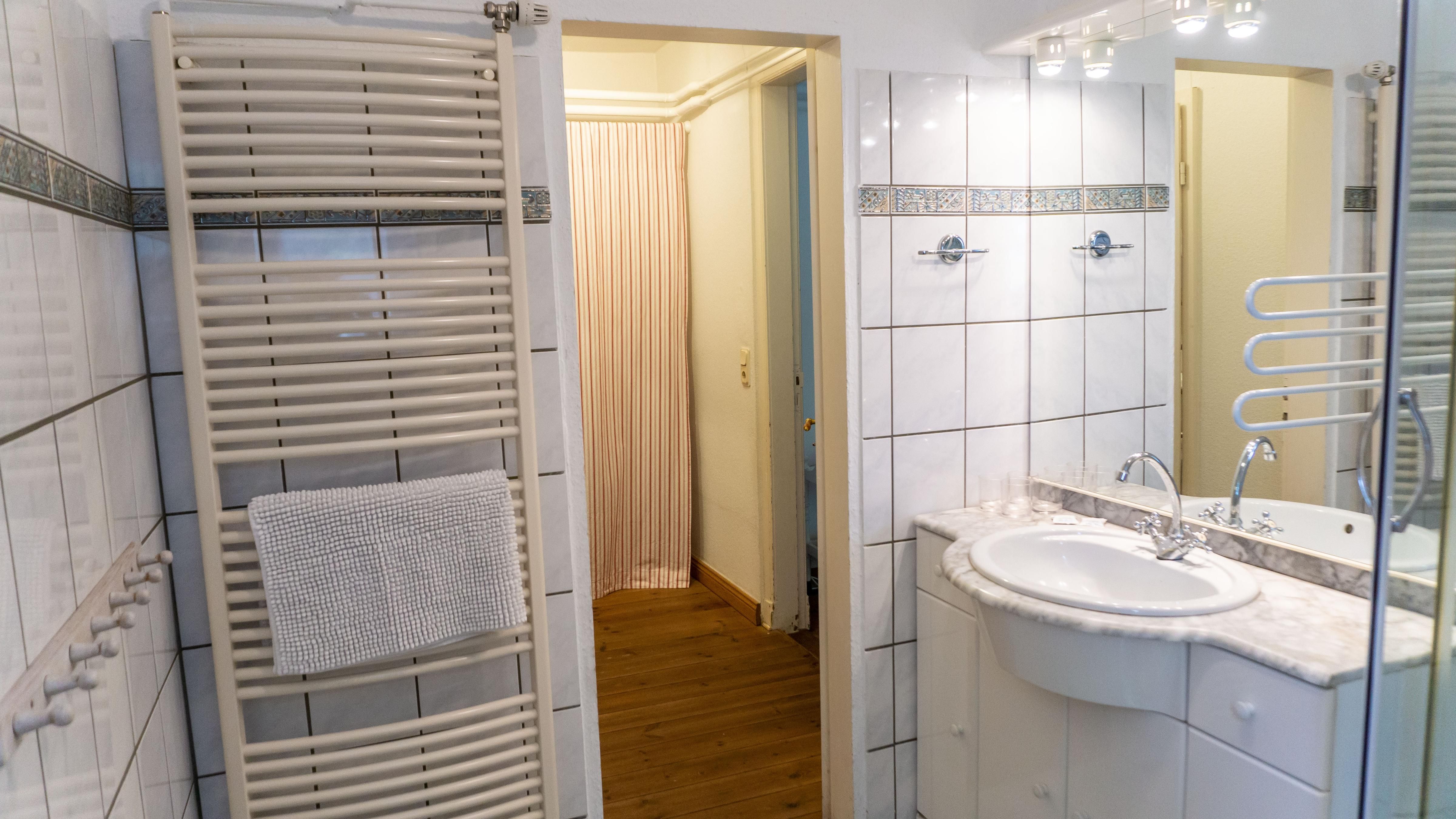 Das Badezimmer verfügt über eine Dusche, einem Waschbecken mit großem Spiegel sowie einem Haartrockner.